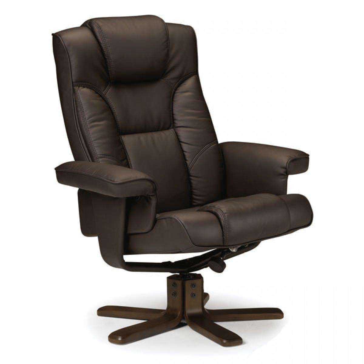 The Malmo reclining swivel chair and stool is upholstered in a soft touch faux leather with a walnut colour laminated base. This chairs offers the ultimate in complete sitting comfort and relaxation.