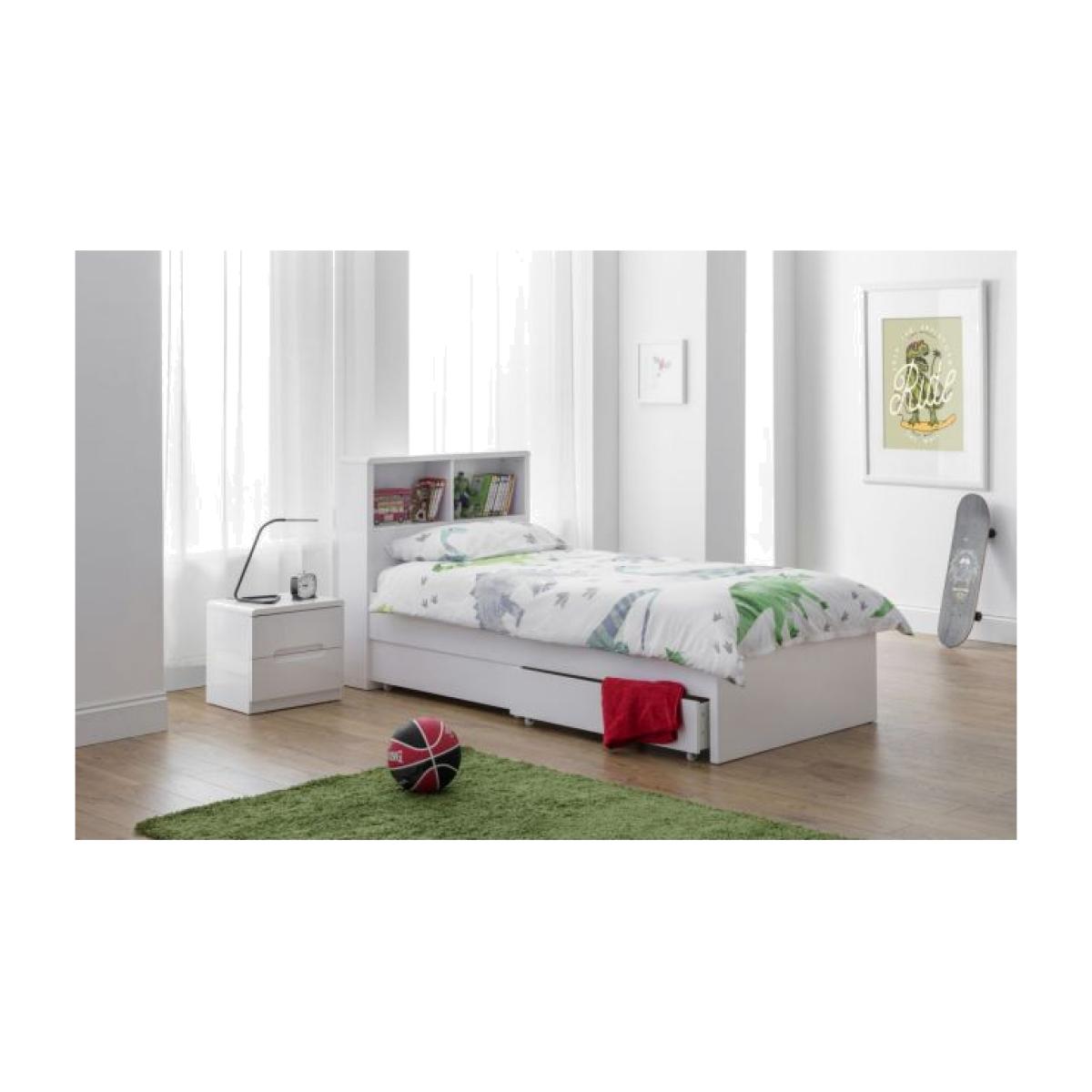 The Manhattan Bookcase Bed features two additional shelves within the high headboard, perfect for storing books and toys. Finished in a modern white high gloss, this bookcase bed offers a clean, crisp finish, enhancing the sense of space through light reflections. The perfect match for the Manhattan Underbed Drawers, creating a space saving solution (sold seperately). Part of the Julian Bowen Manhattan Bedroom Collection. Features: Dimensions: 98cm D x 214 cm W x 100cm H Finished in a High Gloss White Two additional shelves within a high headboard Clean, crisp finish adding a sense of space through light reflections Perfect match for the Manhattan Underbed Drawers to add additional storage Part of the Julian Bowen Manhattan Bedroom Collection Requires assembly