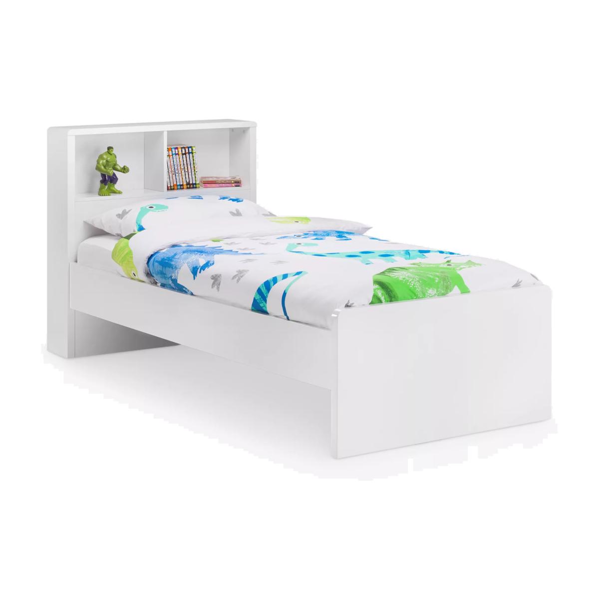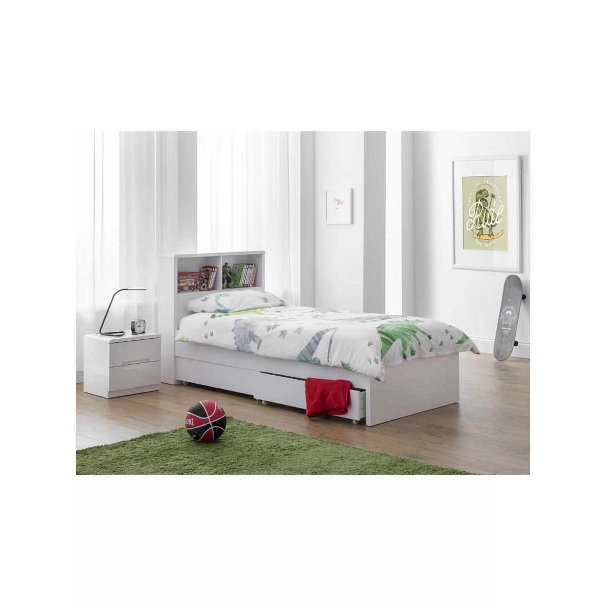 Make the most of their space with this Manhattan Bookcase Bed from Julian Bowen. The bed features two additional shelves within the high headboard, perfect for storing books and toys. Finished in a modern high gloss, this bookcase bed offers a clean, crisp finish, enhancing the sense of space through light reflections. It matches perfectly with the Manhattan Underbed Drawers, creating a space-saving solution (sold separately). Want to see it first? You may want to see and get a feel for the furniture before ordering. Pop into one of our shops to see the full range of colours and fabrics on offer. We'll be able to tell you where the range you'd like to view is on display.