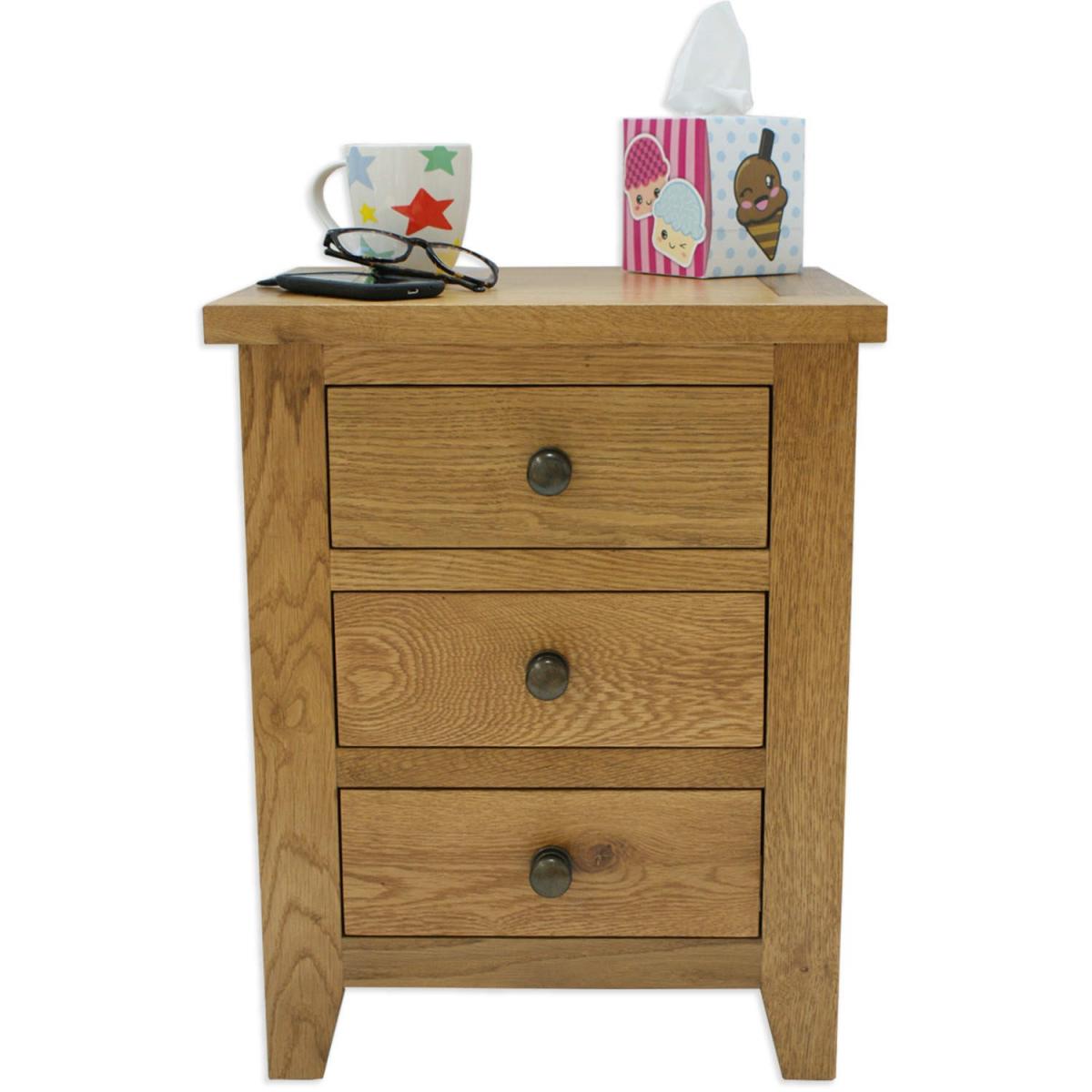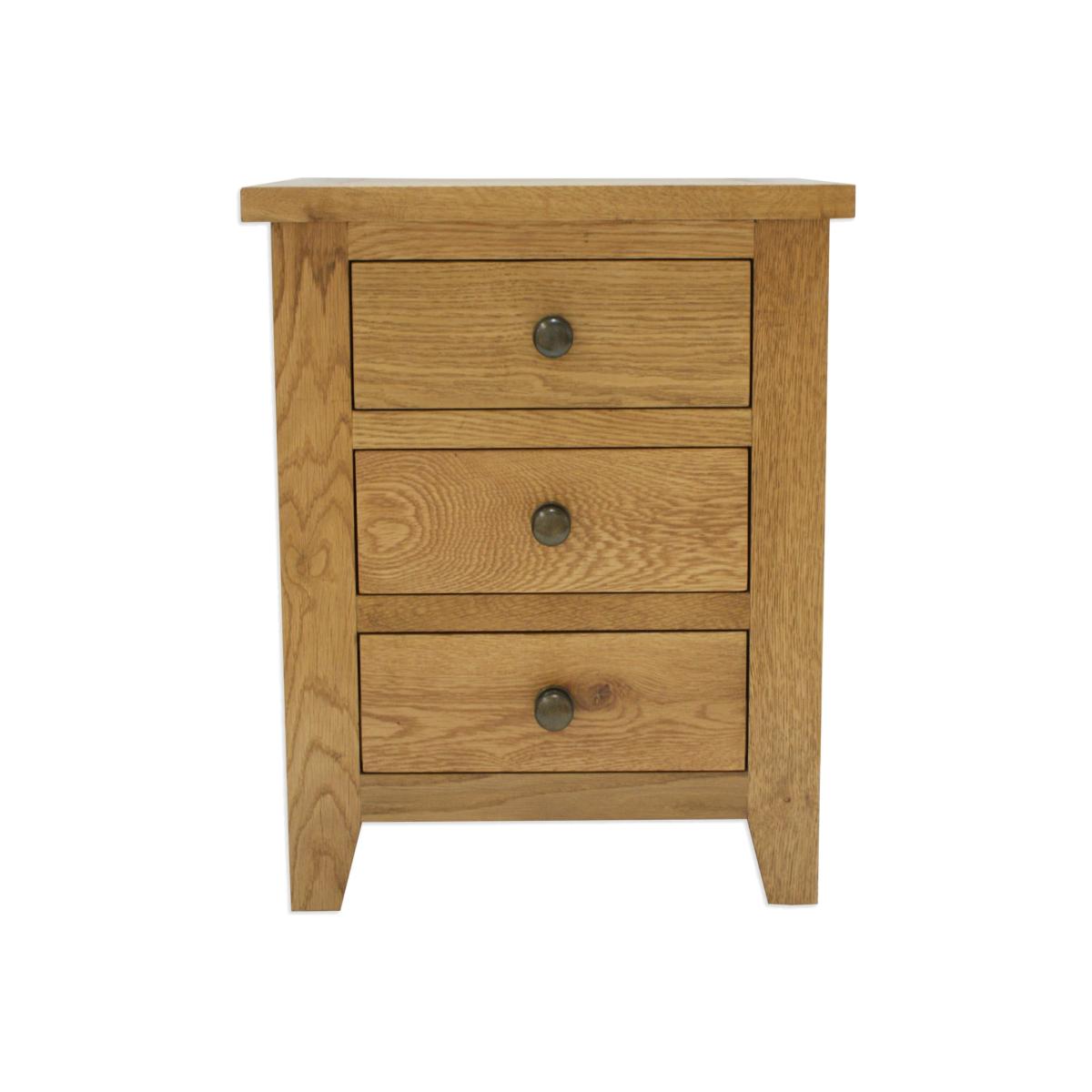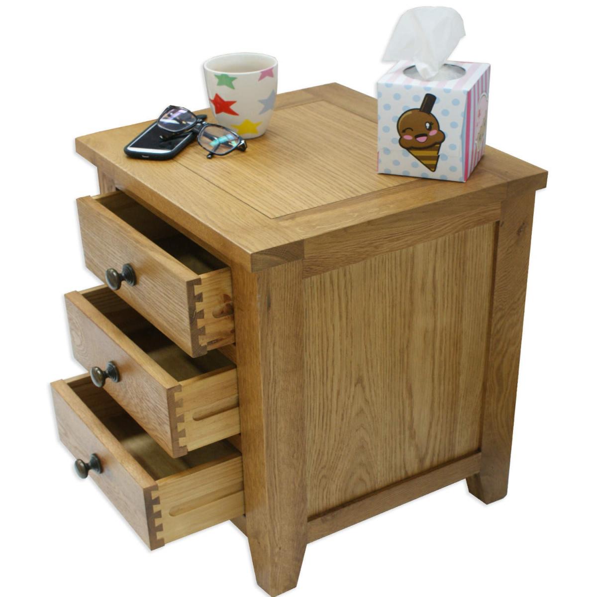 . Solid classic and fully assembled! The Marlborough bedside table has a timeless design which will compliment a variety of spacesDIMENSION S. W48 x D44 x H60 cm FEATURES. 3 Drawers on smooth wooden runners. Spacious square top perfect for essentials. Spacious surface top. Crafted from solid American oak. Beautiful waxed finish. Classic design Versatile style suiting many decors. Round metal handles. Coordinating items available HOW BIG AM I? The Marlborough bedside table has an ideal design to fit your bedside needs. With a compact shape the bedside table fits beautifully. The spacious square top is perfectly sized for all your necessities such as your lamp phone and the dreaded alarm clock. The drawers give you ample space to store away all your essentials such as your night time read. HOW DO I LOOK? Homely waxed oak combined with solid shapes creates a chunky timeless design. The solid American oak has a beautiful wood grain which is complimented by the simple metal handles. The Marlborough bedside table exudes effortless quality. WHAT AM I MADE OF? This bedside table from Julian Bowen is crafted from solid American white oak and finished with beautiful oak veneers. These high quality materials ensure that your item will stand the test of time. TREAT ME RIGHT Looking after your new item is very simple. To maintain a clean dust free finish simple wipe down with a dry duster and for tougher marks a damp cloth is ideal. Julian Bowen advise against the use of harsh chemicals and cleaners. HOW EASY AM I TO PUT TOGETHER? It really couldn't be any simpler! Just carefully open up your box and your bedside table is already assembled! The only thing you will need to do is fit the drawer handles all you will need is a screwdriver .