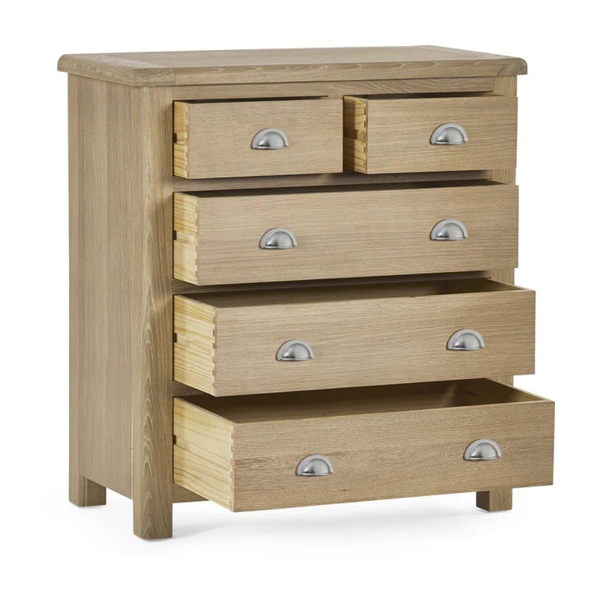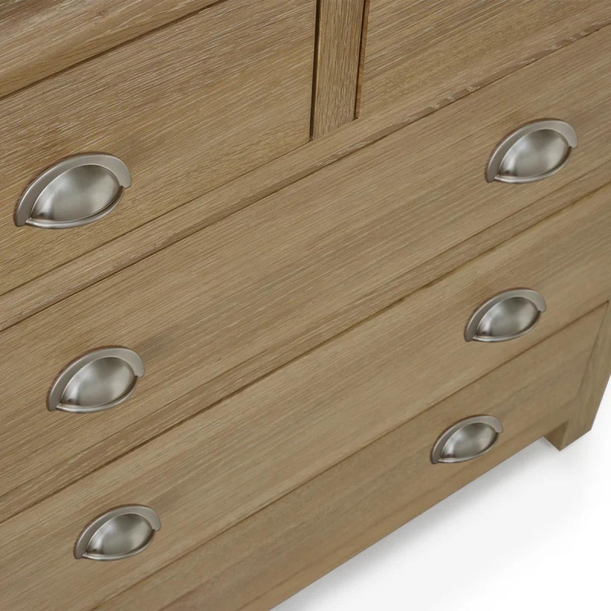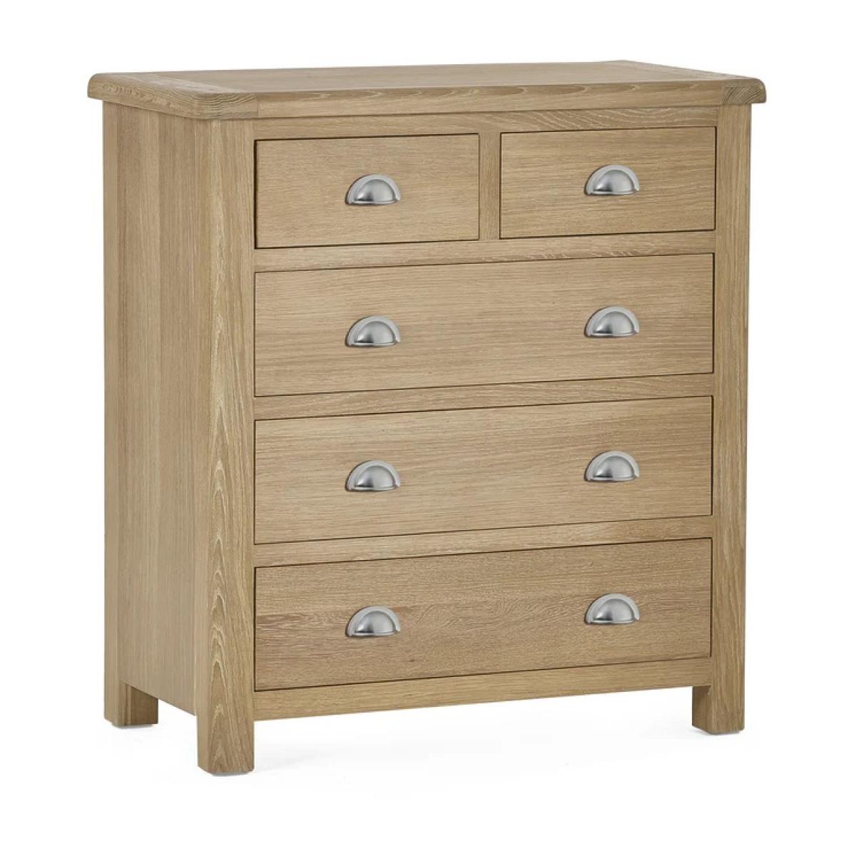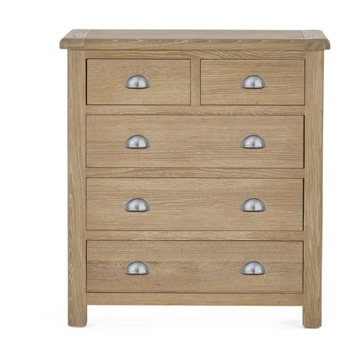 Blending timeless design with everyday practicality, the Julian Bowen Memphis 3 + 2 Drawer Chest in Limed Oak brings a warm, rustic charm to any bedroom. The soft limed oak finish creates a calming, natural look, while clean lines and brushed metal handles add a touch of contemporary elegance. With two smaller drawers above and three spacious drawers below, this versatile chest offers ample storage for clothing, accessories, or household essentials. Its sturdy construction and classic styling make it an ideal choice for both modern and traditional interiors. Part of the Memphis bedroom collection, this drawer chest is perfect for creating a cohesive and stylish storage solution throughout your space. Features: Warm limed oak finish for a rustic yet modern appeal Two smaller drawers and three larger drawers for flexible storage Brushed metal handles for a contemporary touch Durable build with smooth-glide drawer runners Fully Assembled Dimensions: Height 92cm Width 85cm Depth 44cm All screens vary in colour reproduction and whilst every effort has been made to display the colour as accurately as possible it is for guidance only.