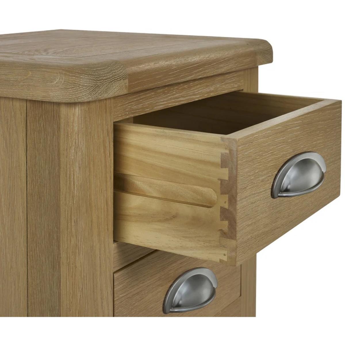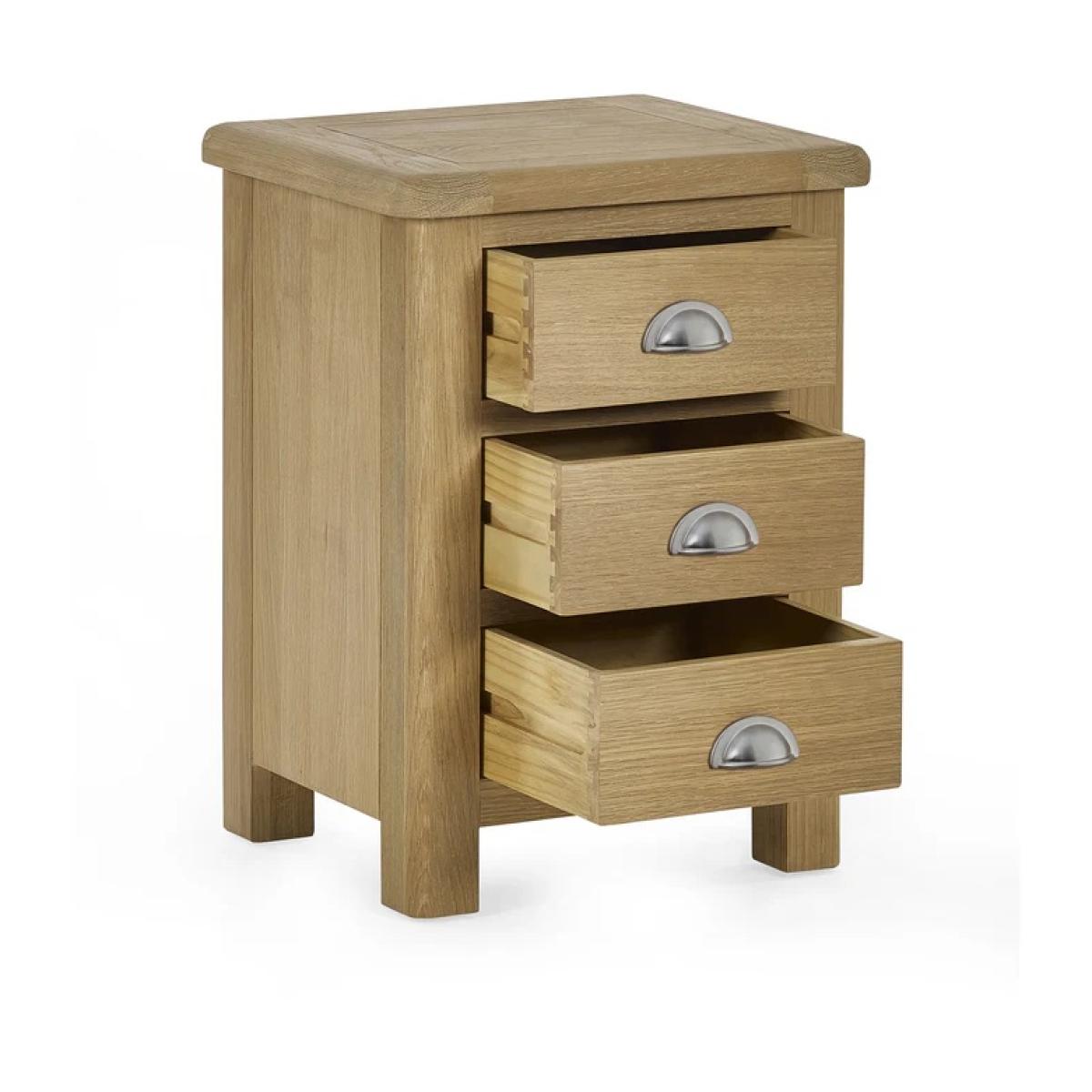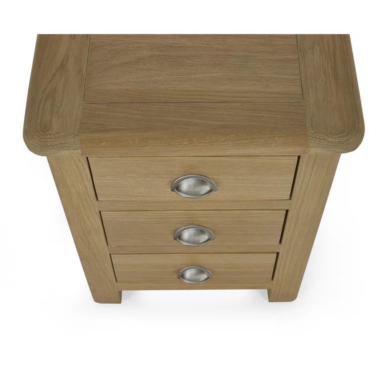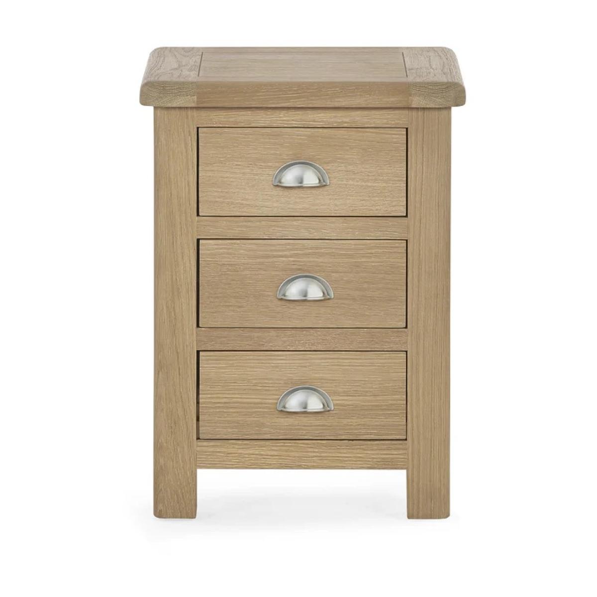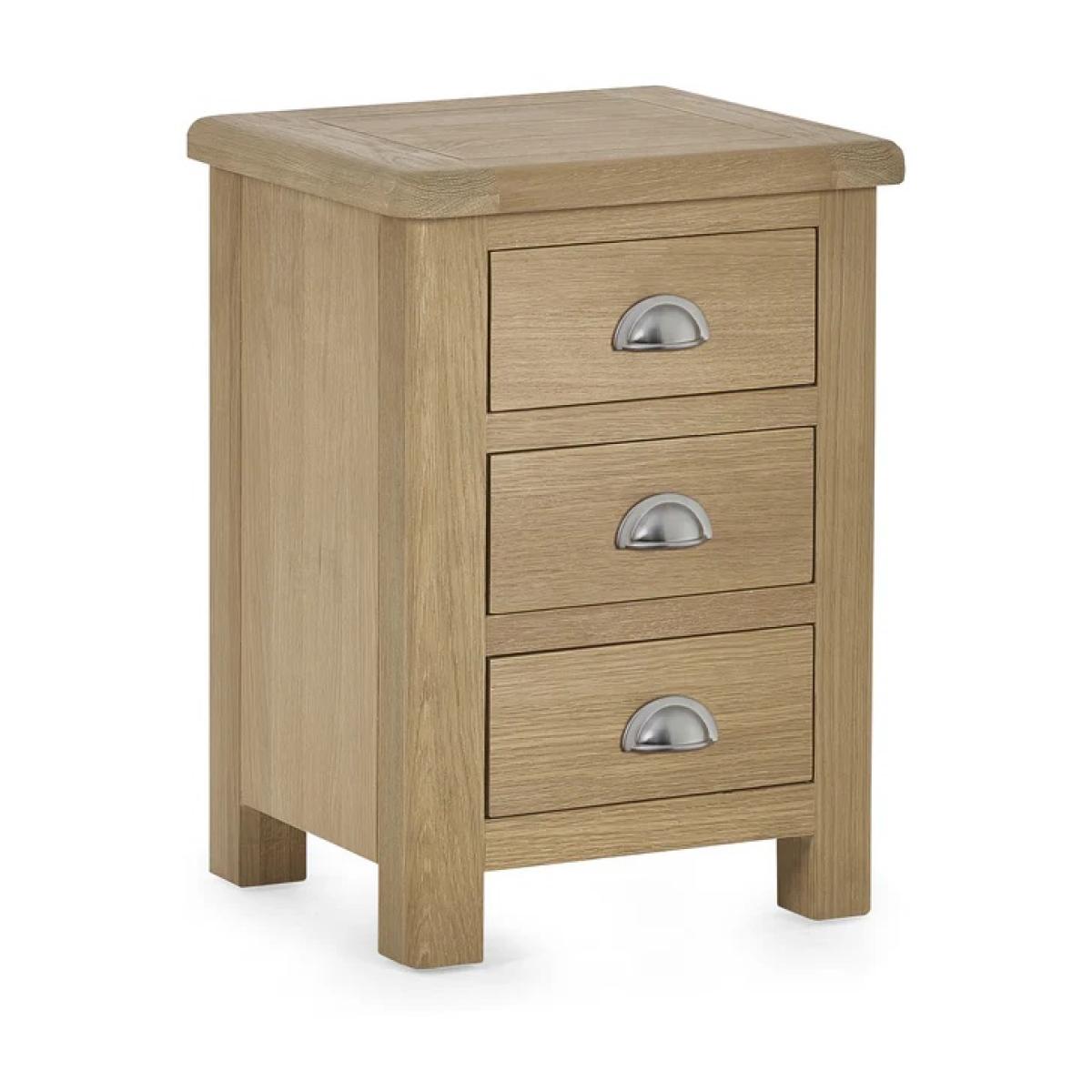 Add a touch of timeless elegance to your bedroom with the Julian Bowen Memphis 3 Drawer Bedside in Limed Oak. Crafted with a beautiful limed oak finish that highlights the natural grain of the wood, this bedside unit effortlessly combines rustic charm with contemporary design. Ideal for keeping your nighttime essentials close at hand, it features three smooth-gliding drawers with sleek metal handles, offering practical storage without compromising on style. The compact footprint makes it perfect for smaller spaces, while its classic look complements a wide range of bedroom décors. Built with quality and durability in mind, the Memphis bedside table is the perfect finishing touch for a stylish, well-organized bedroom. Features: Attractive limed oak finish with a natural, rustic touch Three pull-out storage drawers Brushed metal handles for a sleek, modern detail Ideal for both classic and contemporary bedroom settings Fully Assembled Dimensions: Height 61cm Width 38cm Depth 45cm All screens vary in colour reproduction and whilst every effort has been made to display the colour as accurately as possible it is for guidance only.