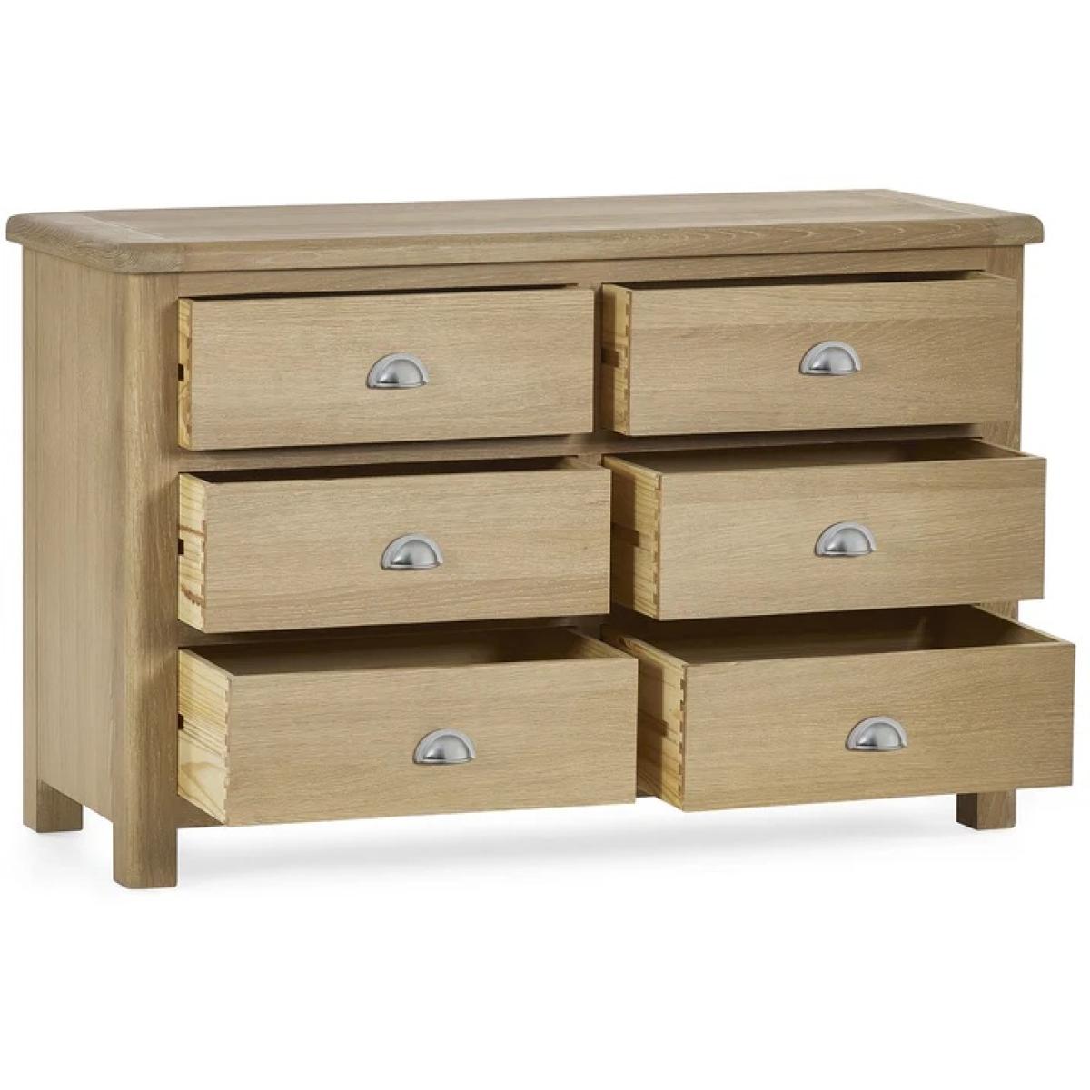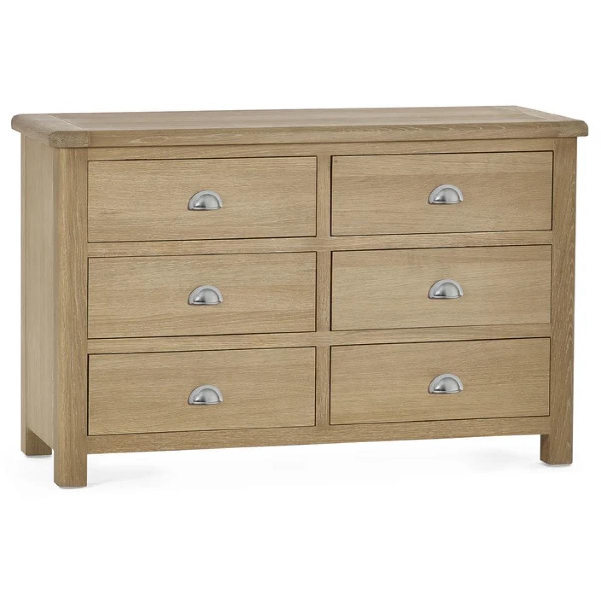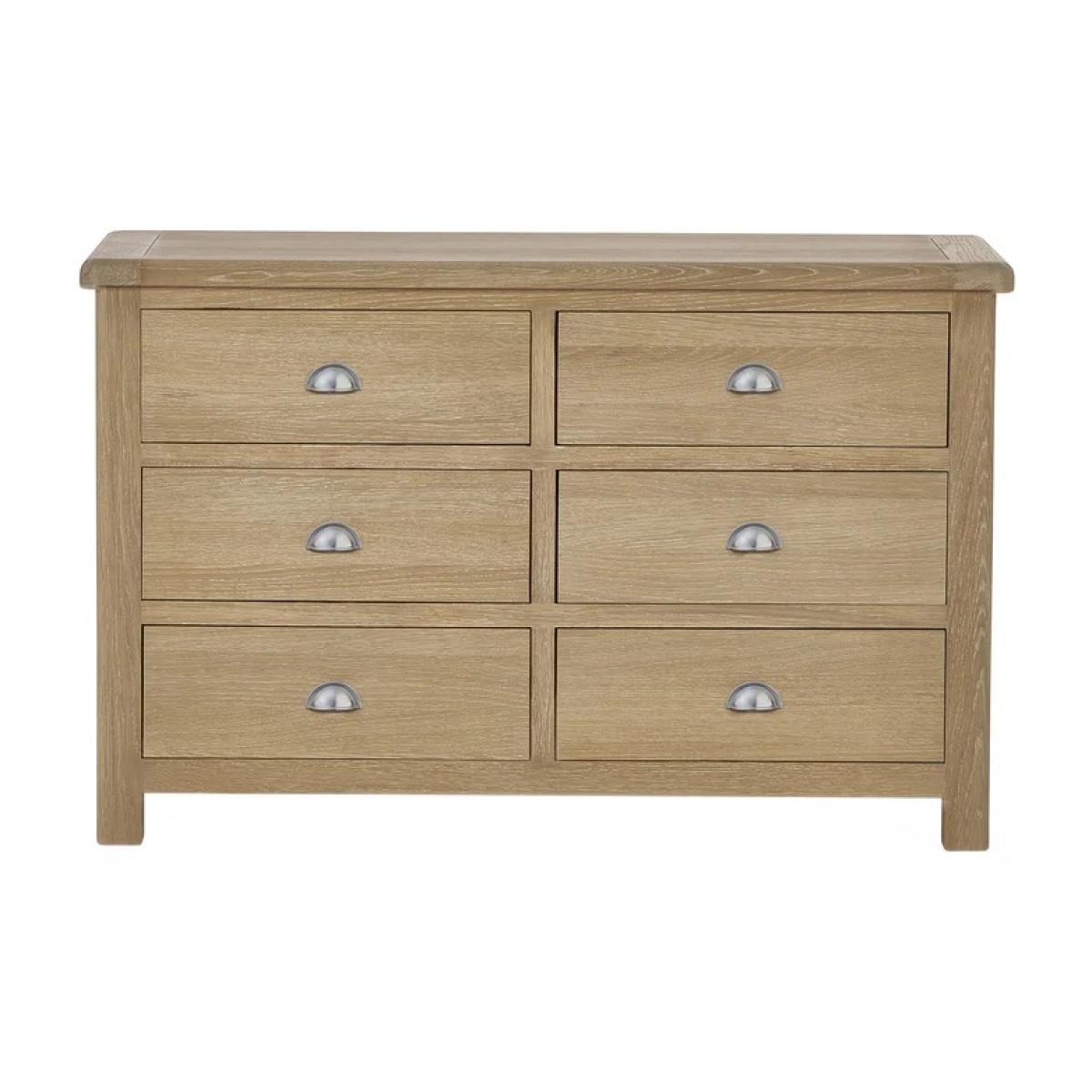 Spacious, stylish, and beautifully crafted, the Julian Bowen Memphis 6 Drawer Wide Chest in Limed Oak is a perfect addition to any contemporary or classic bedroom. With its soft limed oak finish and clean lines, this chest brings a sense of warmth and natural charm to your space. Featuring six wide drawers, it offers ample storage for clothing, linens, or household essentials—making it both practical and visually appealing. The smooth metal runners ensure effortless operation, while the brushed metal handles add a refined modern touch. Whether you're upgrading your bedroom storage or completing the Memphis collection, this wide chest combines durable craftsmanship with timeless design for a truly versatile piece. Features: Warm limed oak finish for a rustic yet modern appeal Six generous pull-out storage drawers Brushed metal handles for a contemporary touch Durable build with smooth-glide drawer runners Fully Assembled Dimensions: Height 76cm Width 120cm Depth 44cm All screens vary in colour reproduction and whilst every effort has been made to display the colour as accurately as possible it is for guidance only.