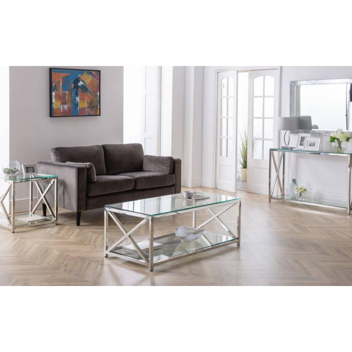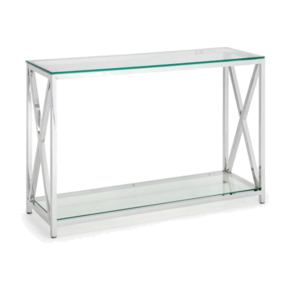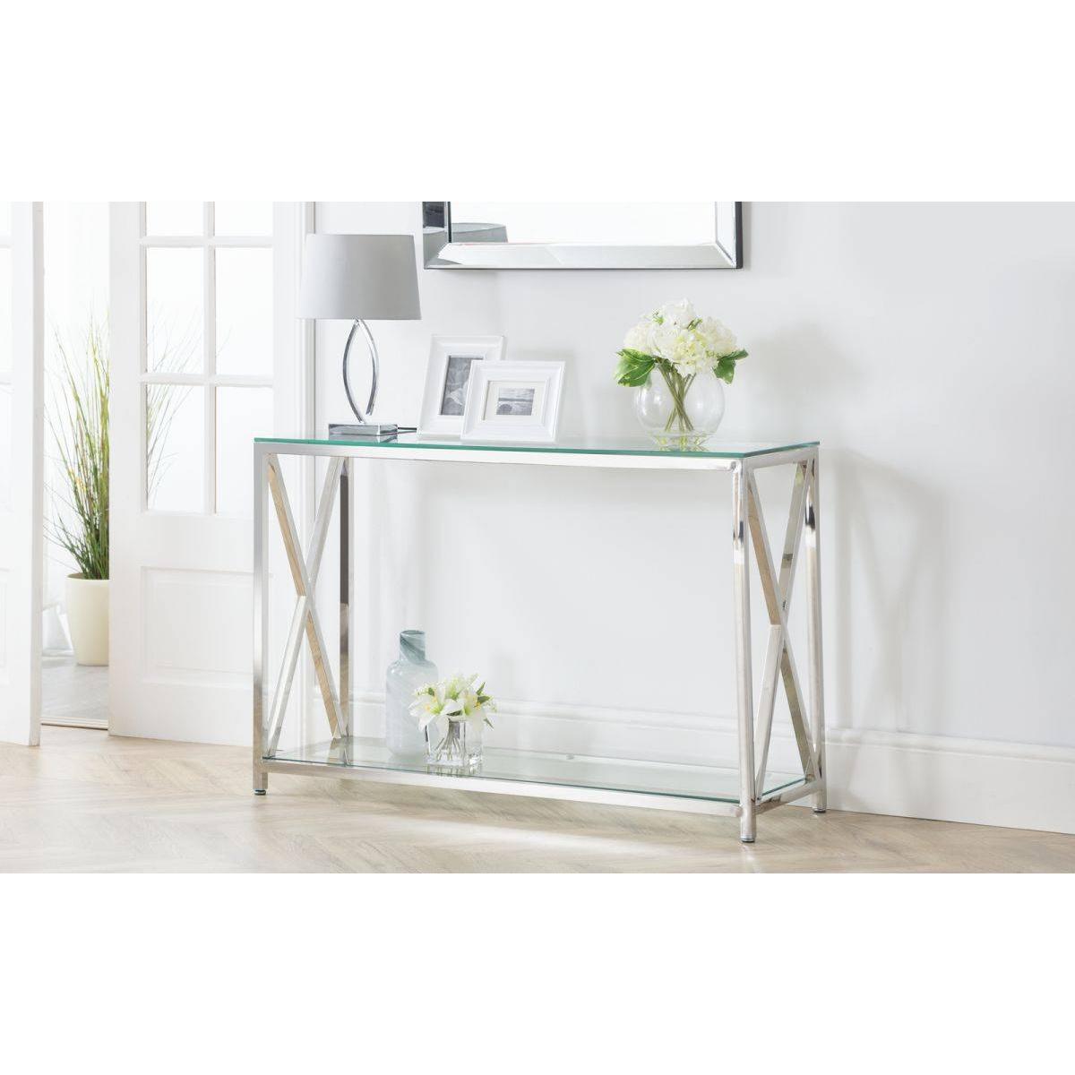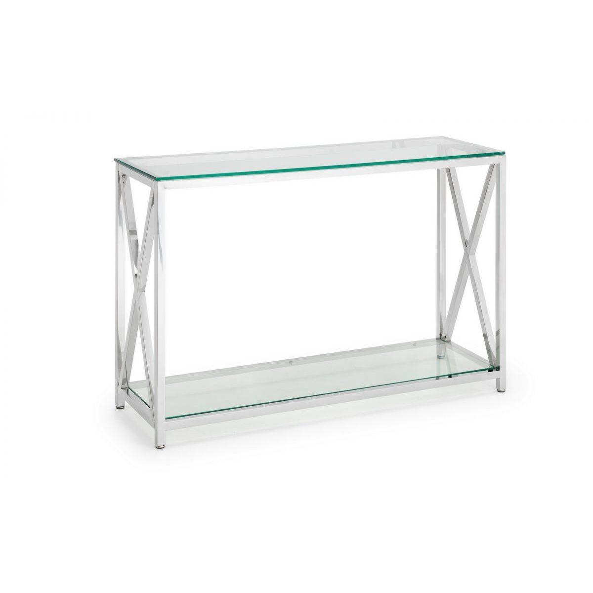 The lavish Miami occasional collection will add a touch of class and luxury to any home. Taking inspiration from the Art Deco period, the Miami features a striking cross frame design. Crafted from a chrome frame and tempered glass, this console table provides a shelf underneath for additional storage. Dimensions: 40cm (D) x 120cm (W) x 75cm (H)Assembly required.