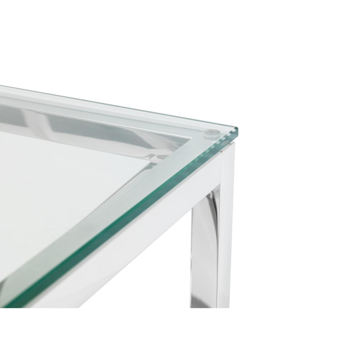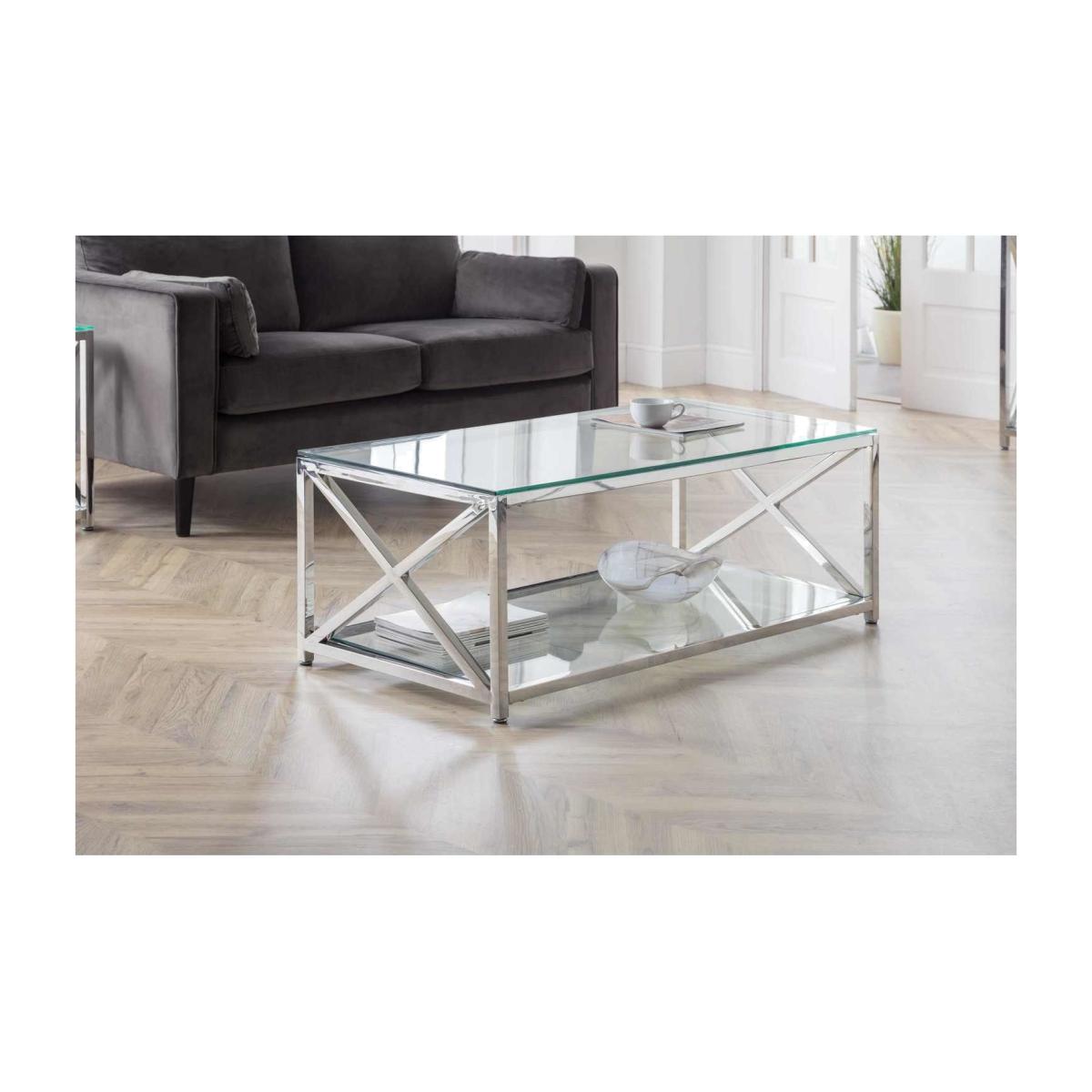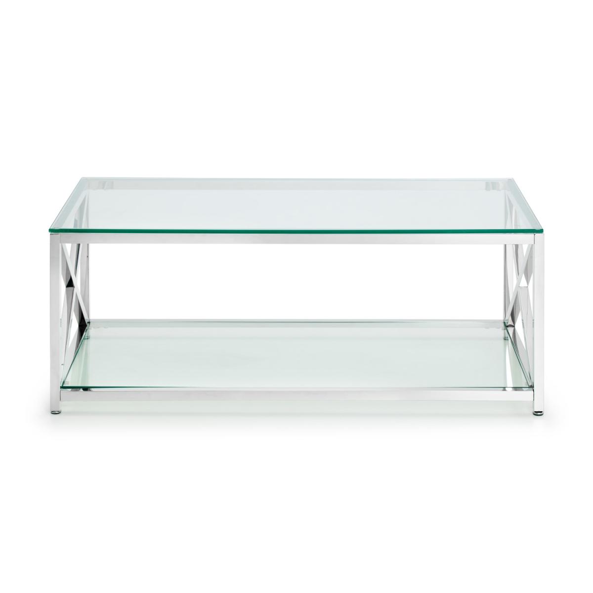 Dimensions H45 x W120 x D60 cm. The Miami Coffee Table features a striking cross frame design and provides an additional shelf underneath for extra storage. Crafted from a chrome frame and tempered glass this Art Deco inspired piece will add a touch of class and luxury to every home. Features. Inspiration from the Art Deco Period Striking cross frame design. Crafted from tempered glass and; chrome. Provides an additional shelf underneath for extra storage Assembly required..
