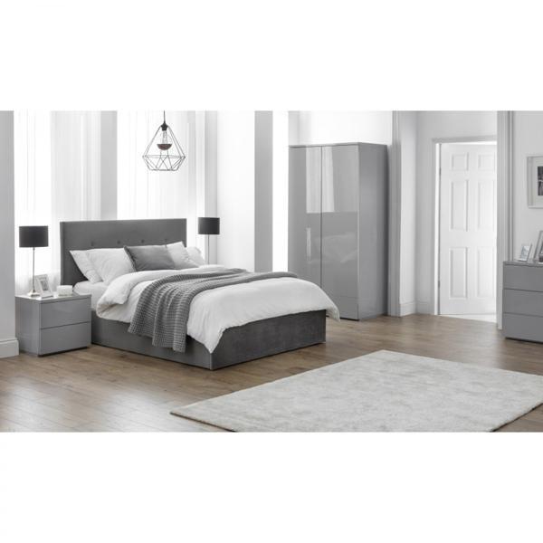 The Monaco Bedroom Collection brings a fresh, modern design to any bedroom. Finished in a grey high gloss, this 2 drawer bedside reflects light, enhancing the look of space. Featuring clean lines, to create a clean contemporary image. Part of the Julian Bowen Monaco Bedroom Collection. H: 117 W: 80 D: 45 cm.
