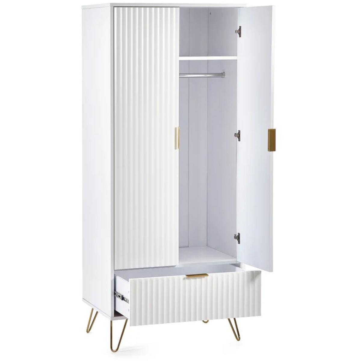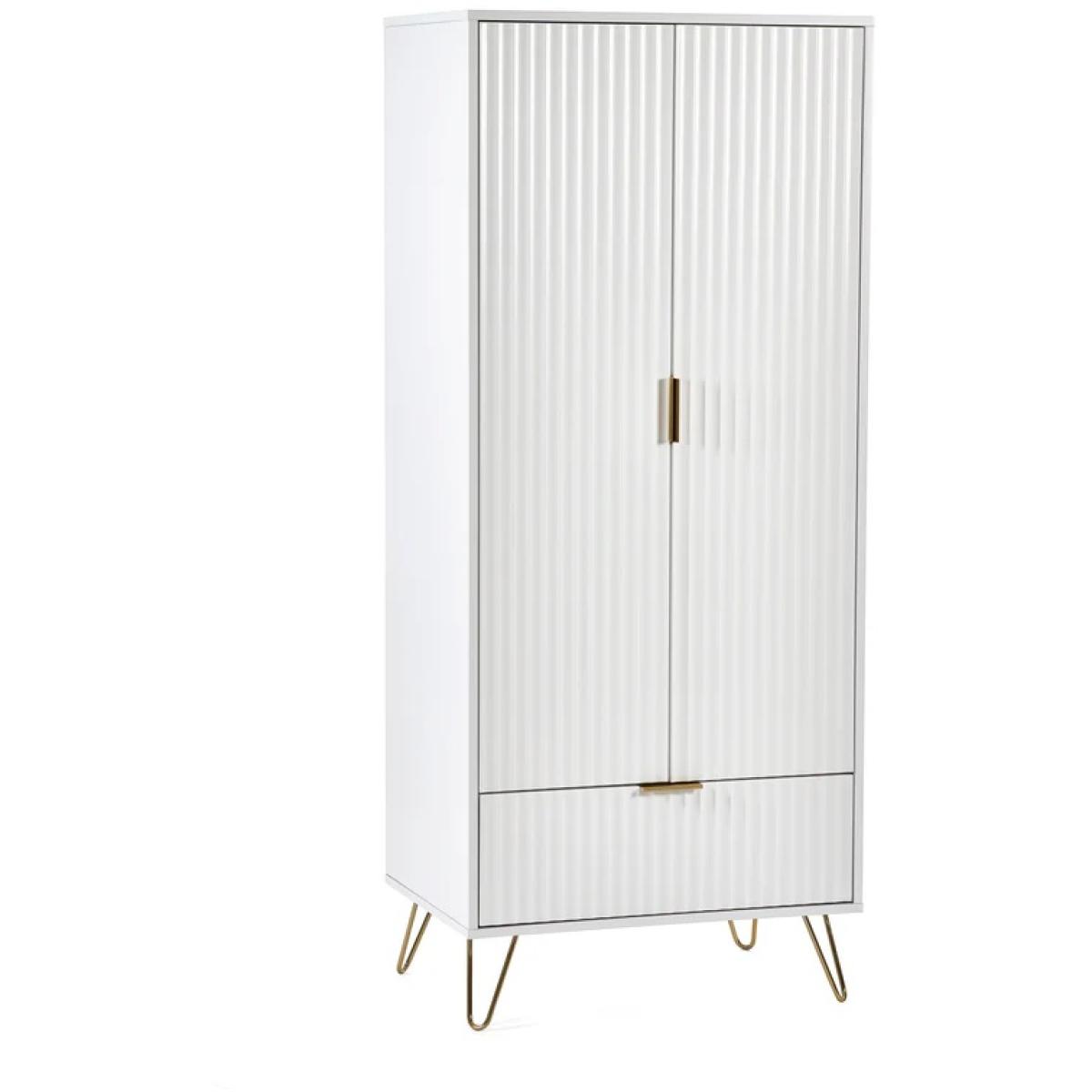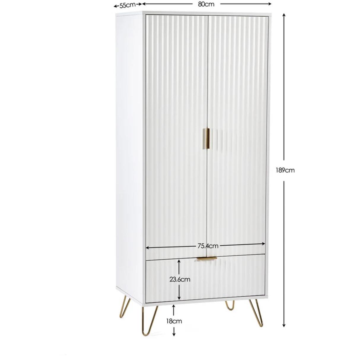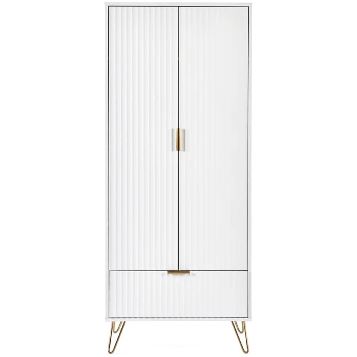 Sleek, modern, and effortlessly functional, the Julian Bowen Murano 2 Door 1 Drawer Wardrobe in Matt White is the perfect addition to any contemporary bedroom. With its clean lines and smooth matt finish, this wardrobe brings a fresh, minimalist touch to your space while offering practical storage solutions. Behind the two soft-close doors, you'll find a full-length hanging rail—ideal for keeping clothes neatly organised and wrinkle-free. Below, a spacious drawer provides additional room for folded garments, accessories, or everyday essentials. Finished with subtle recessed handles and soft-close mechanisms, the Murano wardrobe offers both style and seamless usability. Designed to pair beautifully with other pieces from the Murano collection, this wardrobe is a stylish and space-smart choice for modern living. Features: Sculpted scalloped fronts Combination of full-height hanging space and a generous sized drawer Brushed gold accents High-end design Bedroom and living ranges available Home Assembly Required Dimensions: Height 189cm Width 80cm Depth 55cm All screens vary in colour reproduction and whilst every effort has been made to display the colour as accurately as possible it is for guidance only.