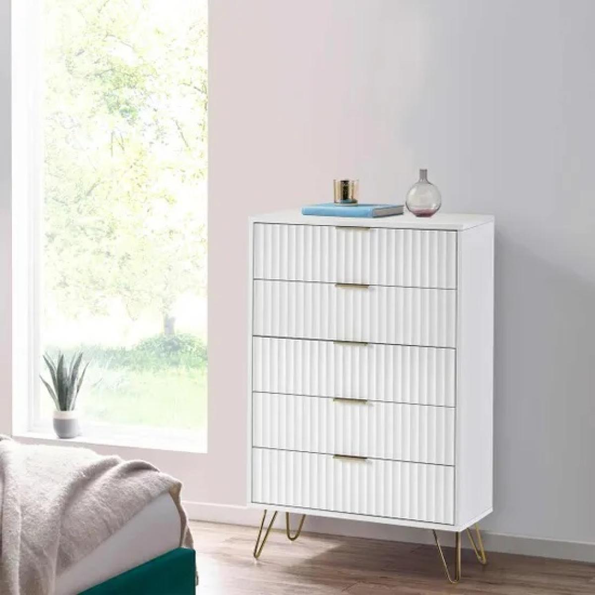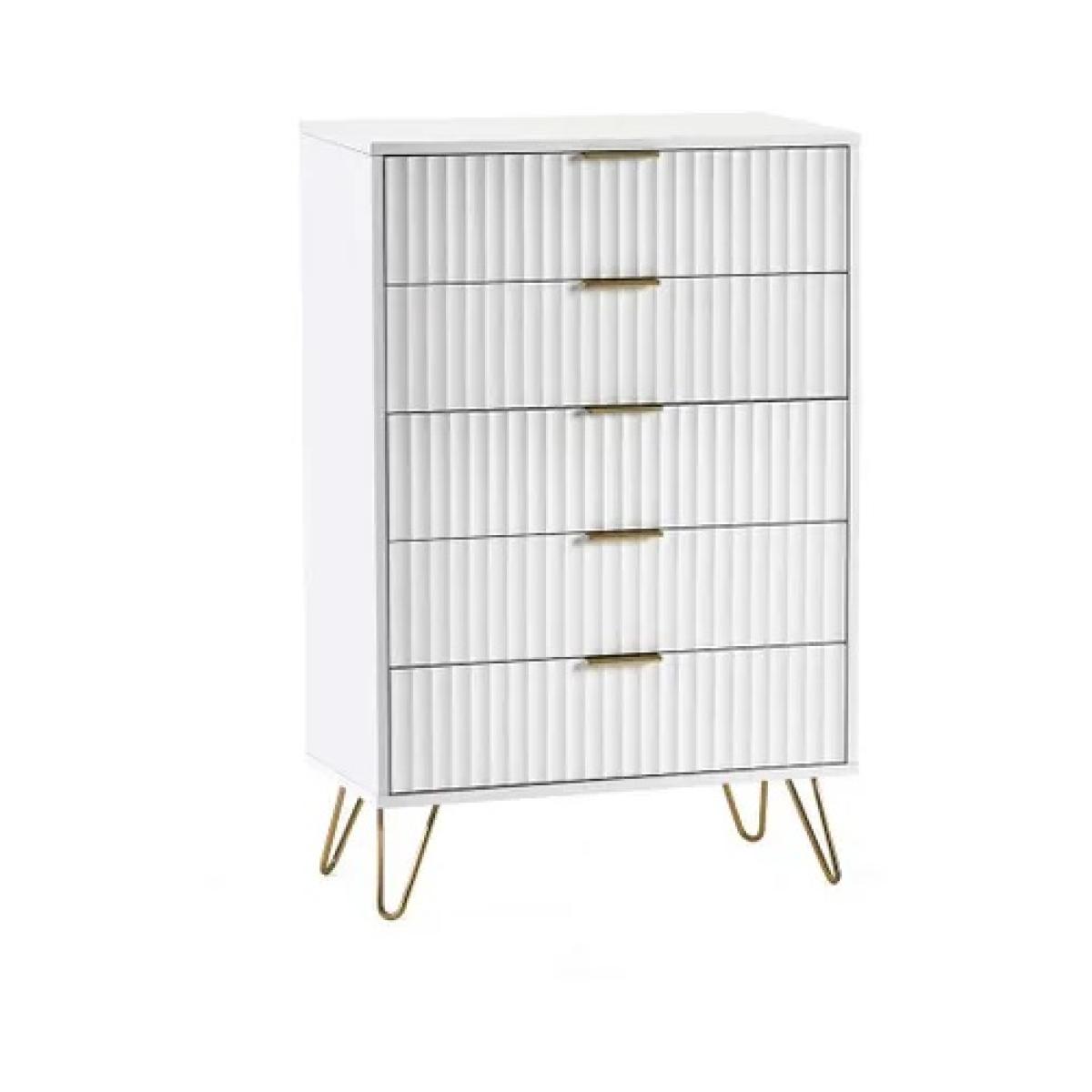 Sleek, spacious, and effortlessly modern, the Julian Bowen Murano 5 Drawer Chest in Matt White offers the perfect blend of minimalist style and practical storage. Finished in a crisp matt white lacquer, this tall chest adds a fresh, contemporary feel to any bedroom setting. With five generously sized soft-close drawers, the Murano chest provides ample space for organising clothing, accessories, and everyday essentials—all while maintaining a clutter-free look. The clean, handle-less design enhances its streamlined silhouette, making it an ideal choice for modern or Scandinavian-inspired interiors. Built to last with smooth gliding mechanisms and a sturdy frame, the Murano 5 Drawer Chest is both functional and stylish—a standout piece for any home. Features: Sculpted scalloped fronts 5 spacious drawers Brushed gold accents High-end design Bedroom and living ranges available Home Assembly Required Dimensions: Height 119cm Width 80cm Depth 40cm All screens vary in colour reproduction and whilst every effort has been made to display the colour as accurately as possible it is for guidance only.