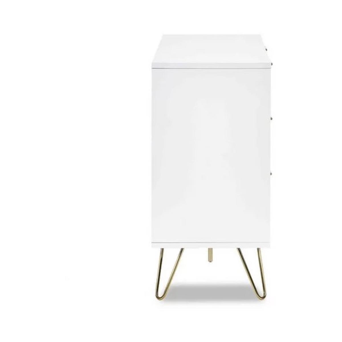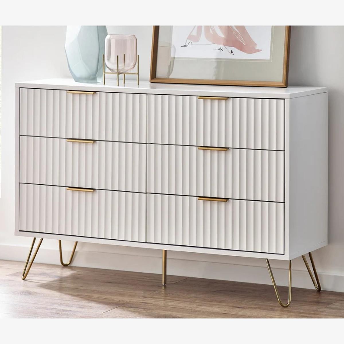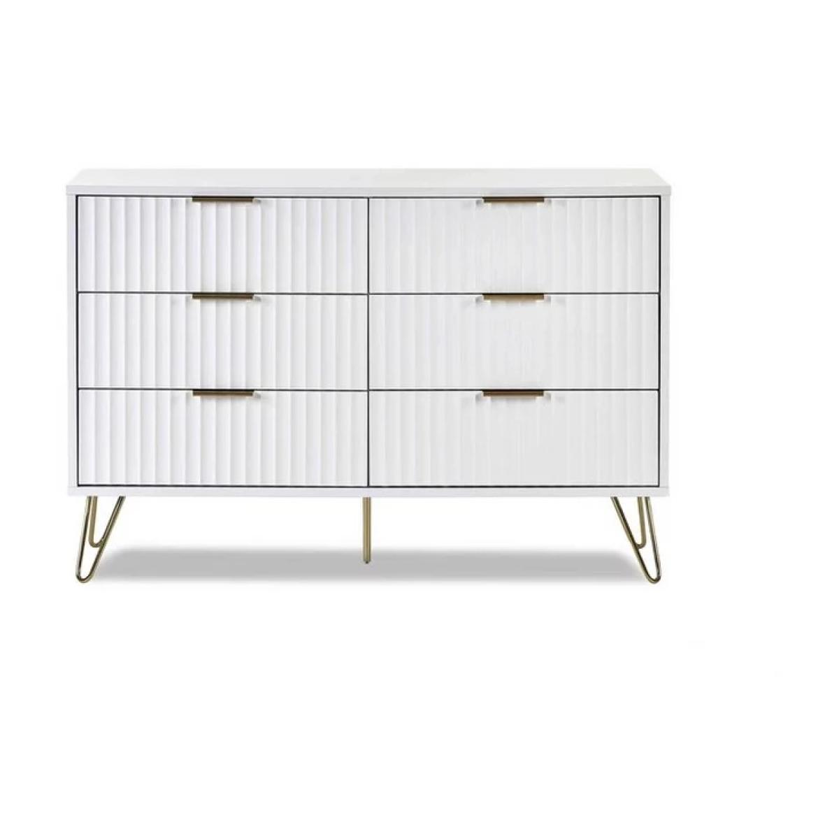 Sleek, streamlined, and effortlessly modern, the Julian Bowen Murano 6 Drawer Chest in matt white brings both style and practicality to contemporary interiors. With a minimalist design and generous storage space, this chest is perfect for keeping your bedroom tidy while maintaining a clean and uncluttered aesthetic. Featuring six spacious drawers, the Murano chest provides ample room for clothing, linens, and everyday essentials. The drawers glide smoothly on quality metal runners, combining functionality with long-lasting performance. Its crisp matt white finish complements a wide range of décor styles, from modern Scandi-inspired spaces to classic neutral schemes. Recessed drawer handles contribute to the chest’s clean lines and understated elegance, making it a versatile addition to any home. Whether used on its own or paired with other items from the Murano Range, this 6 drawer chest offers practical storage with a refined, contemporary edge. Features: Sculpted scalloped fronts 6 drawers Brushed gold accents High-end design Bedroom and living ranges available Home Assembly Required Dimensions: Height 80cm Width 120cm Depth 40cm All screens vary in colour reproduction and whilst every effort has been made to display the colour as accurately as possible it is for guidance only.