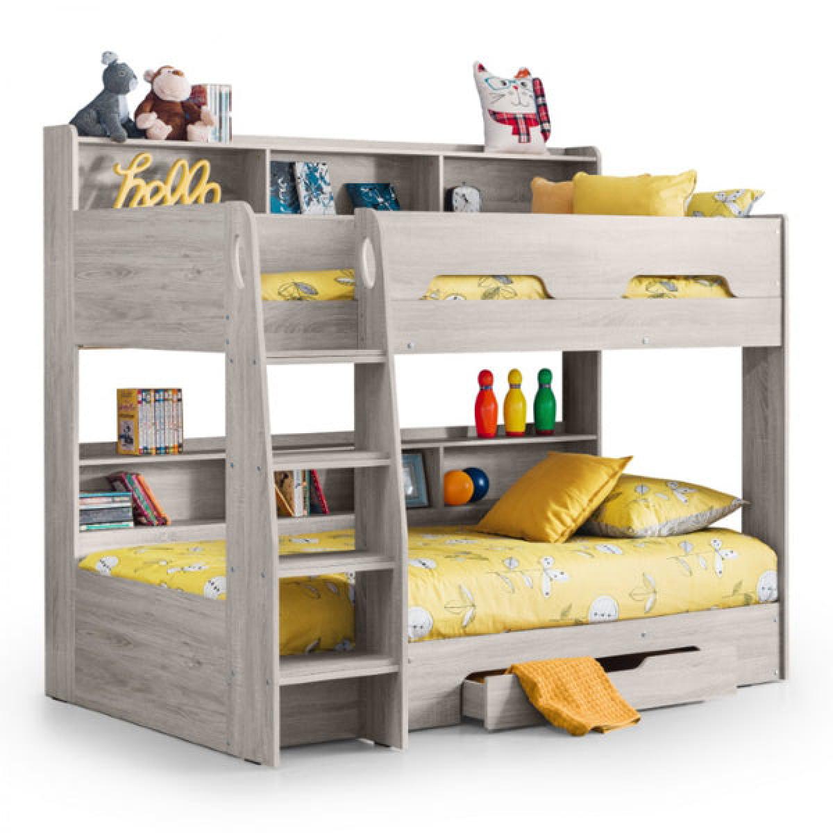 Orion is a contemporary, innovative bunk bed presented in an on-trend Sonoma Oak finish. Orion combines style with great practicality and includes a handy pull-out drawer and extensive shelving for kids' books and toys, with a subtle raised lip to prevent anything slipping down the back. The lower bunk is positioned close to the ground, making it ideal for smaller children, while the robust ladder features attractive cut-out handles and optional glow-in-the dark strips on the steps for added safety. Due to Bunk Bed Safety Regulations, only the Premier or Platinum Mattresses are suitable for use on the upper bunk.
