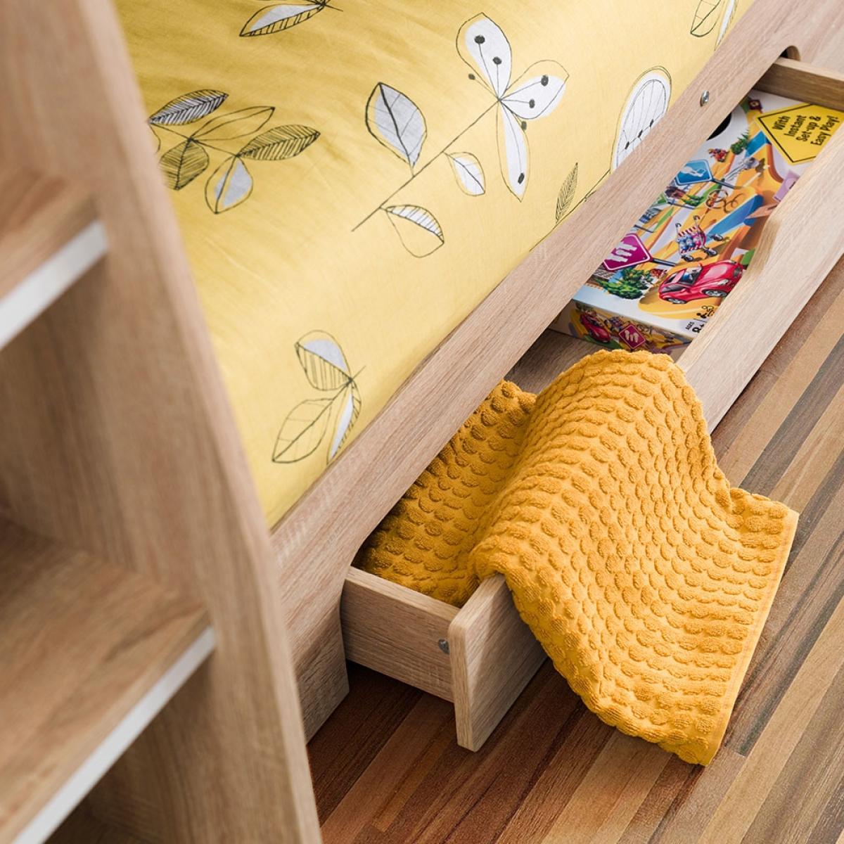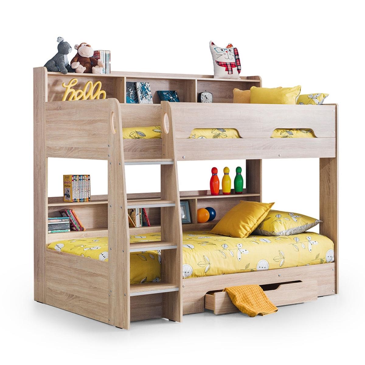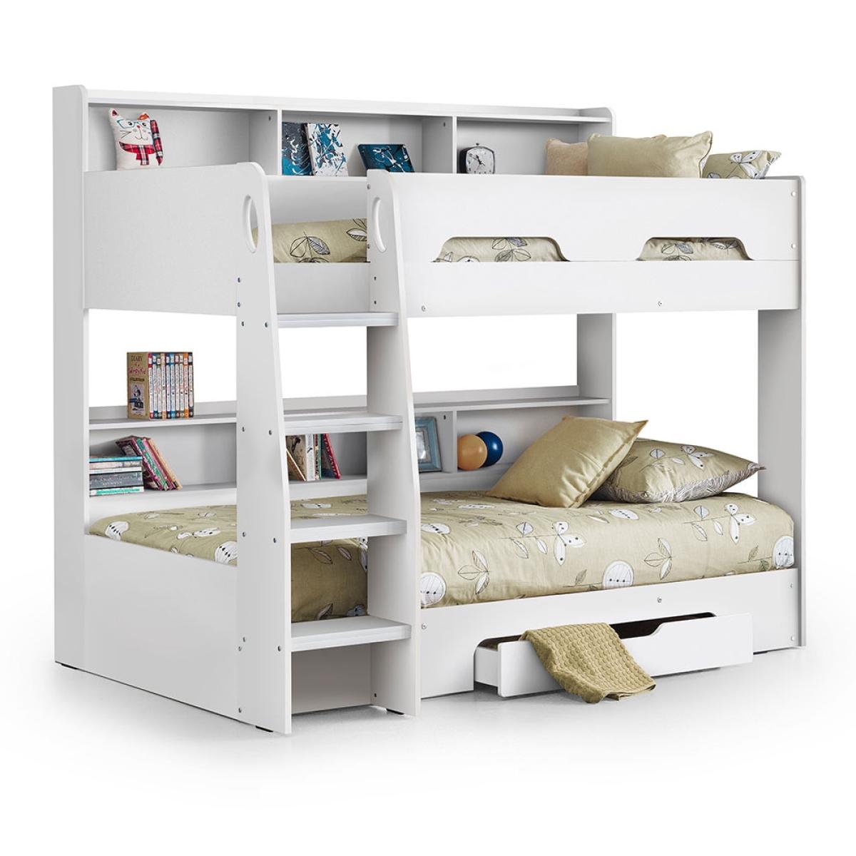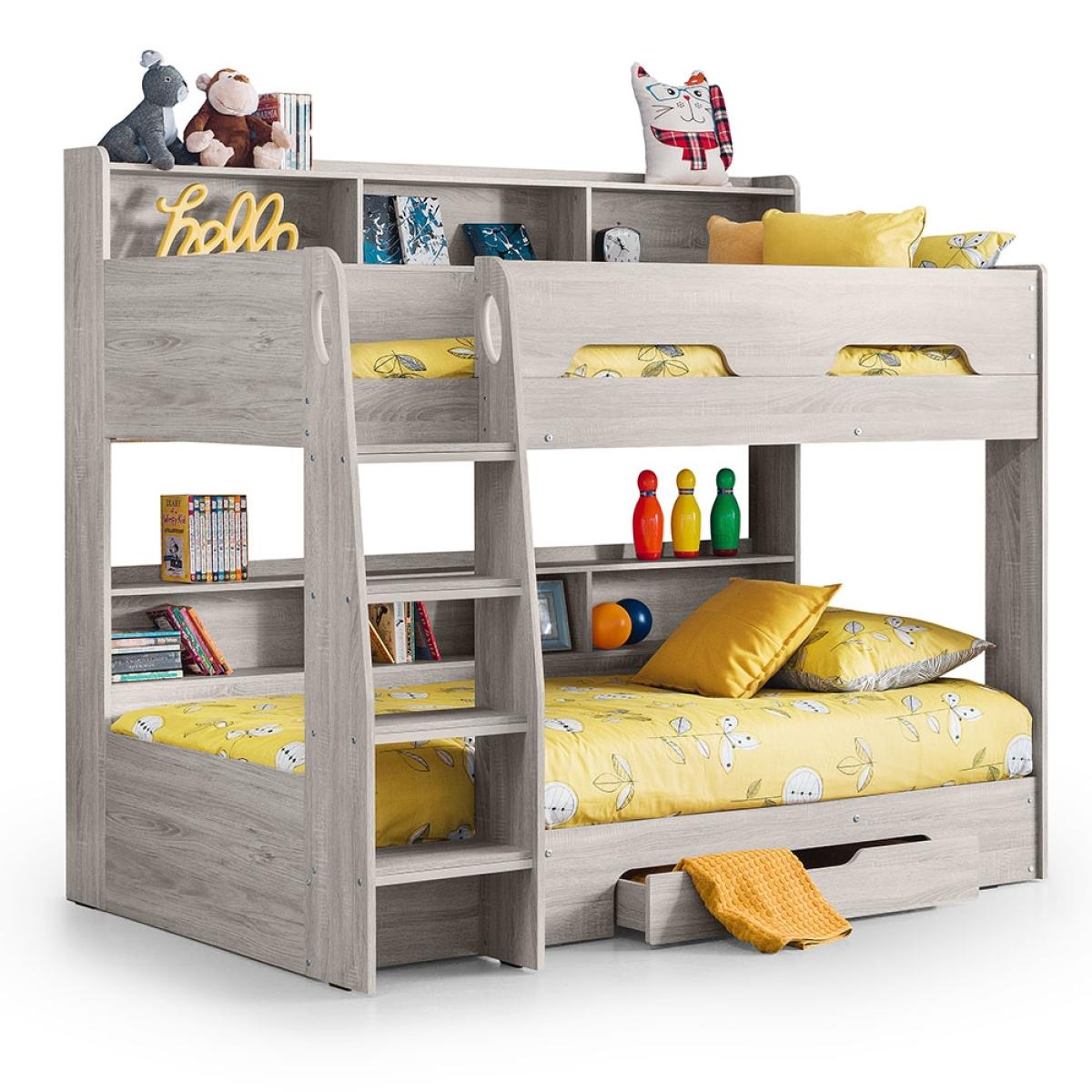 The Orion Bunk Bed from Julian Bowen is the ideal option for cramped bedrooms or just to create more floor space. Available in 2 colours; white or oak effect, the Orion Bunk Bed will blend seamlessly into your interior style and see your kiddie through childhood into their teenage years. With shelving on the top and bottom bunk, your little ones will be able to keep their bits and bobs close by and will be perfect for storing their books. Plus with a storage drawer beneath, whether used to store blankets or toys, keeping their room spick and span should be one easy task.