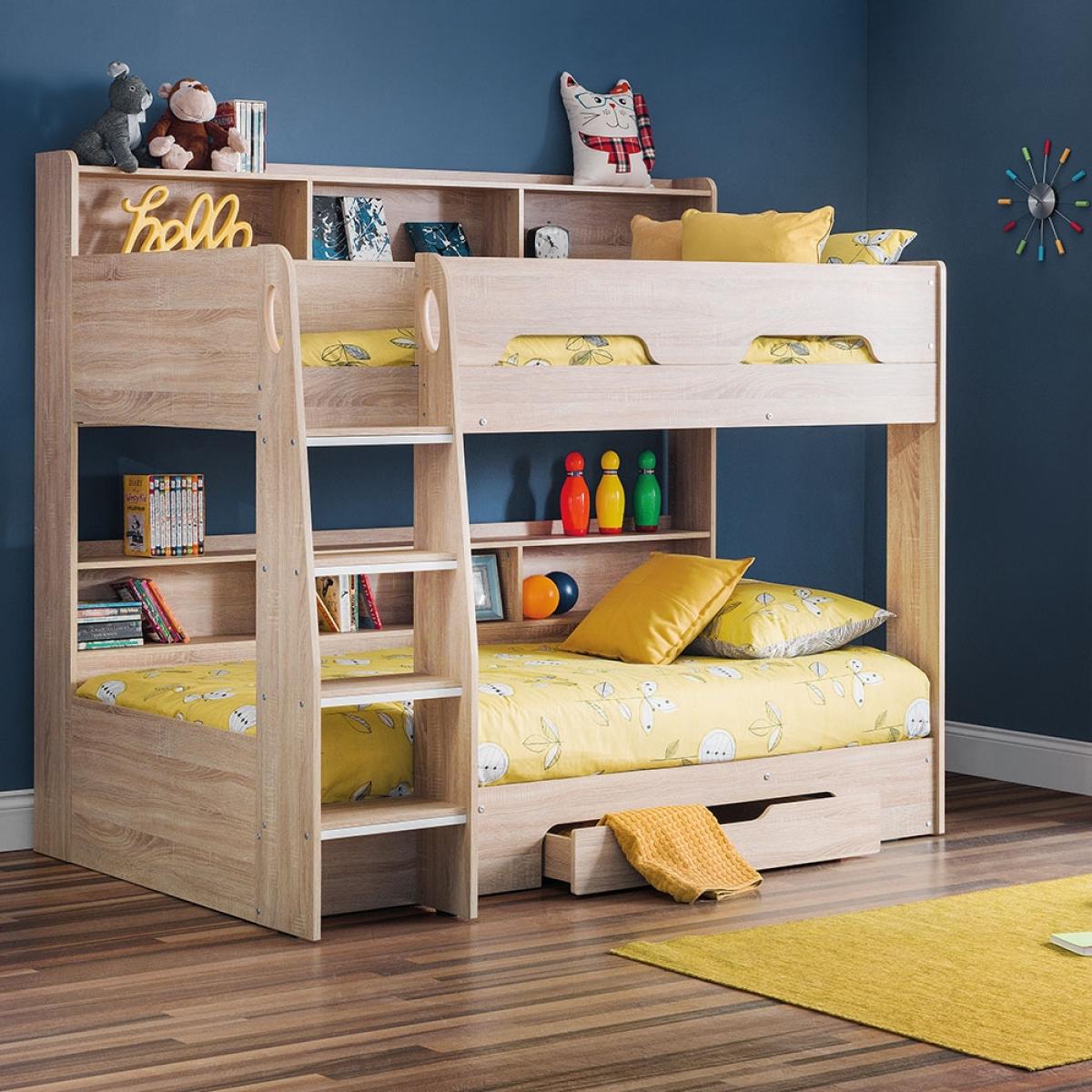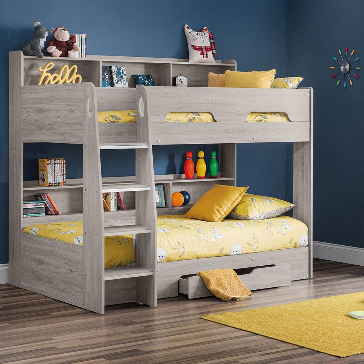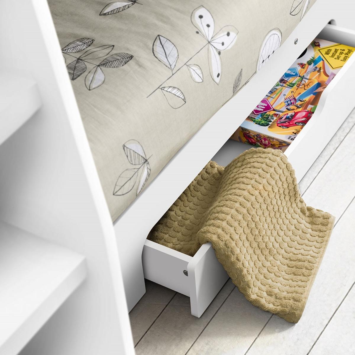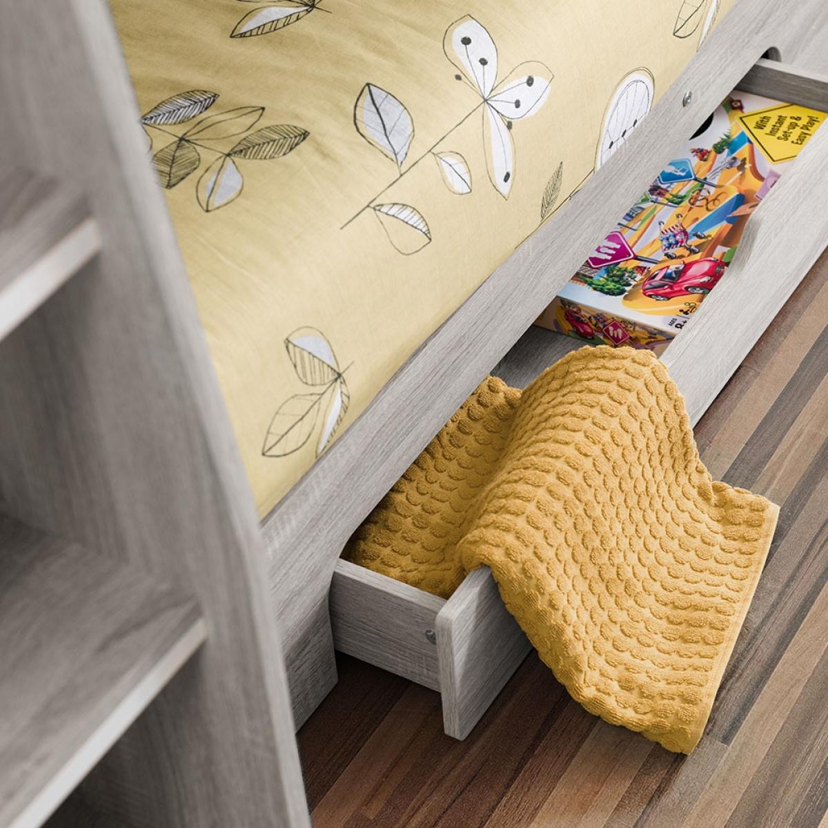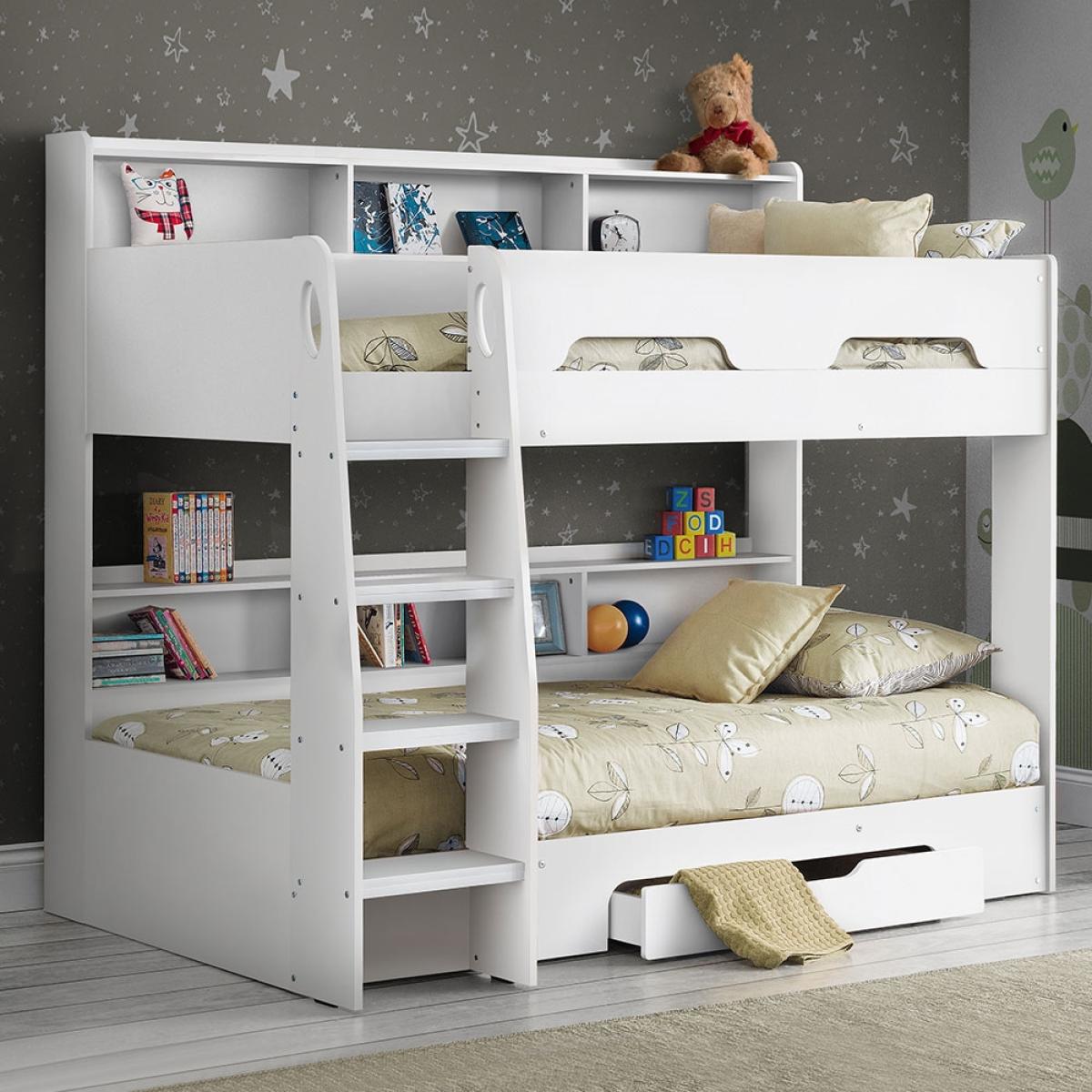 The Orion Bunk Bed from Julian Bowen is the ideal option for cramped bedrooms or just to create more floor space. Available in 2 colours; white or oak effect, the Orion Bunk Bed will blend seamlessly into your interior style and see your kiddie through childhood into their teenage years. With shelving on the top and bottom bunk, your little ones will be able to keep their bits and bobs close by and will be perfect for storing their books. Plus with a storage drawer beneath, whether used to store blankets or toys, keeping their room spick and span should be one easy task.