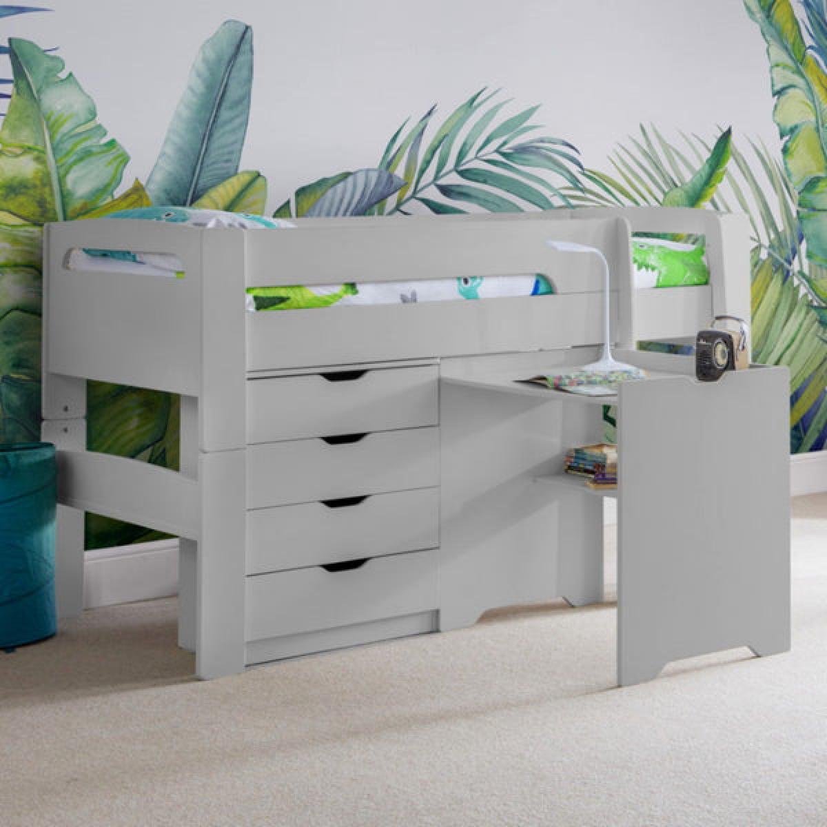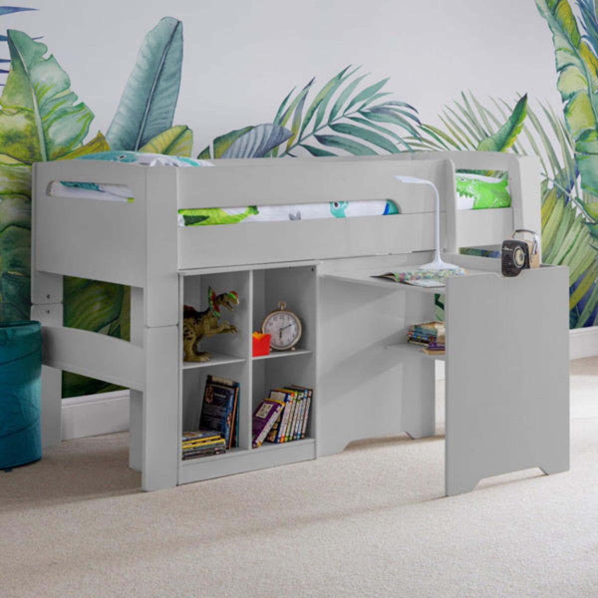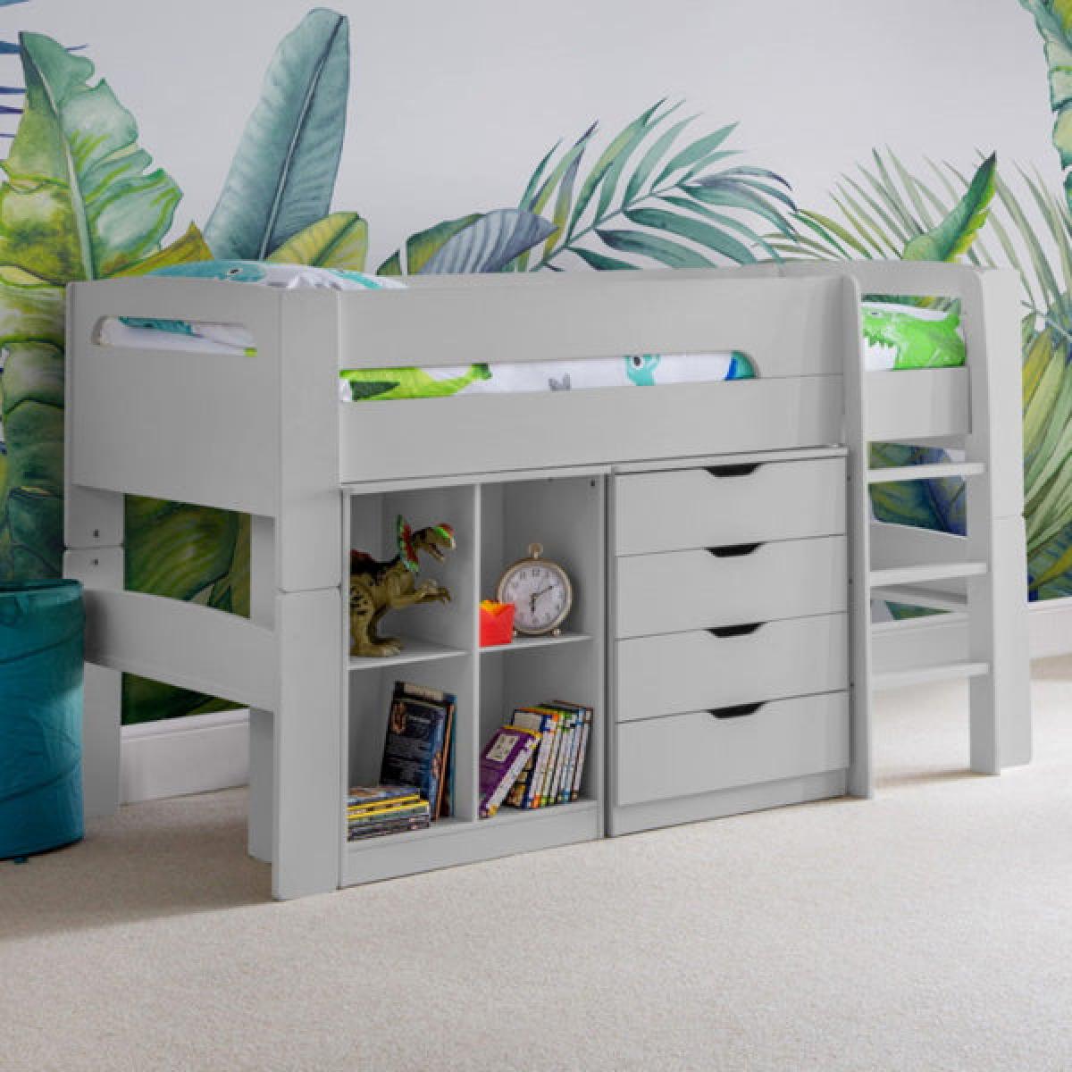 The Pluto Midsleeper is a sturdy and stylish mid-sleeper finished in a smooth dove grey lacquer. Pluto's contemporary design is accompanied by great functionality, with a robust ladder that can be assembled on either left or right and the capacity to convert to a single bed if required at any time in the future. It can be used on its own or paired with the extensive Julian Bowen Cameo Bedroom collection, while pairing it with the Pluto Star Tent (sold separately) in either pink or blue will turn the Pluto mid-sleeper into a fun and vibrant play space for kids to enjoy.
