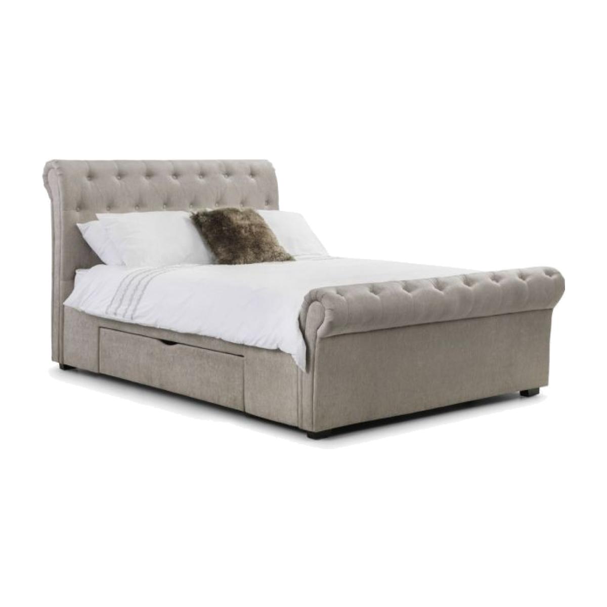 Ravello is a stunning fabric bed in a classic scroll design, finished in a lovely soft touch mink chenille. It is a substantial bed characterised by exquisitely finished, sumptuous upholstery and a striking deep buttoned, high headboard with matching footboard. Two large under bed drawers add phenomenal amount of storage space. Ravello adds a wow factor to any bedroom and is a perfect match for traditional and contemporary interiors alike. A sprung slatted base ensures extra comfort and prolonged mattress life. Classic scroll design. Immaculate deep buttoned upholstery. Two large storage drawers - 115cm W x 57cm D x 17.5cm H. Dimensions: 238cm (D) x 146cm (W) x 114cm (H) Requires assembly. Please note, this product is an online exclusive and is not available to view in any of our stores.