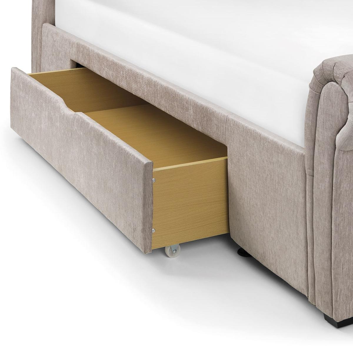 Add a touch of sophistication to any bedroom in your home with the stunning Ravello Upholstered Bed from Julian Bowen, whether it be your own or a guest room it will be a welcome addition. Not only does this bed have style, but it also offers up storage. With two drawers neatly tucked away on either side of the bed there is plenty of space for clothing, bedding or a great place to hide birthday presents from prying eyes! Upholstered in a soft-touch chenille fabric, the scroll headboard and footend create a classic luxury effect, this bed is so luxurious that you'll struggle to ever leave it!.