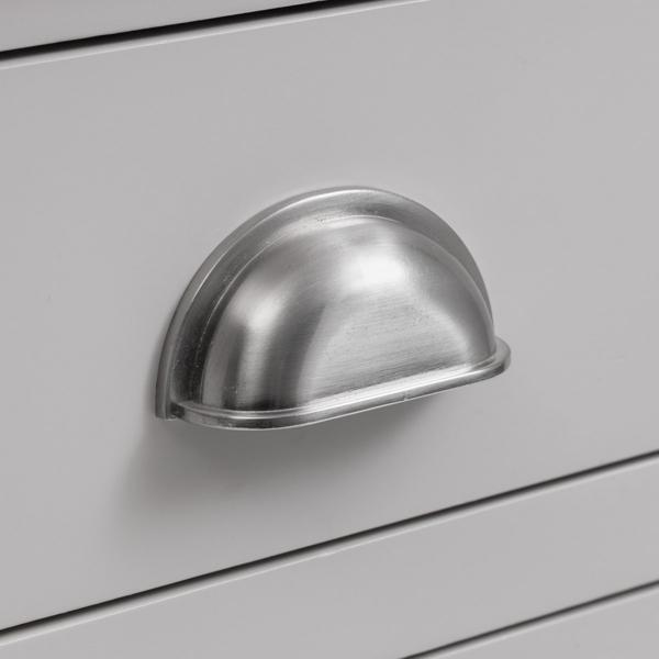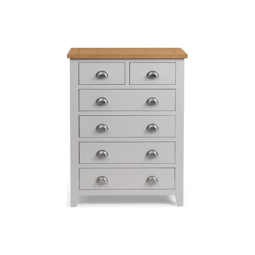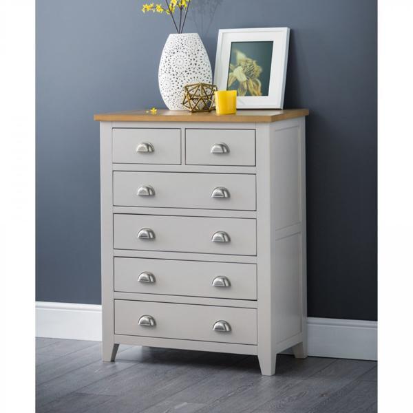 I love this chest of drawers for its versatile design and practical size, making it ideal for various interiors from traditional to contemporary. The combination of a natural wooden top with the light grey body adds a subtle contrast that works well in both cosy bedrooms and modern spaces. It’s great for styling with minimal accessories-think a few decorative trays or small plants on top-while keeping clutter tucked away in the six drawers. Practical tips include pairing it with brass or matte black hardware for a bit of a modern edge, and positioning it against a coloured or textured wall to create visual interest. Overall, it’s a reliable piece that blends style with function effortlessly.