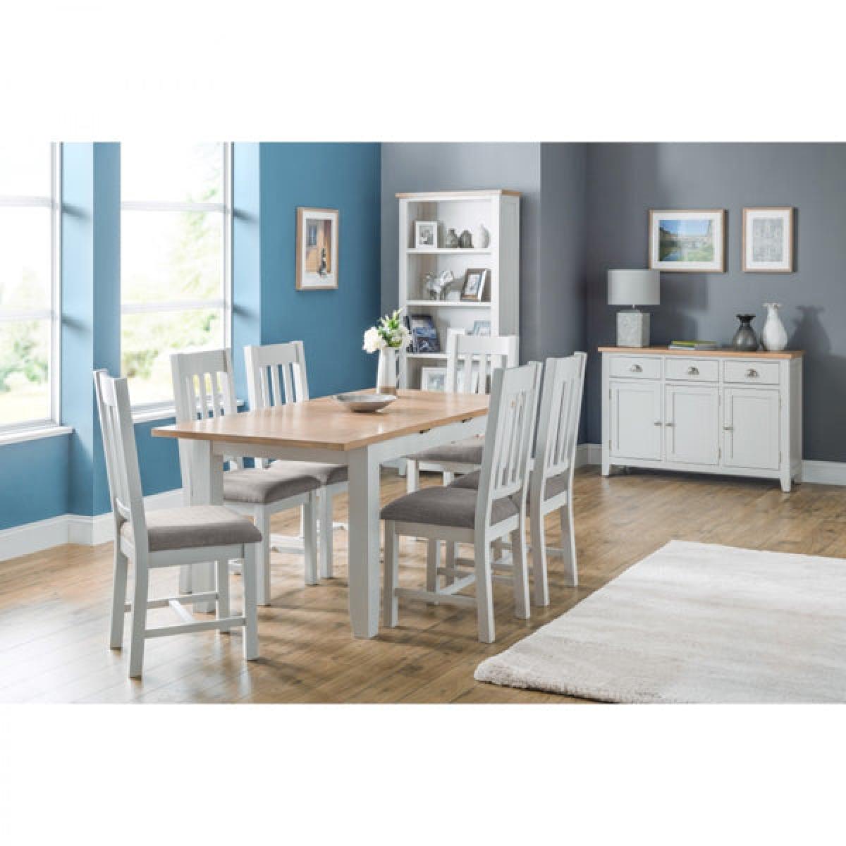 An elegant extending Dining Table, presented in an immaculate painted, soft Elephant Grey finish with beautiful pale oak top, crafted from a combination of high grade White Oak solids and veneers. This imposing dining table features a substantial 35mm top and a 40cm butterfly extension system that is easy to use and stores within the table when not in use. The combination of superior quality materials and classic design ensures a timeless appeal and fits perfectly alongside both traditional and contemporary decor. Part of the extensive Richmond Dining and Occasional furniture range from Julian Bowen.