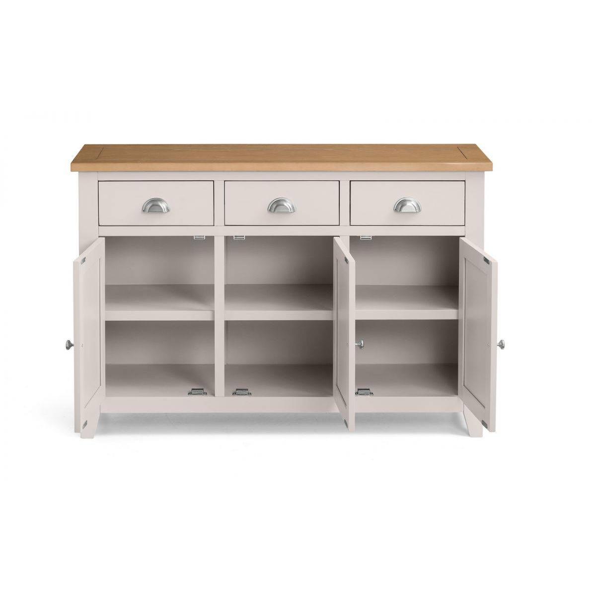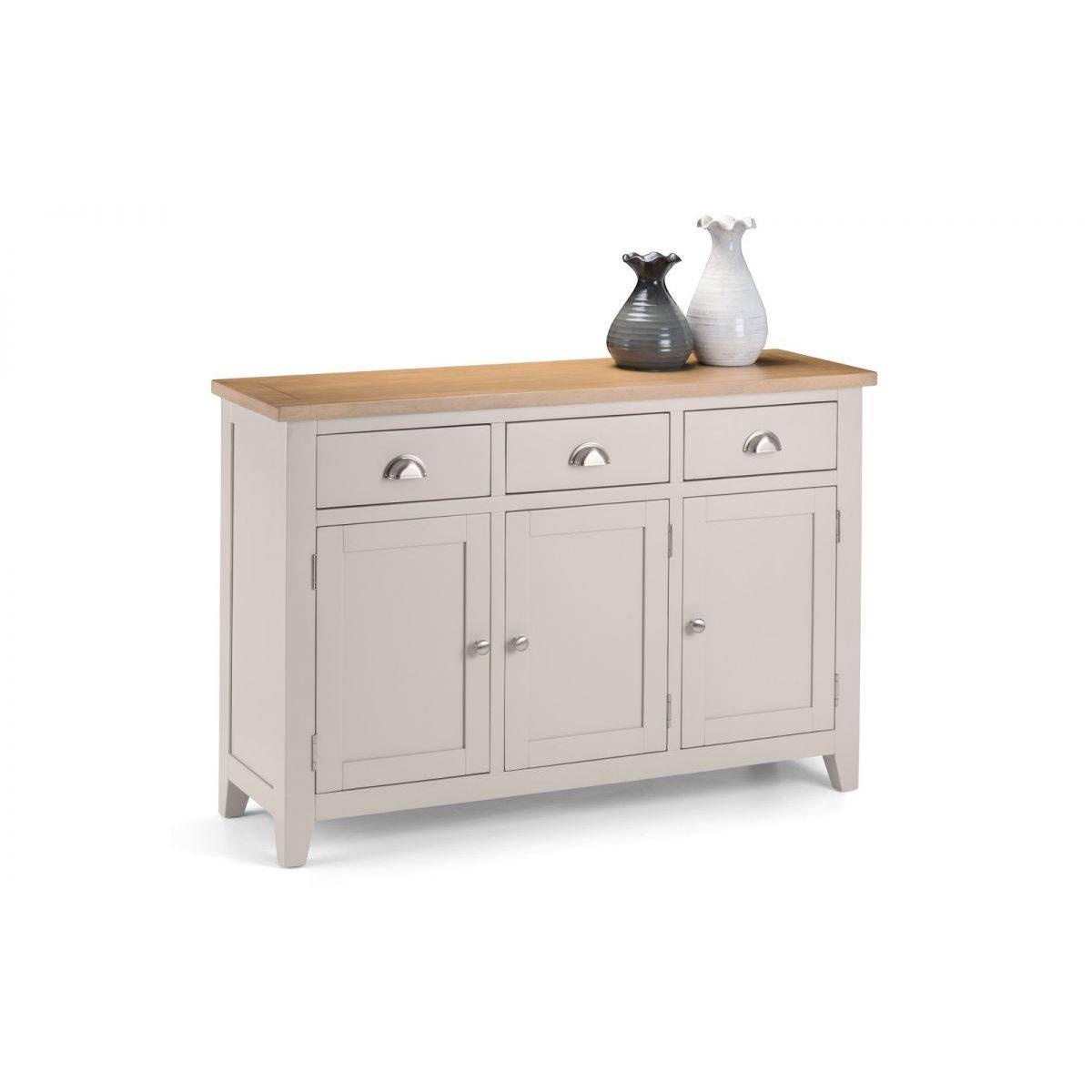 An elegant sideboard, presented in an immaculate painted, soft Elephant Grey finish with beautiful pale oak top, crafted from a combination of high grade American White Oak solids and veneers. This stylish piece looks beautiful and offers phenomenal storage for kitchen, living or dining room. Includes three practical drawers above a double and single cupboard space, accented with chic cupped handles in a brushed steel finish; ideal for cutlery, crockery and glassware. The combination of superior quality materials and classic design ensures a timeless appeal and fits perfectly alongside both traditional and contemporary decor. Part of the extensive Richmond Dining and Occasional furniture range from Julian Bowen. Internal drawer dimensions - 32.5cm x 31.5cm x 11cm. Internal shelf dimensions - 41cm/78cm x 35cm x 23cm. Dimensions: 40cm (D) x 128cm (W) x 86cm (H)
