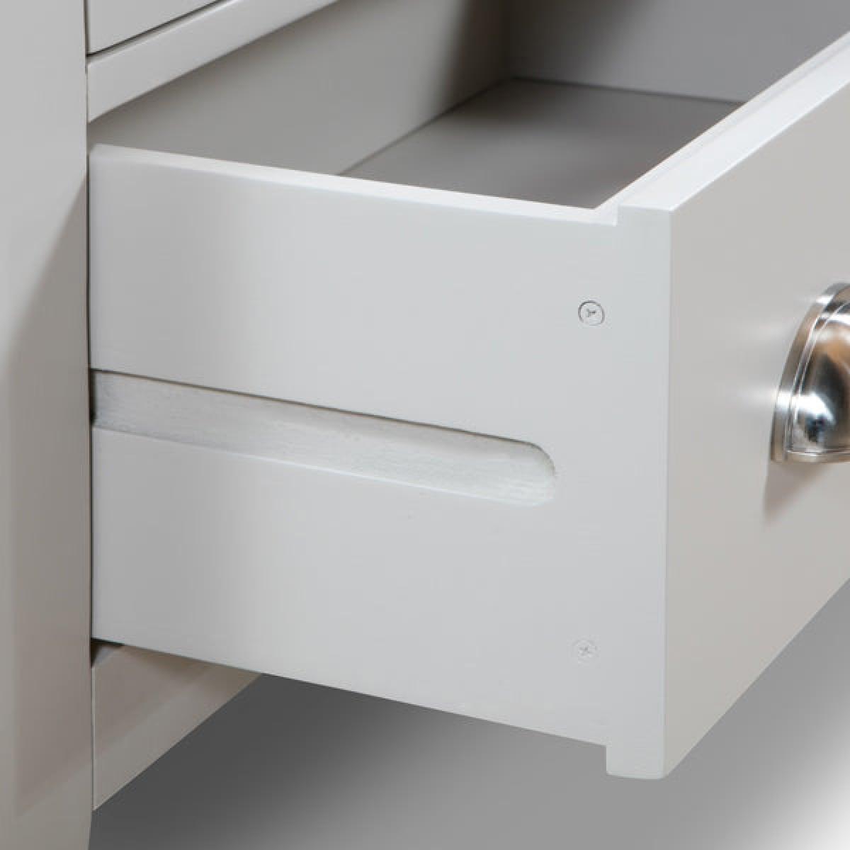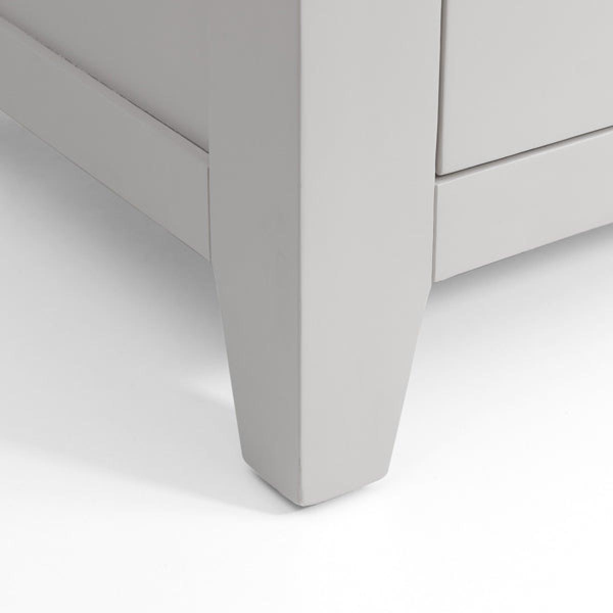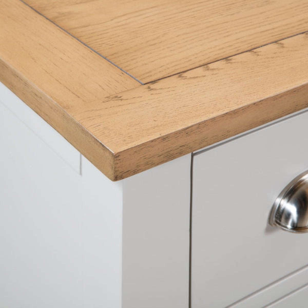 I love this dressing table because of its classic yet versatile design, making it suitable for a range of interiors from traditional to contemporary. Its combination of a soft grey finish and natural wood top offers a balanced look that can be styled with vintage accessories or modern minimalism. This piece works particularly well in bedrooms that benefit from extra storage, and it’s practical for keeping everyday essentials organised. For styling, consider adding a large mirror above for functionality, and place some decorative trays or small vases on top to keep the surface looking tidy. It's a great choice for creating a functional and stylish dressing area without overwhelming the room.