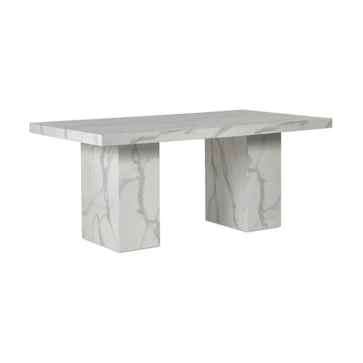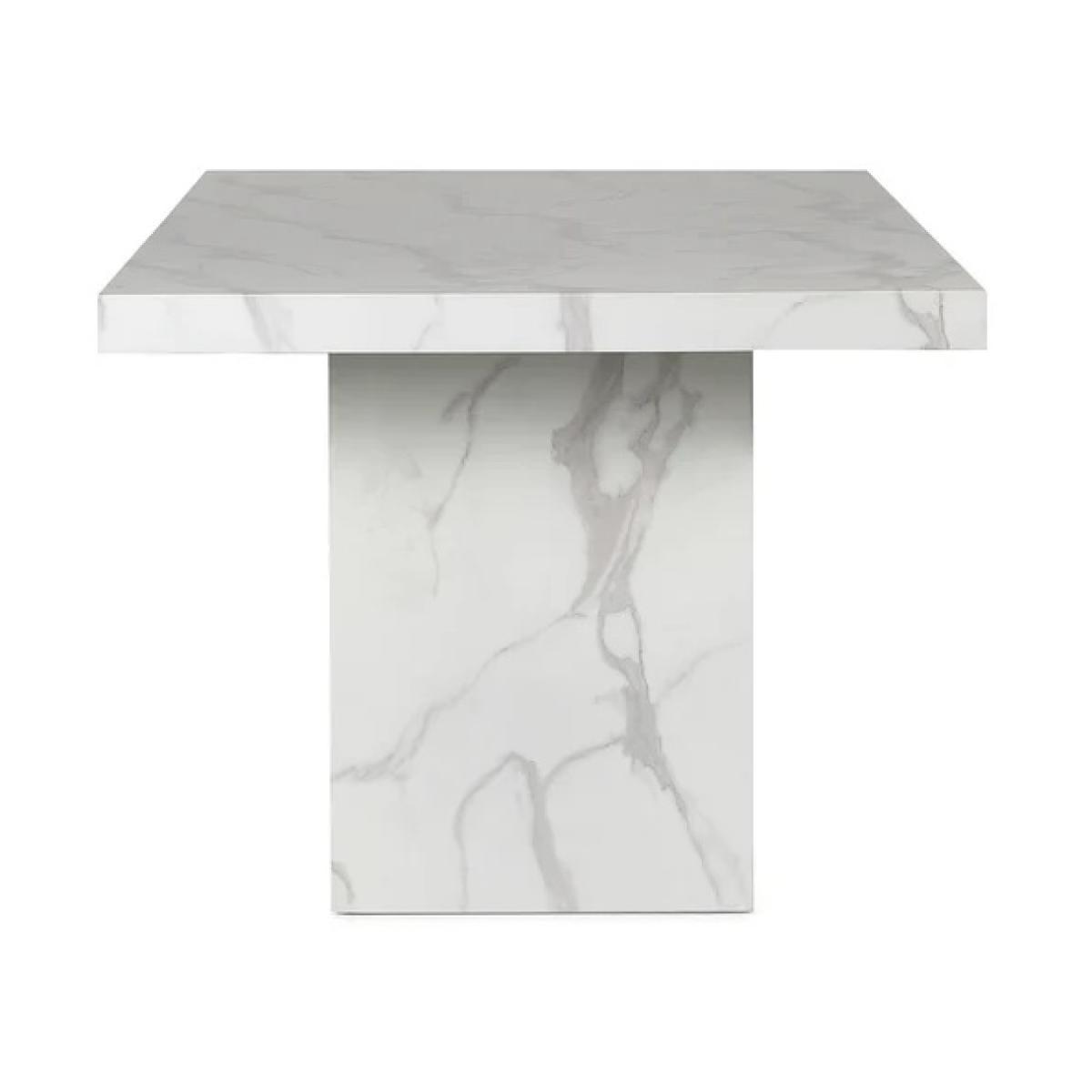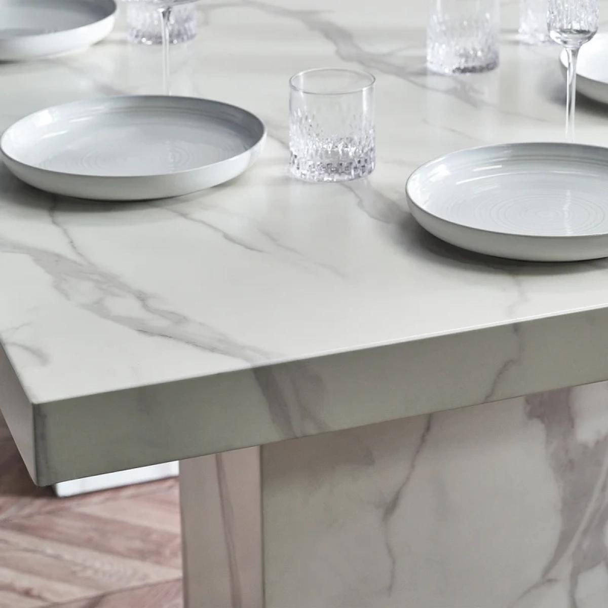 Introducing the Julian Bowen Rome Dining Table –White, a bold blend of timeless elegance and modern design. This striking piece pairs the sophistication of a marble-effect tabletop with the contemporary appeal of pedestal legs. The expansive surface, finished in sleek white tones with a beautifully realistic marble pattern, instantly commands attention. It brings a sense of luxury and refinement to any dining area, while its clean lines and sculptural base make it a perfect fit for both classic and modern interiors. Features: White marble-effect tabletop adds a touch of sophistication Sleek pedestal base enhances modern appeal Expansive surface ideal for dining and entertaining Combines timeless style with contemporary design Creates a stunning focal point in any dining room Home Assembly Required Dimensions: Height 76cm Width 180cm Depth 100cm All screens vary in colour reproduction and whilst every effort has been made to display the colour as accurately as possible it is for guidance only.