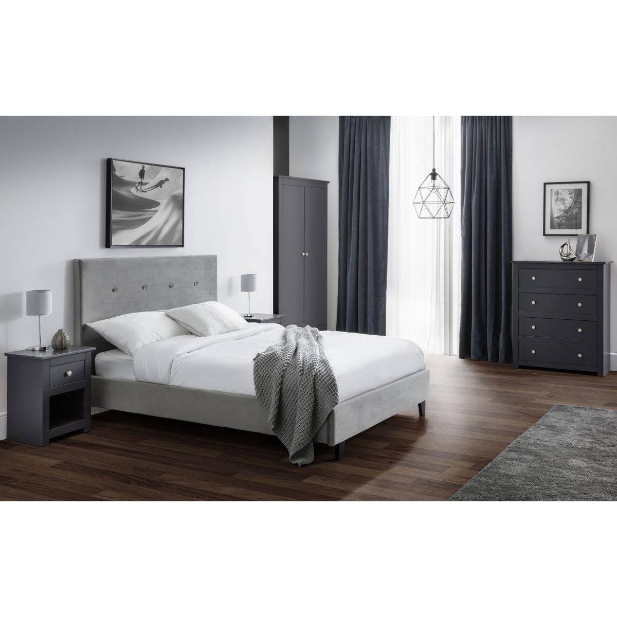 Shoreditch is a stunning bed with modern, clean lines, beautifully upholstered in an exquisite short-pile slate grey velvet fabric. Shoreditch has an imposing, high headboard,  with immaculate button detailing  which adds a real wow factor to any bedroom, while its timeless styling makes it the ideal accompaniment to a wide range of decorative styles. A sprung slatted base ensures supreme comfort and prolonged mattress life. Features: Requires assembly Luxuriously Soft, Short Pile Velvet with Rich Sheen Strong and Sturdy Hardwood Frame Sprung Slatted Base for Extra Comfort and Prolonged Mattress Life Available as double or king