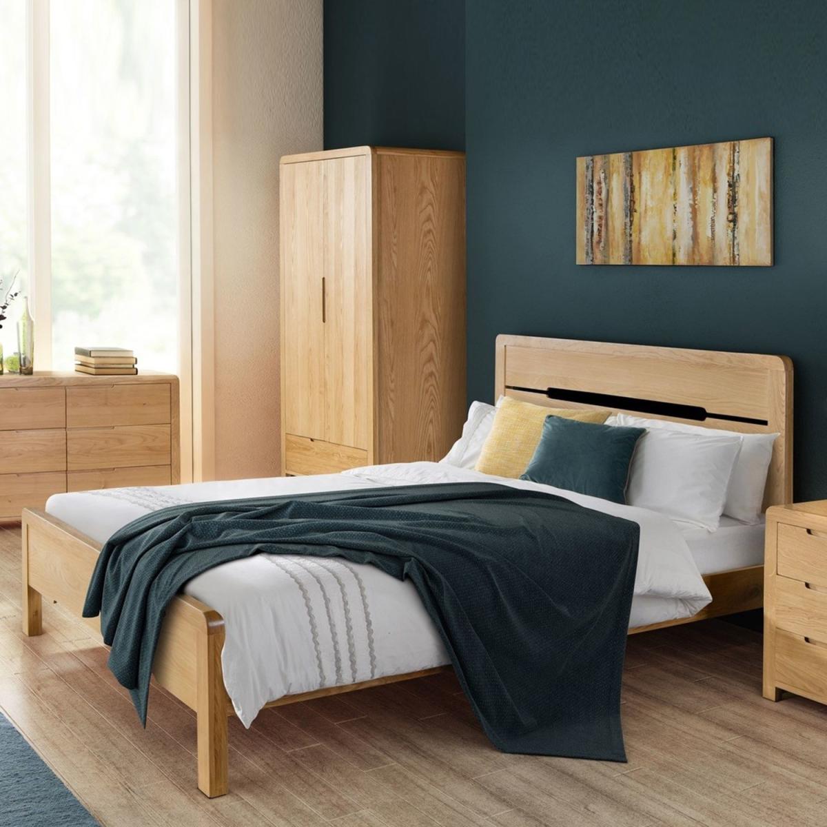 I love this bed frame for its clean lines and natural oak finish, which bring a warm, timeless feel to any bedroom. Its curved headboard adds a soft, inviting touch, making it versatile enough to suit both modern and rustic interiors. It works particularly well in minimalist or Scandinavian-inspired spaces, where simple, natural materials continue to be popular. Practical styling tips include pairing it with neutral bedding and adding layered textures through throws and cushions for added comfort. To enhance its natural appeal, consider styling with botanical accents or earthy-toned accessories, creating a calm and cohesive look that’s both stylish and practical.