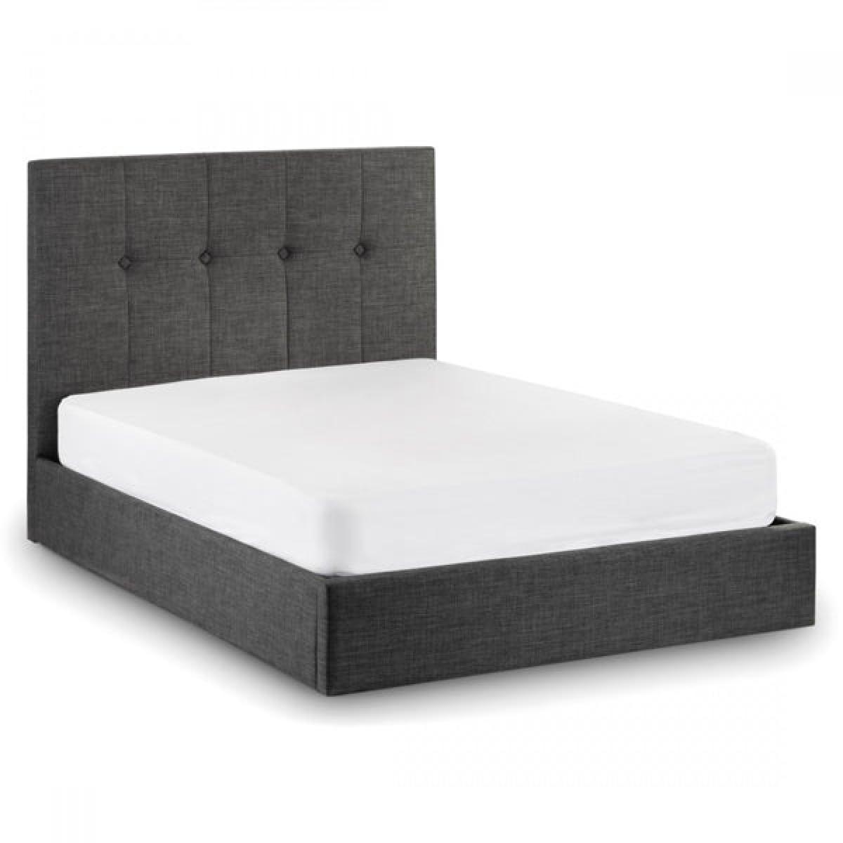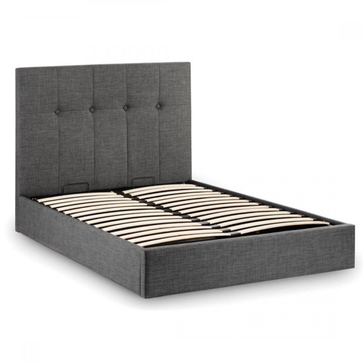 Sorrento is a stunning fabric bed, beautifully upholstered in a sophisticated slate grey linen fabric. A contemporary high headboard with immaculately finished diamond shaped feature buttoning makes an impressive style statement, while a gas-powered lift-up Ottoman offers a phenomenal amount of storage space. A sprung slatted base ensures a good night's sleep and prolonged mattress life. Sorrento is the perfect combination of stylish design and quality and offers fantastic value for money. H:121 x W: 161 x D: 214. 5 x Head H: 121 x Foot H: 27 cm.