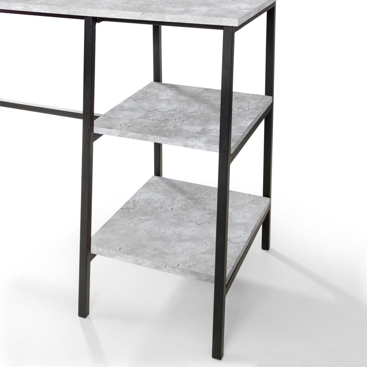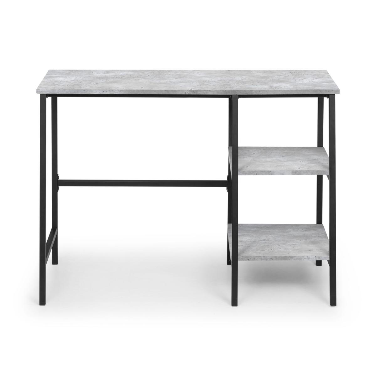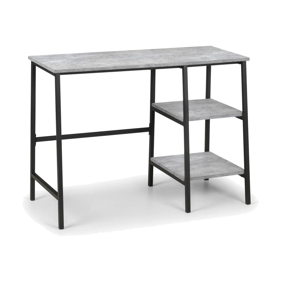 Dimensions H72 x W104 x D45 cm. The Staten Desk is simplistic and contemporary in design with its black coated metal frame and concrete effect top it will add a stunning industrial look to any home office. Featuring 2 shelves for storage. Part of the Julian Bowen Staten dining and occasional range. Features. Concrete effect foil. Black coated metal frame. Featuring 2 shelves. Modern design suitable for a range of décor Part of the Julian Bowen Staten dining and Occasional range. Assembly required..