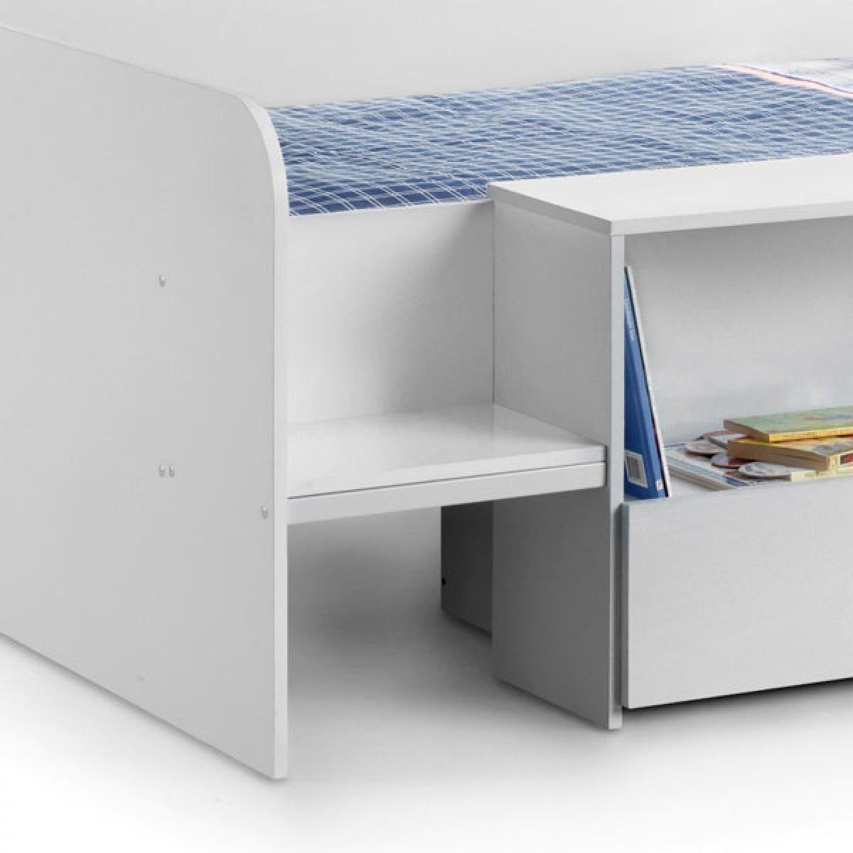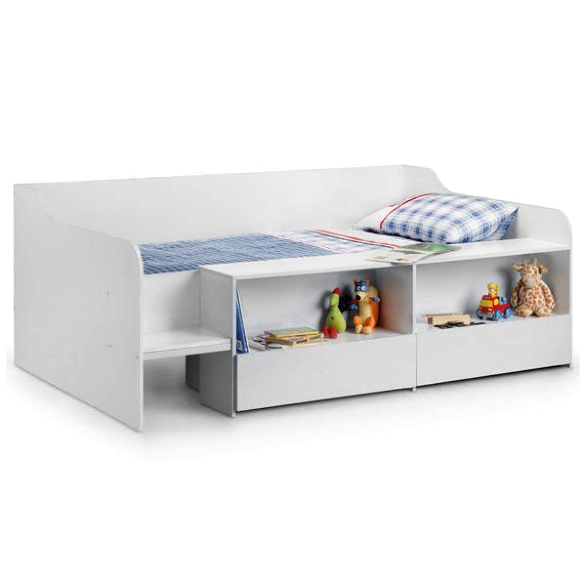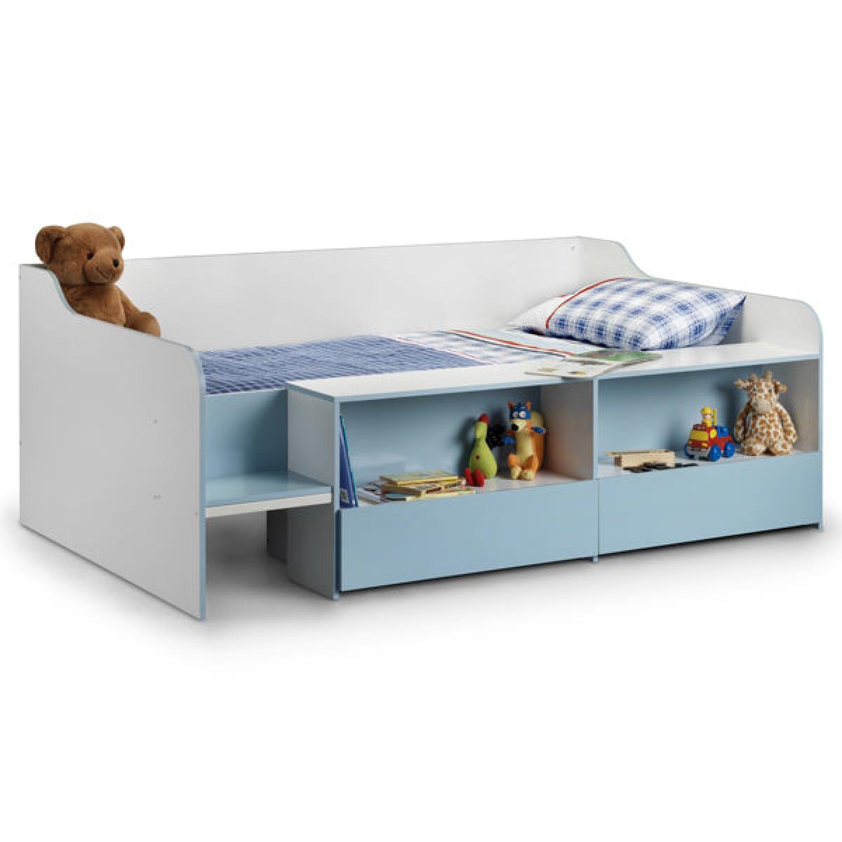 The Stella low sleeper is a great saving solution for any bedroom. Featuring 2 pull-out drawers on castors and uselful shelving, suitable to hide your kids mess! Crafted from particleboard with foil and powder coated steel, this bed is available in pure white, blue or pink suitable for a range bedroom decor! Coordinating with the Julian Bowen Domino bedroom range, why not complete your kids bedroom today!.