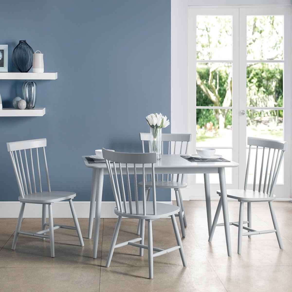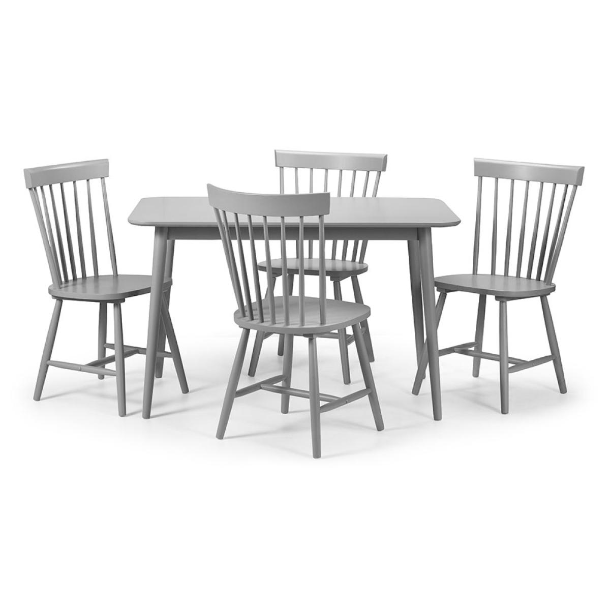 Update your kitchen or dining room with the Torino Dining Set by Julian Bowen. Including 4 spindle back chairs and a rectangular table, whether you're creating a traditional country kitchen or a contemporary breakfast nook, this Scandinavian inspired set will fit perfectly with your chosen style! Finished in a smooth satin lacquer in a stunning grey colour, the Torino table and chairs will completely revamp your chosen space!.