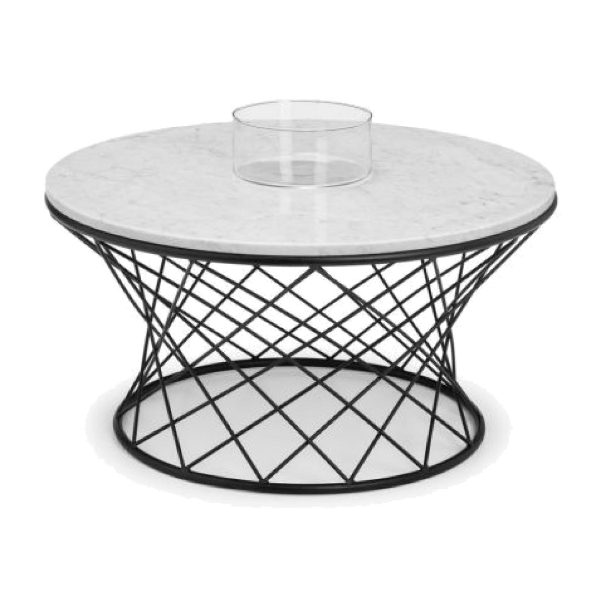 Refresh your living room with the Trevi Coffee Table. Finished with a real white marble top, and a distinctive black wire metal base, this hardwearing design offers a unique, modern look suitable for a range of decor. Each top is slightly different due to the marbles unique nature, giving every coffee table an individual character.  Dimensions: 80cm (D) x 80cm (W) x 43cm (H)Assembly required.