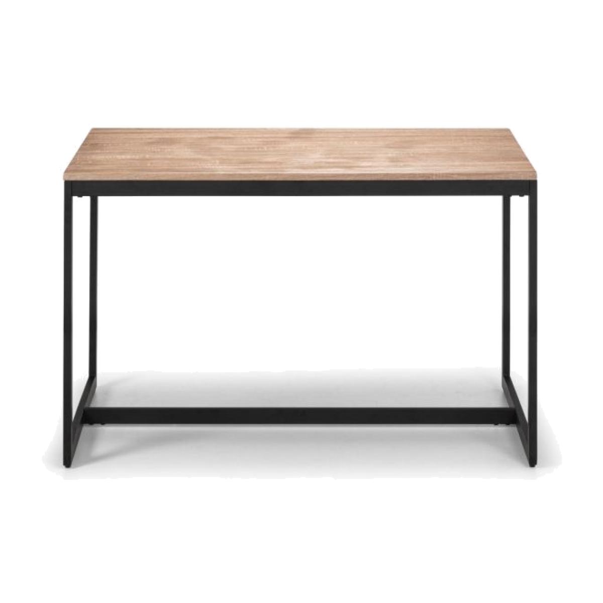 A cool, modern dining table designed to add a contemporary touch to any dining space. Its simple clean lines, delineated by a subtle, black coated metal frame are complemented perfectly by a warm, sonoma oak foil, to create a very stylish and sleek product. The perfect match for the Tribeca Bench, creating a modern atmosphere within your home. Dimensions: 120cm (D) x 80cm (W) x 75cm (H)Assembly required.