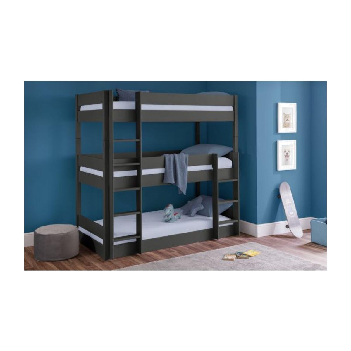 Accommodating 3 children whilst only using the space of one single bed, the Trio bunk bed is the perfect solution for those short on space in smaller bedrooms. Ideal for sleeping siblings, or regular sleepovers the durable Trio Bunk is finished in a stylish Surf anthracite, matching any bedroom decor. Crafted from solid pine and MDF, this safe and sturdy design is essential for maximising space. Standard UK Single Mattresses required. Simple self-assembly required. Dimensions: 99cm (D) x 202cm (W) x 198cm (H)Please note, this product is an online exclusive and is not available to view in any of our stores.