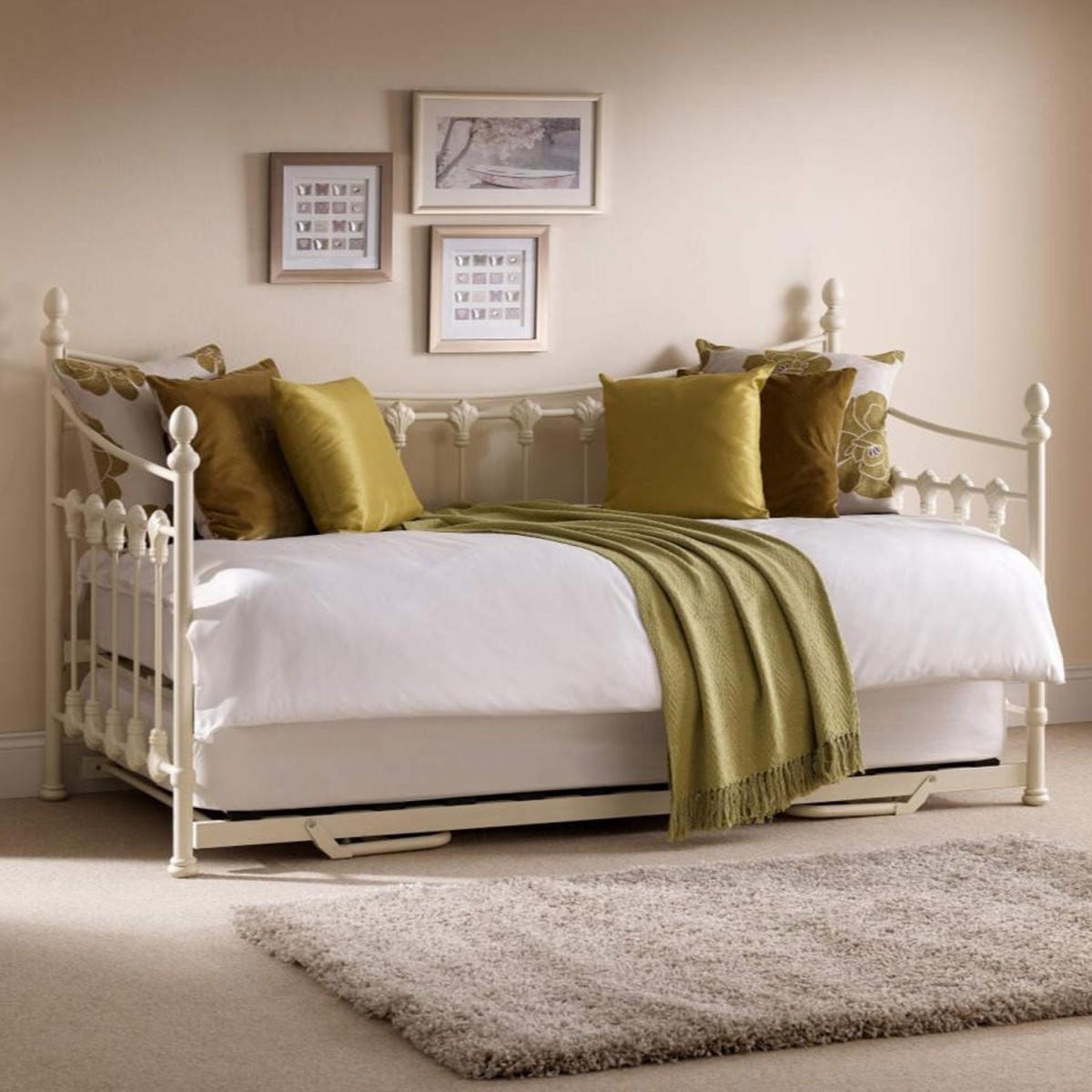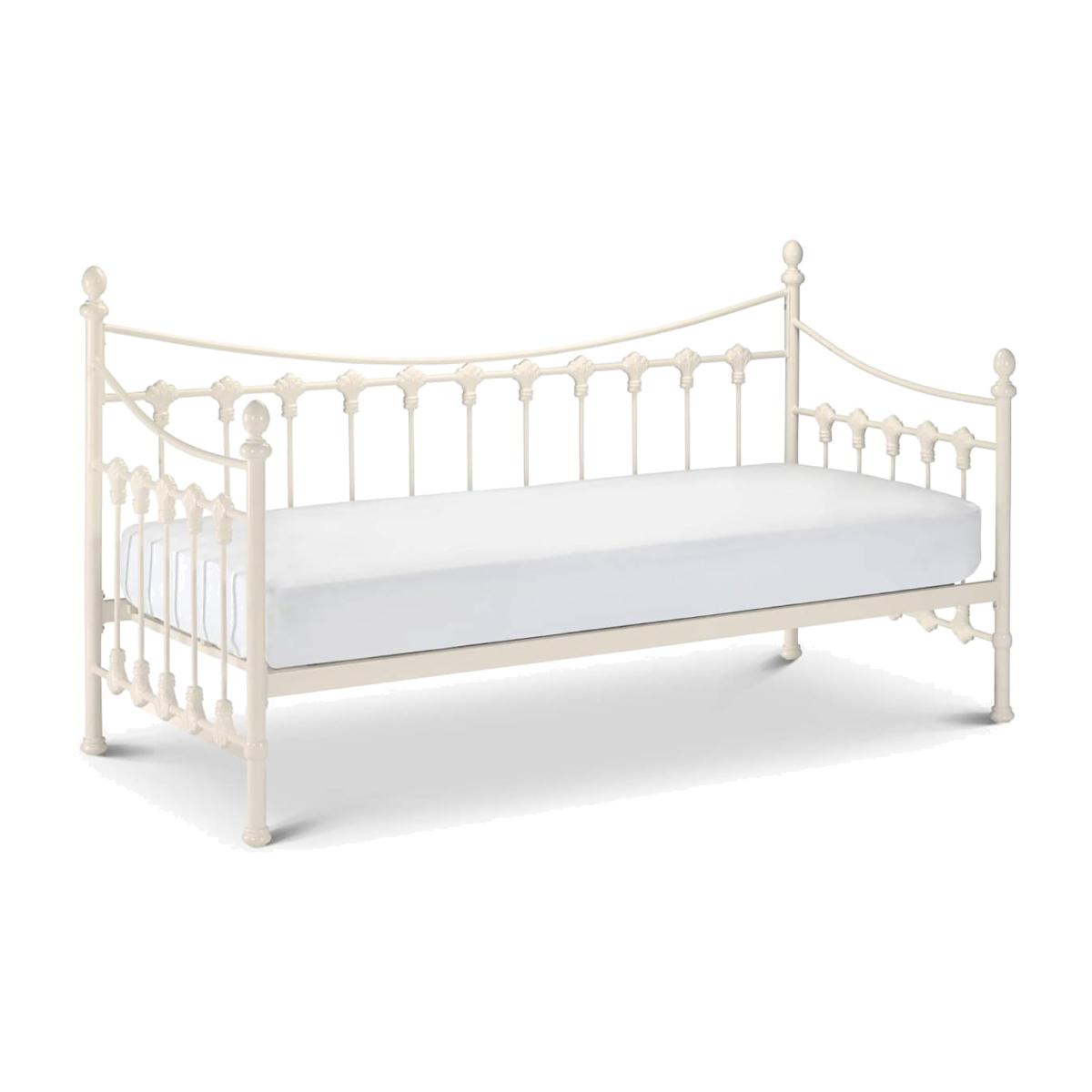 . Drift off to dream land in this romantically styled day bed. Highly practical as well as stylish sure to be a beautiful featureFEATURE S. Beautiful metal bed frame adding a romantic style to your bedroomA delicate stone white finish means it is incredibly versatile Sprung slatted base for a cushioned mattress support. Metal bed frame with a stone white painted finish. Multi-functional can be used as a bed or a sofa during the day. Ideal for a spare room or study. Matching trundle bed available. DIMENSIONS. W100 x D203 x H115 cm Standard UK single size A neat design fitting perfectly in many settings. This stunning day bed will not take up any more space than your average single bed offering you 90cm of sleeping or sitting space. Beautifully framed with stone white metal the day bed can effectively be disguised as a sofa through the day. Ideal for the spare room to accommodate guests as it can be practically used as a sofa when not needed as a bed. Makes a great addition to a teenagers room acting as a stylish sofa for when entertaining friends. A co-ordinating trundle bed is also available which can be stored underneath the day bed. Romantic Styling Delicate and sweet this day bed combines shapely metal with a soft stone white finish enhancing the romantic styling. The neutral colouring enforces the versatility this piece has fitting in to many settings perfectly. A welcoming bed or a practical sofa. Disguise how you like with an assortment of beautiful textiles to create that stylish day bed look. Quality Build A metal frame finished with a stone white eggshell textured lacquer incorporating a sprung slatted base. A solid sturdy piece offering comfortable mattress support. Assembly Required Arriving flat packed accompanied with easy to follow step by step instructions. As with any flat pack furniture for safe and easy construction we would recommend this item to be assembled by two people .