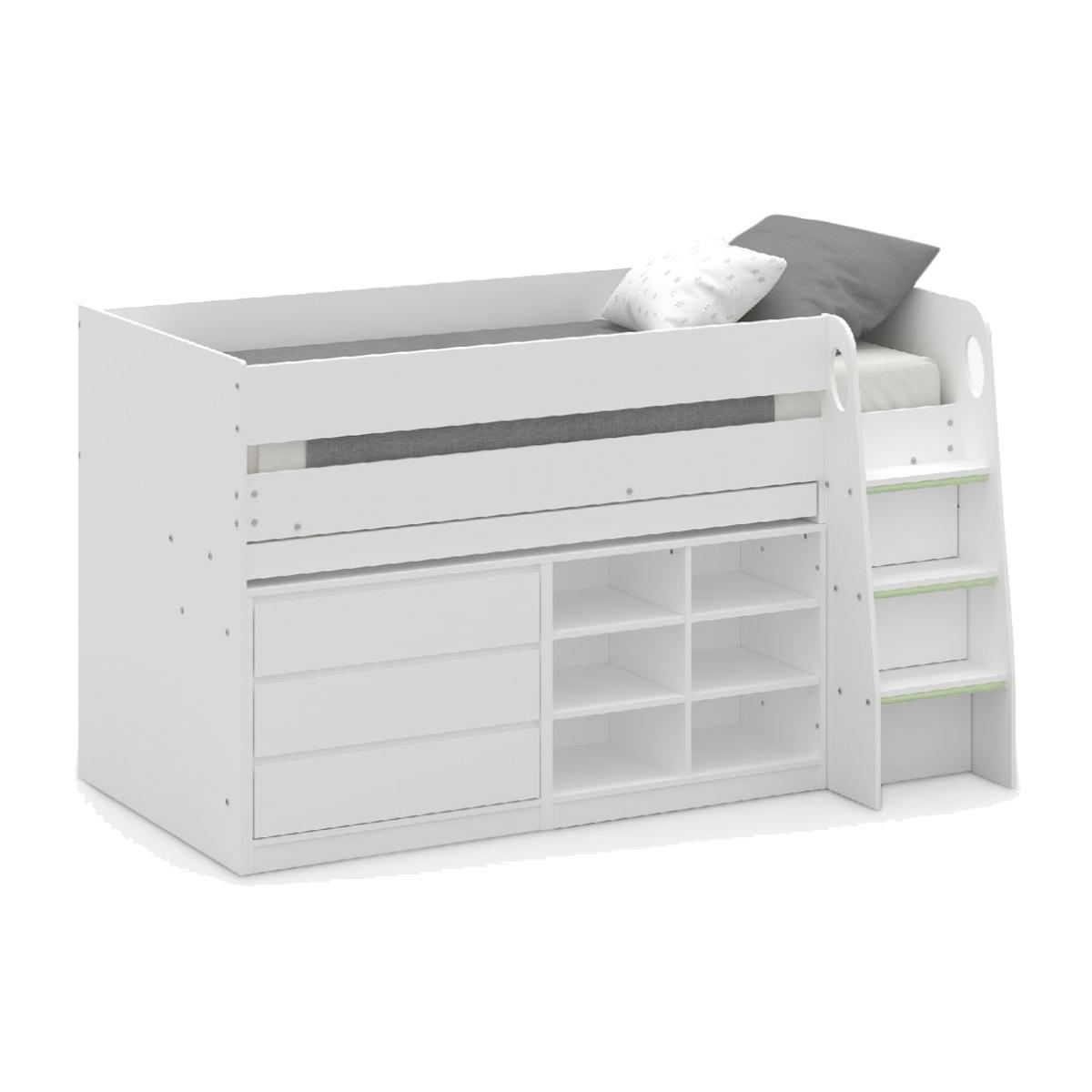 The Vespa Midsleeper is the perfect space saver for kids' and teenagers' bedrooms. With a neutral-painted finish, the mid-sleeper features cupboards, multiple shelves and a pull-out desk. The robust ladder contains beautiful handles, with glow-in-the-dark strips added for safety. Good to know This bed has been tested to British Standards BS EN: 747. It's suitable for children 6 years+. The solid slats in this bed frame provide a firm and more supportive base for the mattress. The compatible single mattress (L190 x W90cm) should have a maximum height of 15cm and is sold separately. Want to see it first? You may want to see and get a feel for the furniture in one of our shops before ordering. We'll be able to tell you where the range you'd like to view is on display.