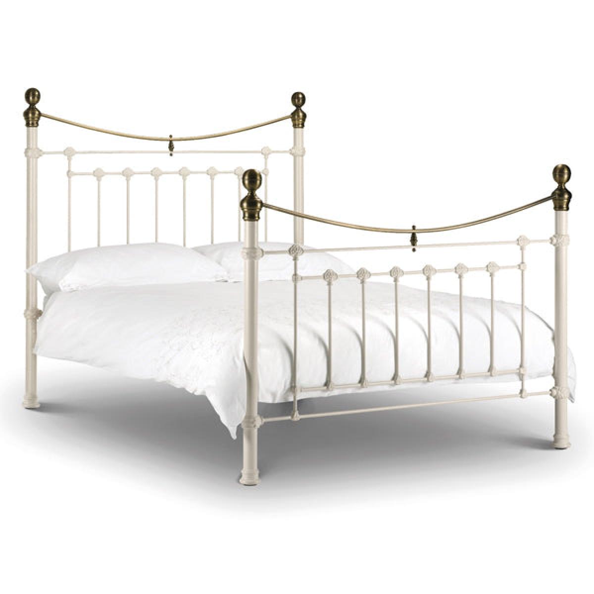This is a traditional, Victorian inspired bedstead with attractive brass embellishments in a powder coated steel stone white finish. Victoria is an imposing bed with striking high headboard and matching footboard, whose timeless style complements a wide range of interior styles. A sprung slatted base ensures a comfortable night's sleep and prolonged mattress life. Available in 90cm, 135cm and 150cm sizes. H:146 x W: 151 x D: 207 x Head H: 146 x Foot H: 102 cm. H:146 x W: 166 x D: 215 x Head H: 146 x Foot H: 102 cm. H:146 x W: 166 x D: 215 x Head H: 146 x Foot H: 102 cm.