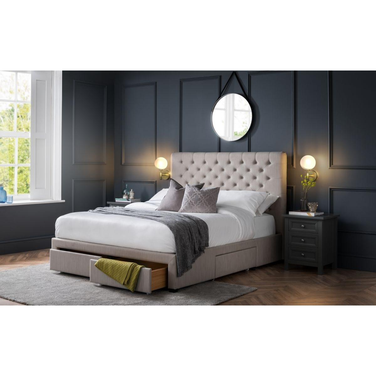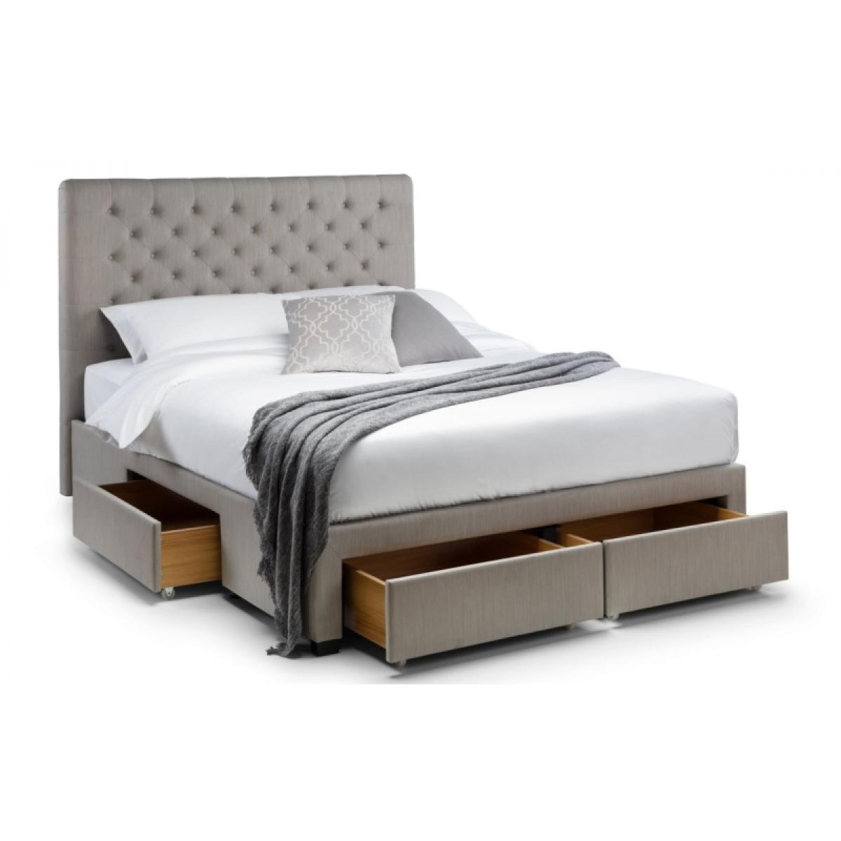 The Julian Bowen Wilton Deep Button 4 Drawer Bedframe is a stunning blend of luxury, practicality, and modern design. Upholstered in soft grey linen, this elegant bedframe features a deep-buttoned, padded headboard that exudes sophistication while providing a comfortable backrest for reading or relaxing. Designed with functionality in mind, it boasts four spacious storage drawers, seamlessly integrated into the base, making it ideal for keeping bedding, clothing, or other essentials neatly stored away. The sturdy wooden frame and sprung slatted base ensure enhanced comfort and long-lasting durability, making this bed both stylish and practical. Mattress not included Key Features: Elegant Design – Deep-buttoned headboard for a timeless, sophisticated look Soft Upholstery – Finished in high-quality grey linen fabric for a luxurious feel Ample Storage – Four large under-bed drawers for convenient storage Sturdy & Durable – Solid wooden frame for long-lasting support Enhanced Comfort – Sprung slatted base for improved mattress support and a restful sleep Dimensions: Double: Height 130cm Width 150cm Length 207cm King: Height 130cm Width 160cm Length 215cm Super King: Height 130cm Width 190cm Length 215cm N.B. All mesurements are approximate. All screens vary in colour reproduction and whilst every effort has been made to display the colour as accurately as possible it is for guidance only