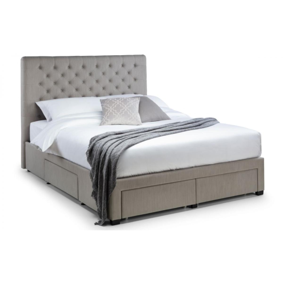 The Julian Bowen Wilton Deep Button 4 Drawer Bedframe is a stunning blend of luxury, practicality, and modern design. Upholstered in soft grey linen, this elegant bedframe features a deep-buttoned, padded headboard that exudes sophistication while providing a comfortable backrest for reading or relaxing. Designed with functionality in mind, it boasts four spacious storage drawers, seamlessly integrated into the base, making it ideal for keeping bedding, clothing, or other essentials neatly stored away. The sturdy wooden frame and sprung slatted base ensure enhanced comfort and long-lasting durability, making this bed both stylish and practical. Mattress not included Key Features: Elegant Design – Deep-buttoned headboard for a timeless, sophisticated look Soft Upholstery – Finished in high-quality grey linen fabric for a luxurious feel Ample Storage – Four large under-bed drawers for convenient storage Sturdy & Durable – Solid wooden frame for long-lasting support Enhanced Comfort – Sprung slatted base for improved mattress support and a restful sleep Dimensions: Double: Height 130cm Width 150cm Length 207cm King: Height 130cm Width 160cm Length 215cm Super King: Height 130cm Width 190cm Length 215cm N.B. All mesurements are approximate. All screens vary in colour reproduction and whilst every effort has been made to display the colour as accurately as possible it is for guidance only