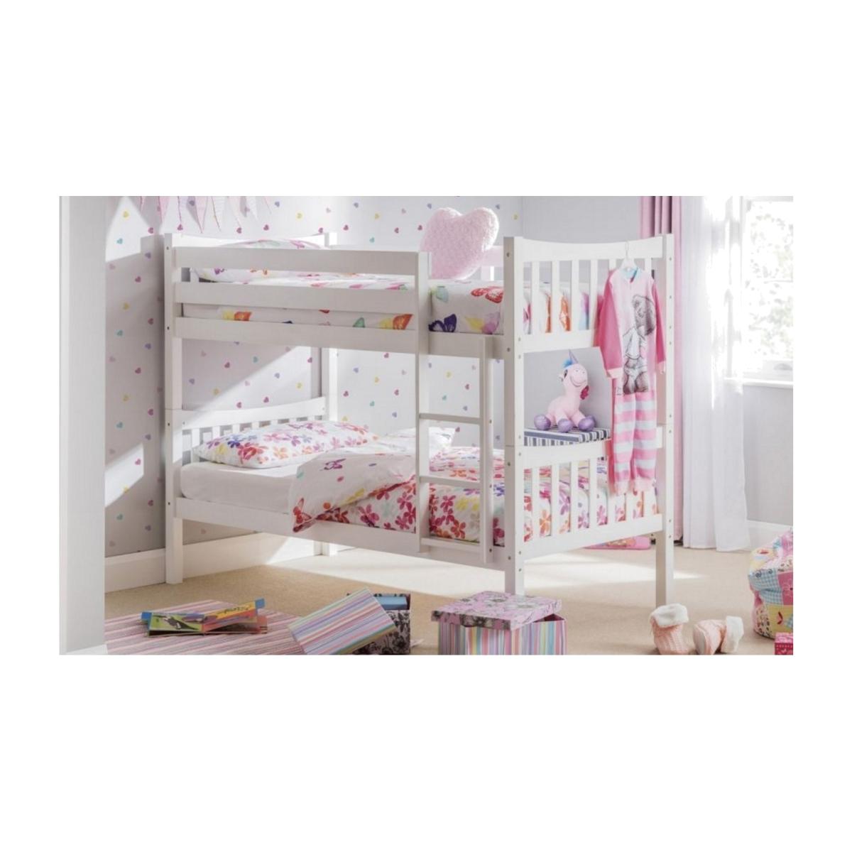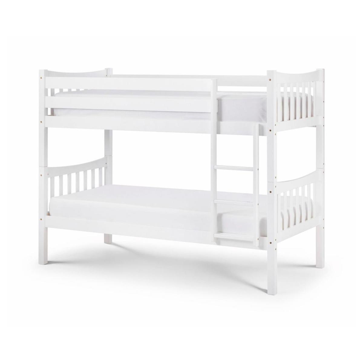 Dimensions. W201 x D103 x H154cm Product Description The Zodiac is a highly versatile bunk bed finished in a brilliant white lacquer which will match any style of decor. Beautifully designed with a subtle attractive curve in matching head and footboards this practical bunk splits down easily into two identical single beds if required. Zodiac's solid construction features high side rails and a robust ladder while the overall footprint is cleverly compact to ensure maximum use of space in smaller bedrooms. Features. Includes the bunk bed frame only. Durable bright white lacquered finish. Conforms to BS EN 747 2012 Safety Standards. Accepts 2 standard UK single mattresses (3ft/90x190cm)Mattresses not included. Minimum age for top bunk 6 years. Minimum age for bottom bunk 4 years. Distance from floor to top of ladder - 154 cm..