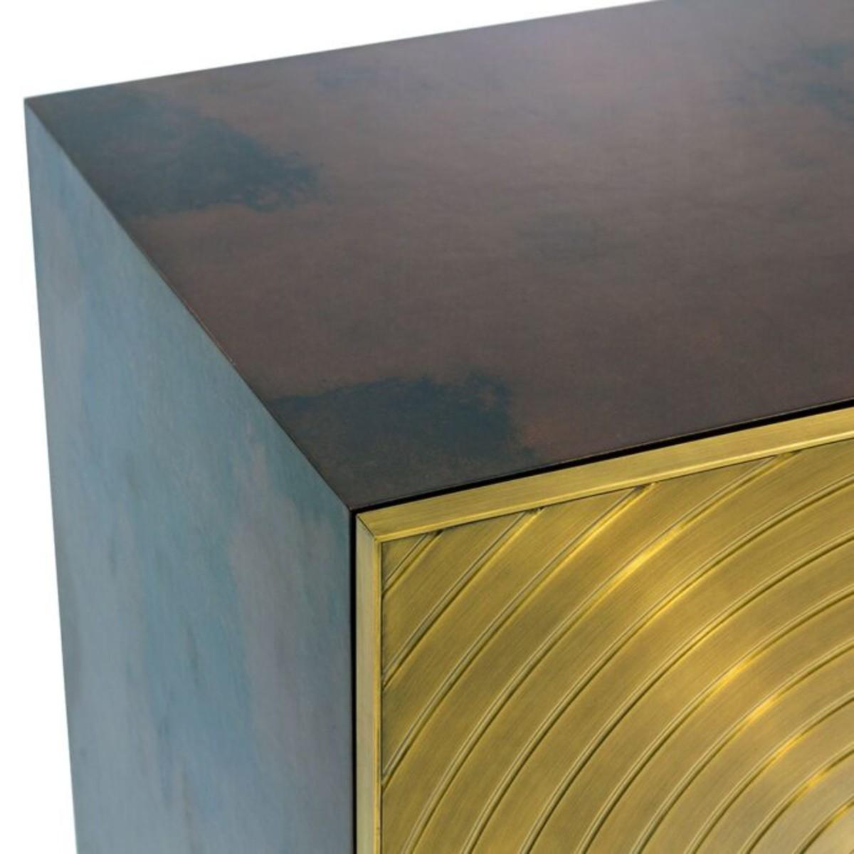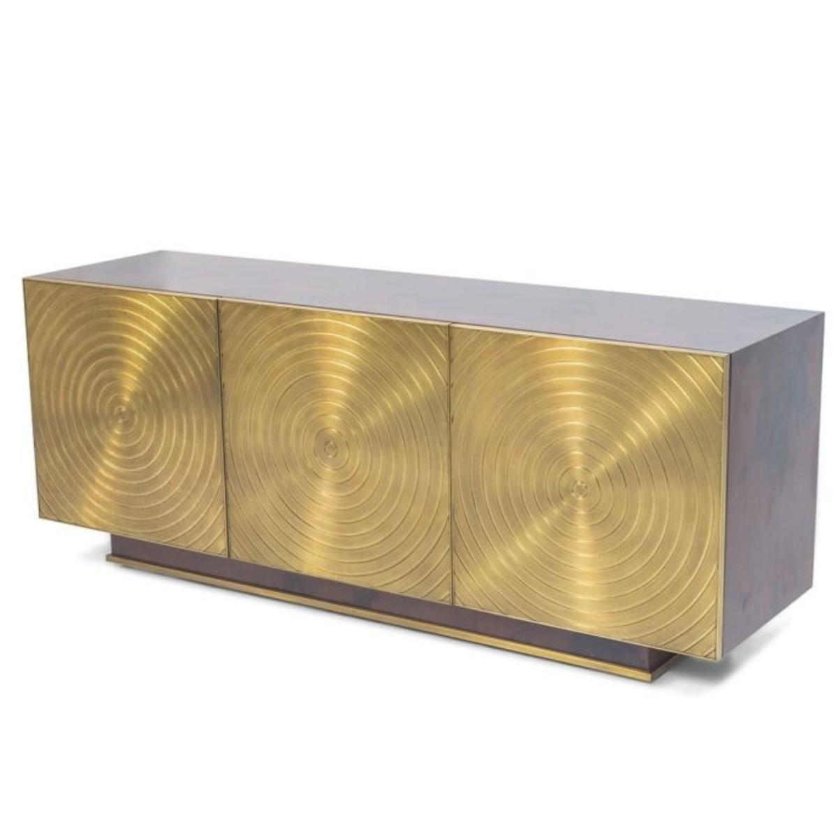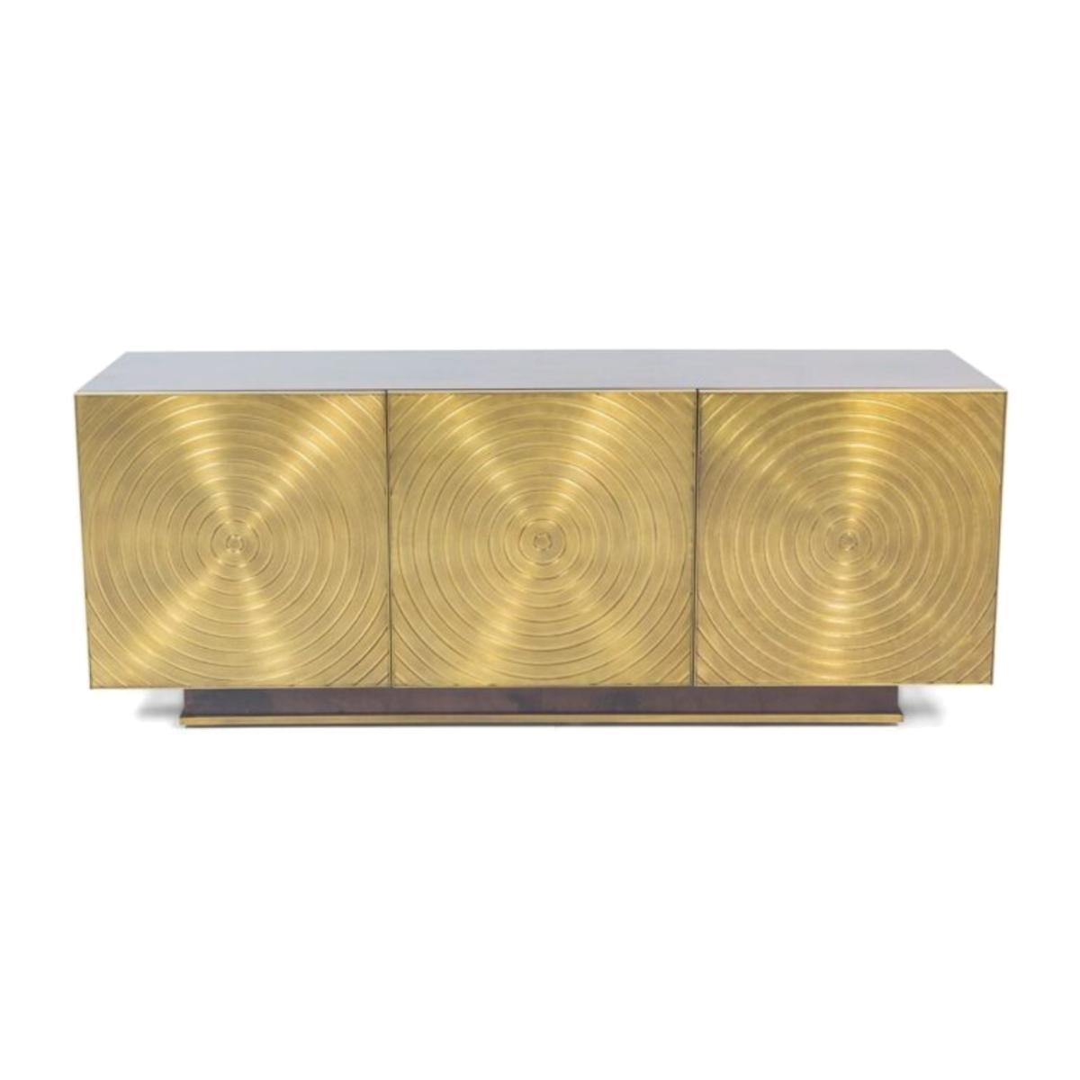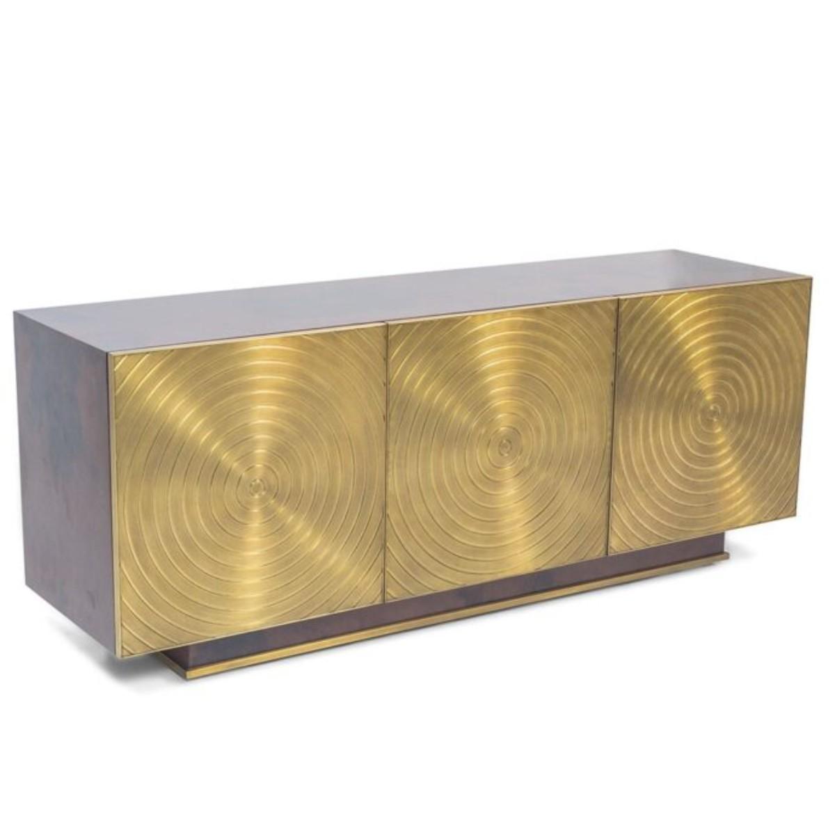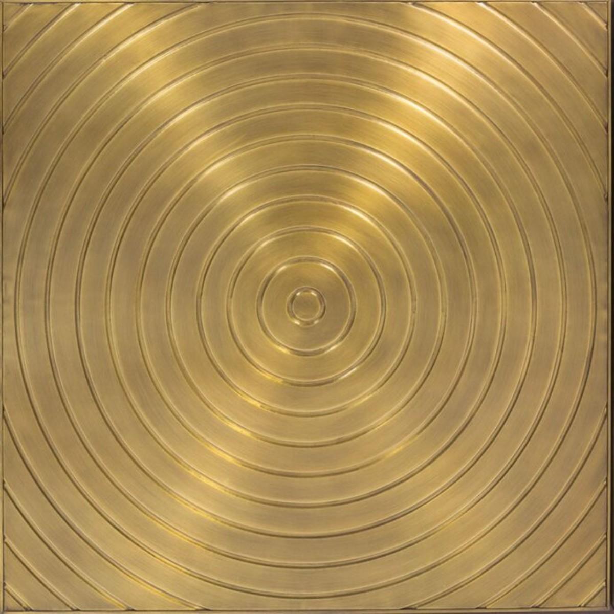Raised concentric circles of Aged Brass or Variegated Nickel on the door panels, dramatically contrast against the Variegated Dark Brown Vellum or Light Grey/Brown Vellum respectively. Brass wrap is a hand applied finish which is applied and beaten by hand. As a result, the finish is unique in both appearance and texture. Vellum is a natural skin with no two pieces exactly alike, therefore variation in shade and tone along with physical characteristics are inevitable and may change over time.