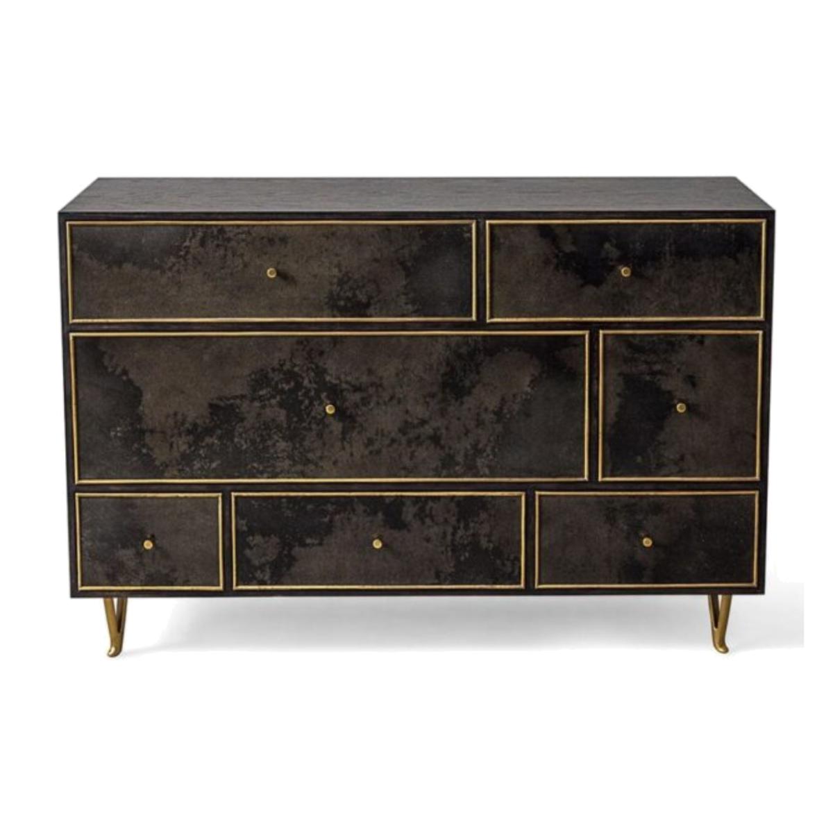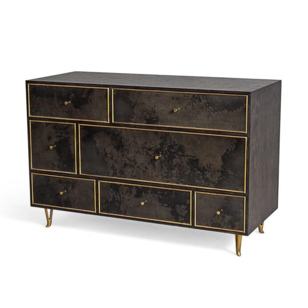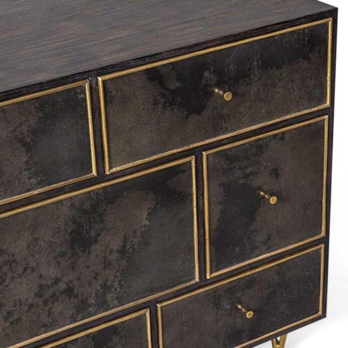 A beautiful chest with multiple spacious drawers. Available with Black Vellum drawers, a Dark Smoked Oak body, and contrasting Brass drawer frames. Brass is a hand applied finish which is moulded and beaten by hand. As a result, the finish is unique in both appearance and texture. Vellum is a natural skin with no two pieces exactly alike, therefore variation in shade and tone along with physical characteristics are inevitable and may change over time.