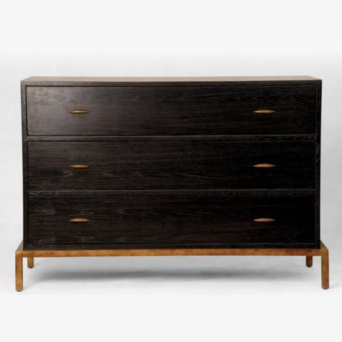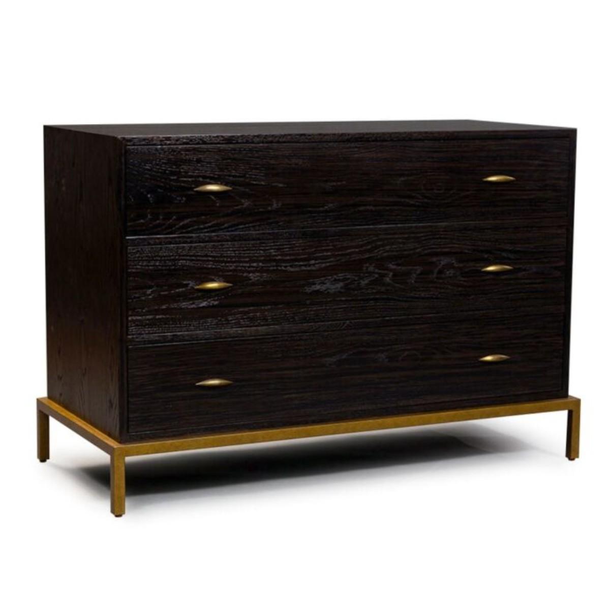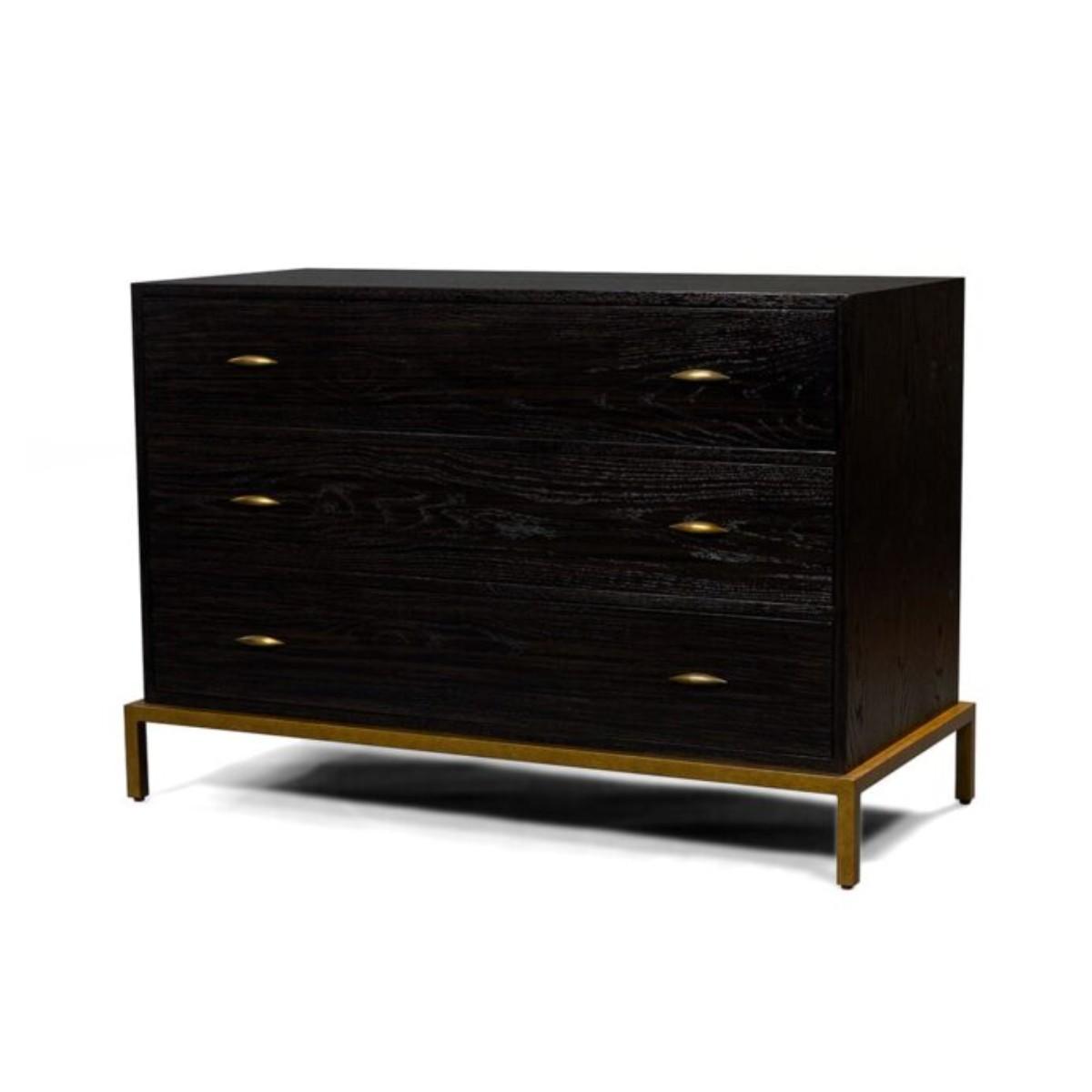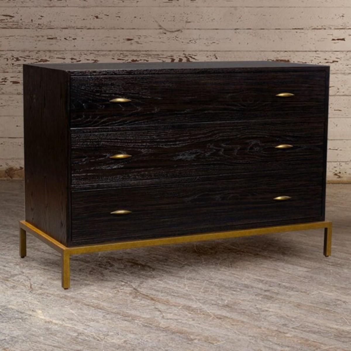 A subtle Ebonised Oak stained box 3-drawer chest on simple gilded steel legs.