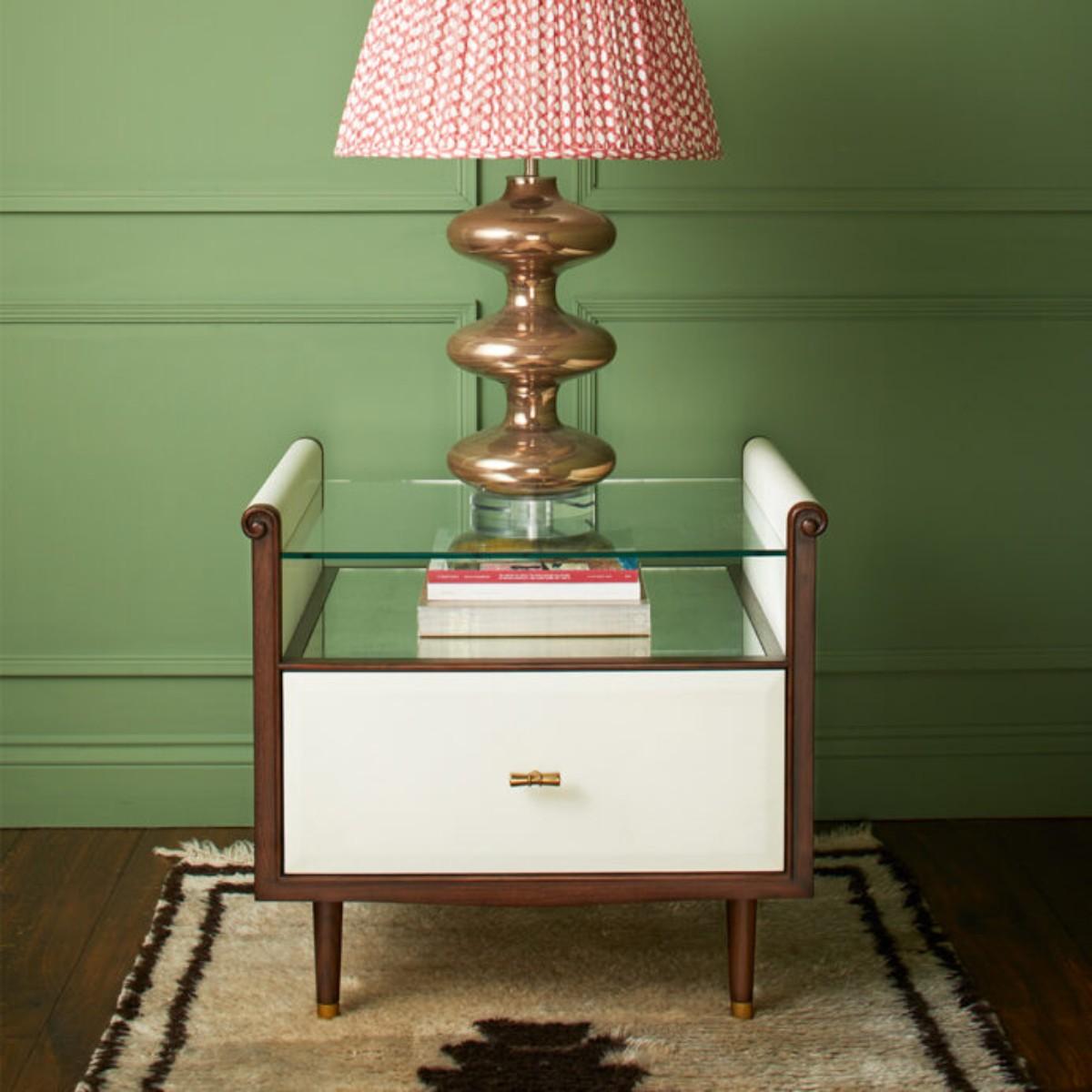 I’m a fan of the Hepburn bedside for its clean lines and the clever mix of lacquered MDF, brass accents and a smoked glass shelf - it instantly lifts a scheme without feeling overbearing. It sits happily in both contemporary and mid-century inspired bedrooms, as well as pared-back Scandi or minimalist spaces where its simple silhouette can really shine. For styling, keep the top surface uncluttered: a slim-profile lamp, a small stack of design books and a low glass vase or ceramic bowl will do the job. Tuck a scented candle or a sleep mask in the drawer, and use the glass shelf for a framed photo or your current read - this creates a sense of organised calm and adds visual interest without crowding the top.