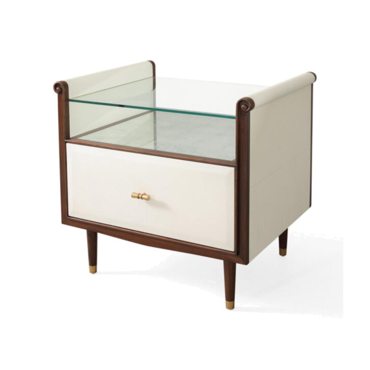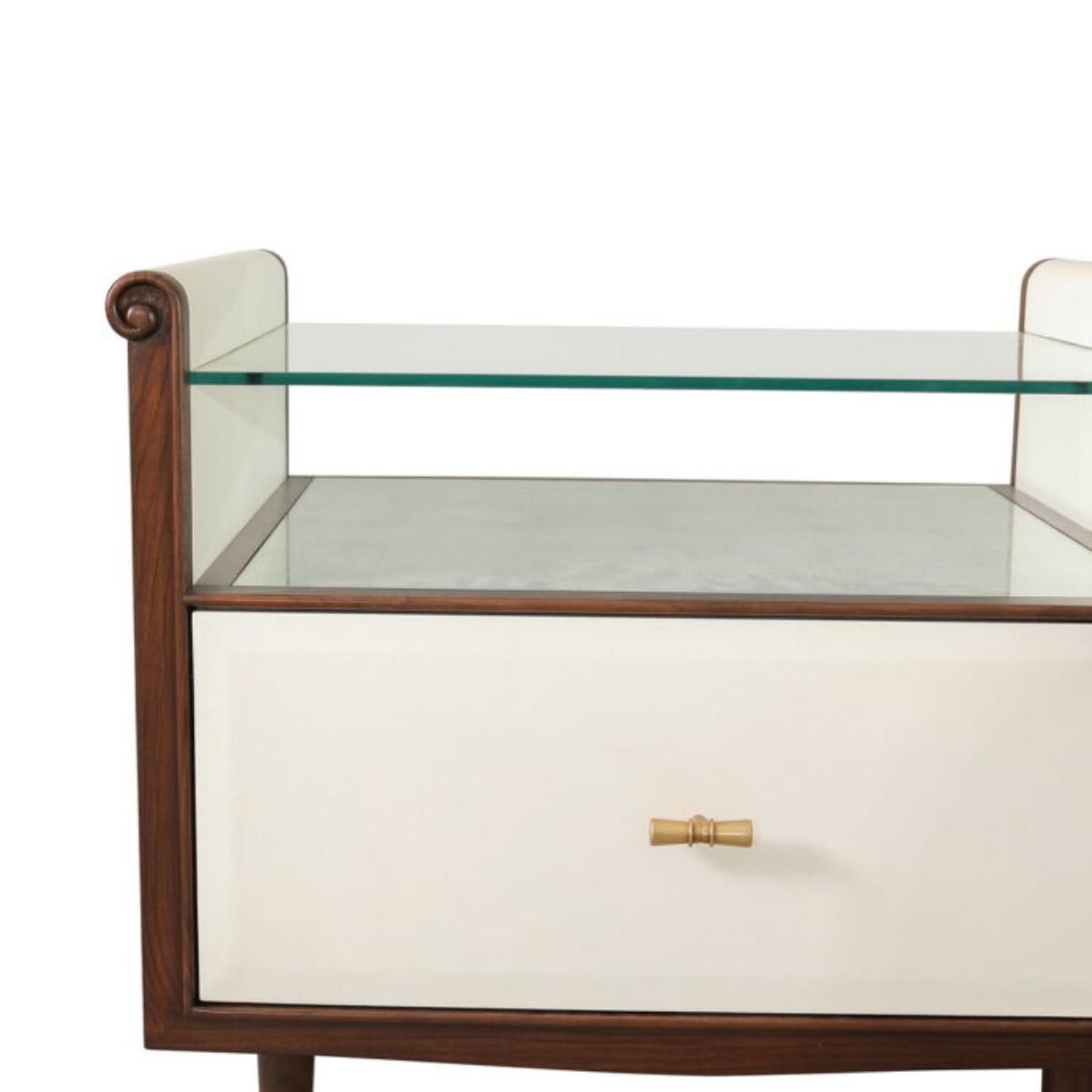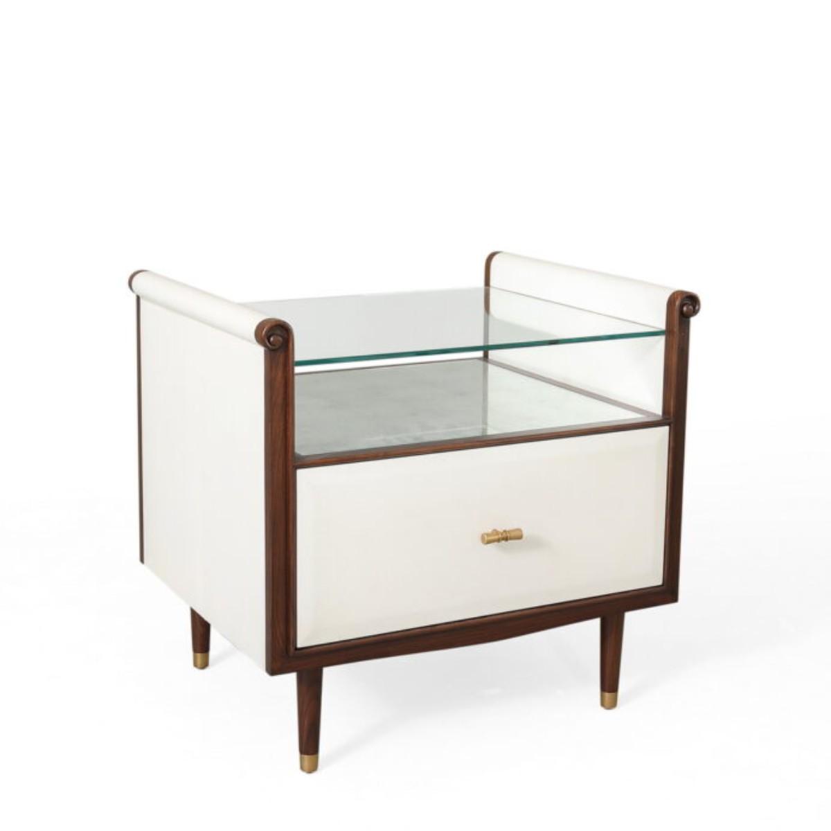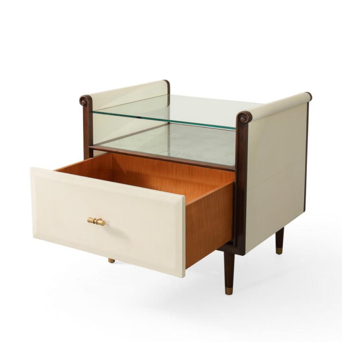 A pretty, single drawered Vellum clad bedside table with Rosewood legs and Aged Brass detail. The Hepburn Bedside by Julian Chichester has a top with scrolled sides, which supports a toughened glass top that rests above a Verre Eglomisé insert.
