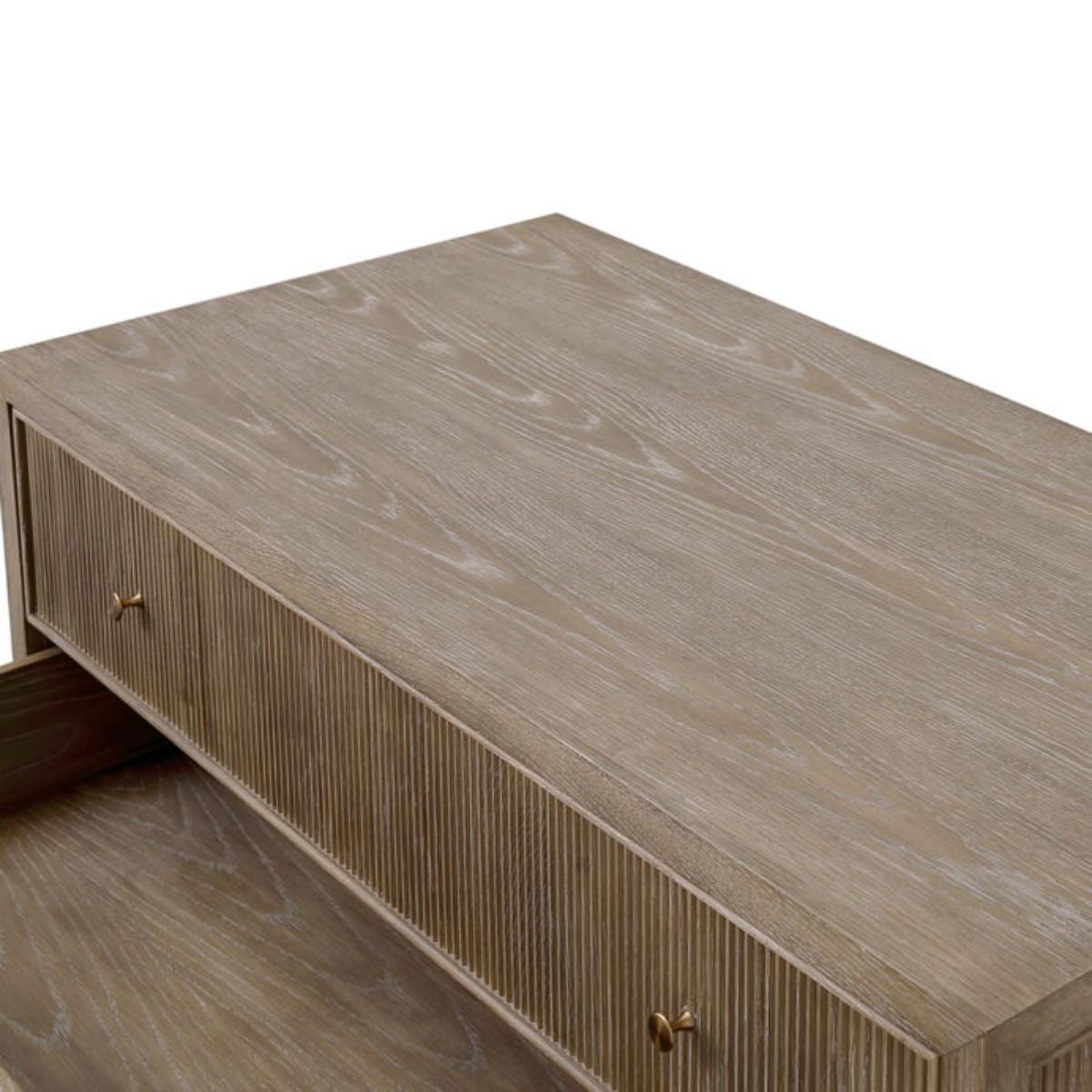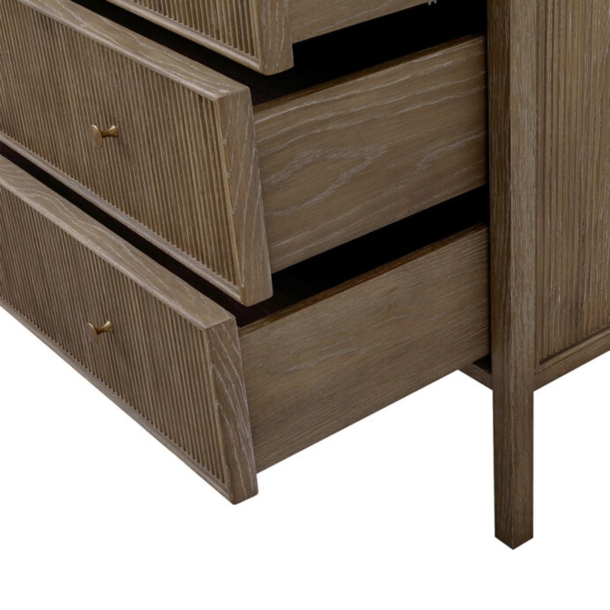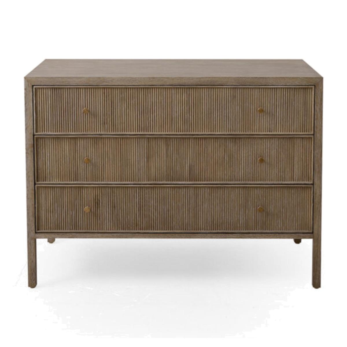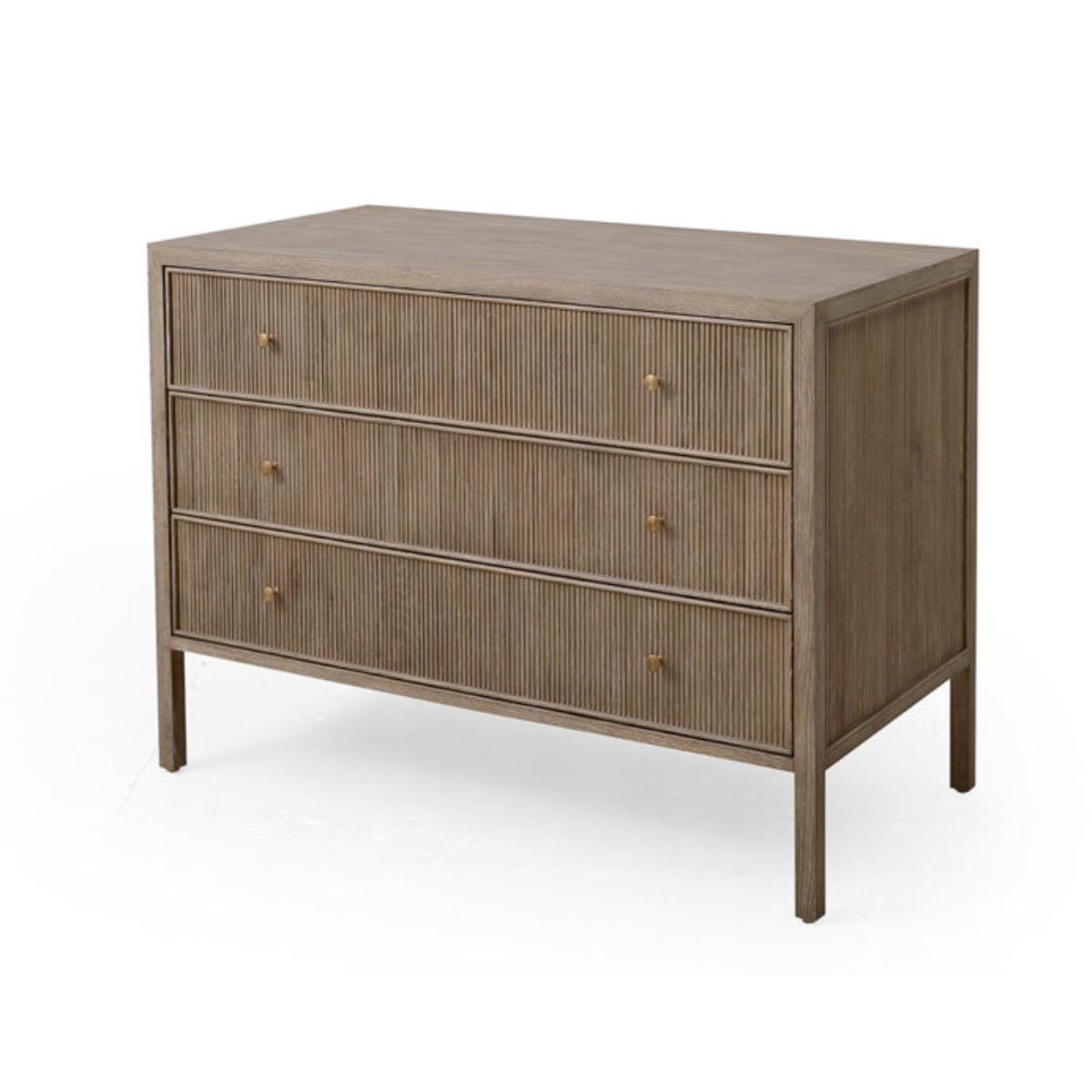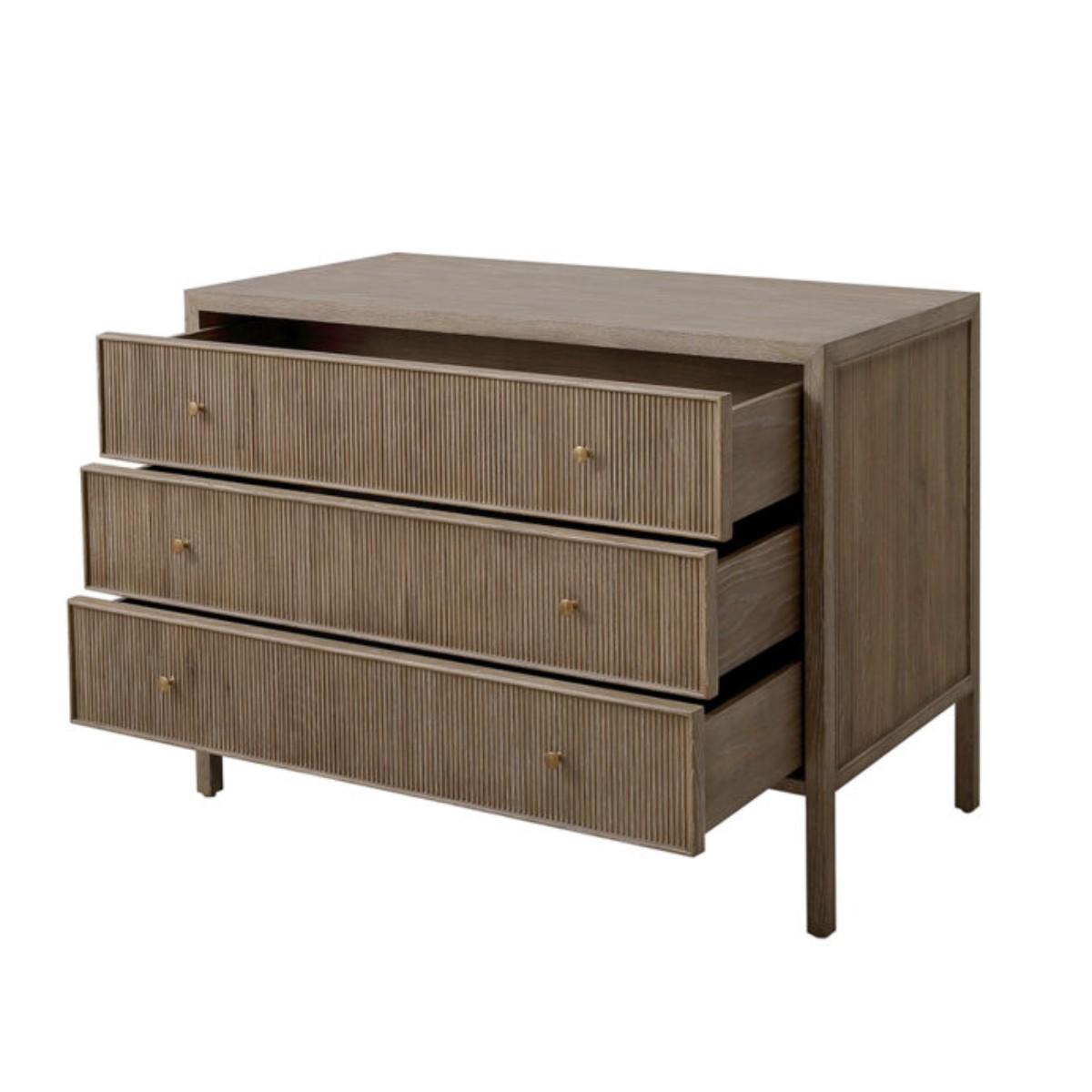 Modelled after a Bedside and Desk of the same name, the Jackson Chest is designed by Turner Pocock for Julian Chichester. The design has ample storage with three spacious drawers. The reeding detail provides interest through its decorative channels and ridges. It is available in 2 finishes – Light African Walnut with a contrasting High Gloss Jade Vellum inlay, or Grey White Oak. African Walnut, sometimes referred to as Amazaque, is a beautiful, close grained, stable hard wood which has a finish somewhere between black walnut and Rosewood. African Walnut is sealed and finished by hand using natural Tung Oil, therefore variation in depth of colour is inevitable.