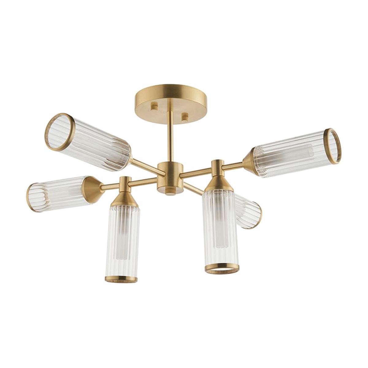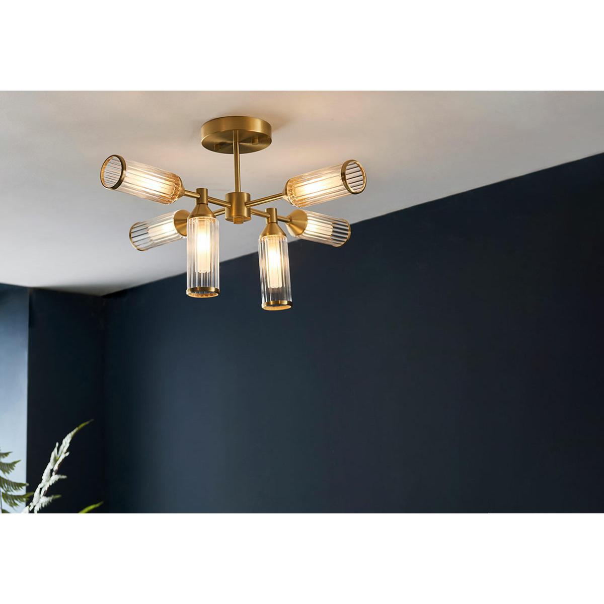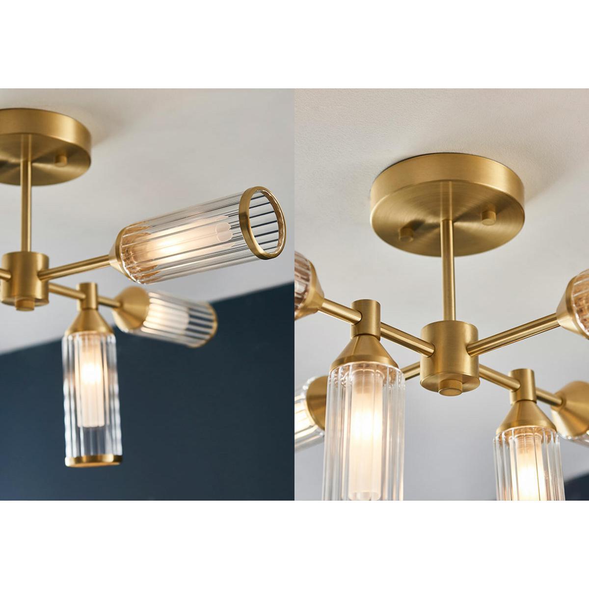 Nothing screams undeniable flair like the Julian lighting range. Taking inspiration from gold-rimmed vintage cocktail glasses, this range takes antique elegance and modernises it, resulting in an unquestionably unique design. Six ribbed glass lampholders are framed with a rich brushed brass in this spectacular semi-flush ceiling light. Perfect in dining areas, living rooms and grand entrances, this light adds a dash of zesty confidence to any space.