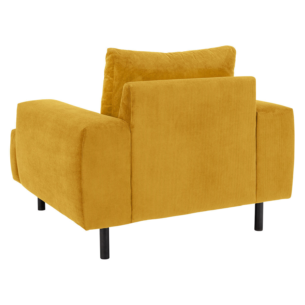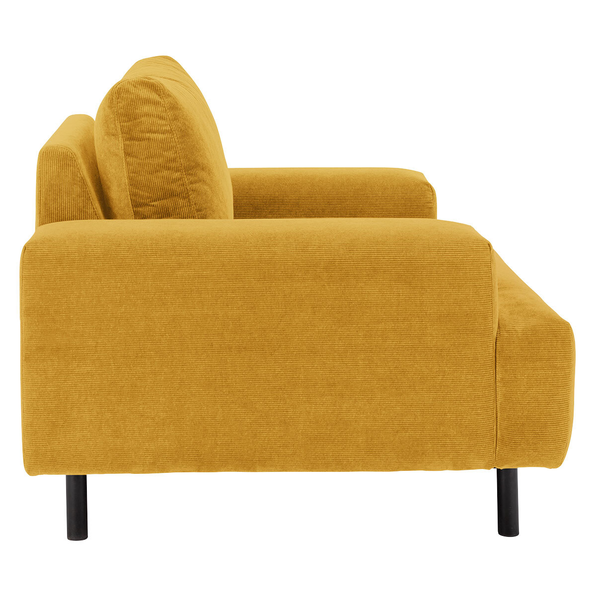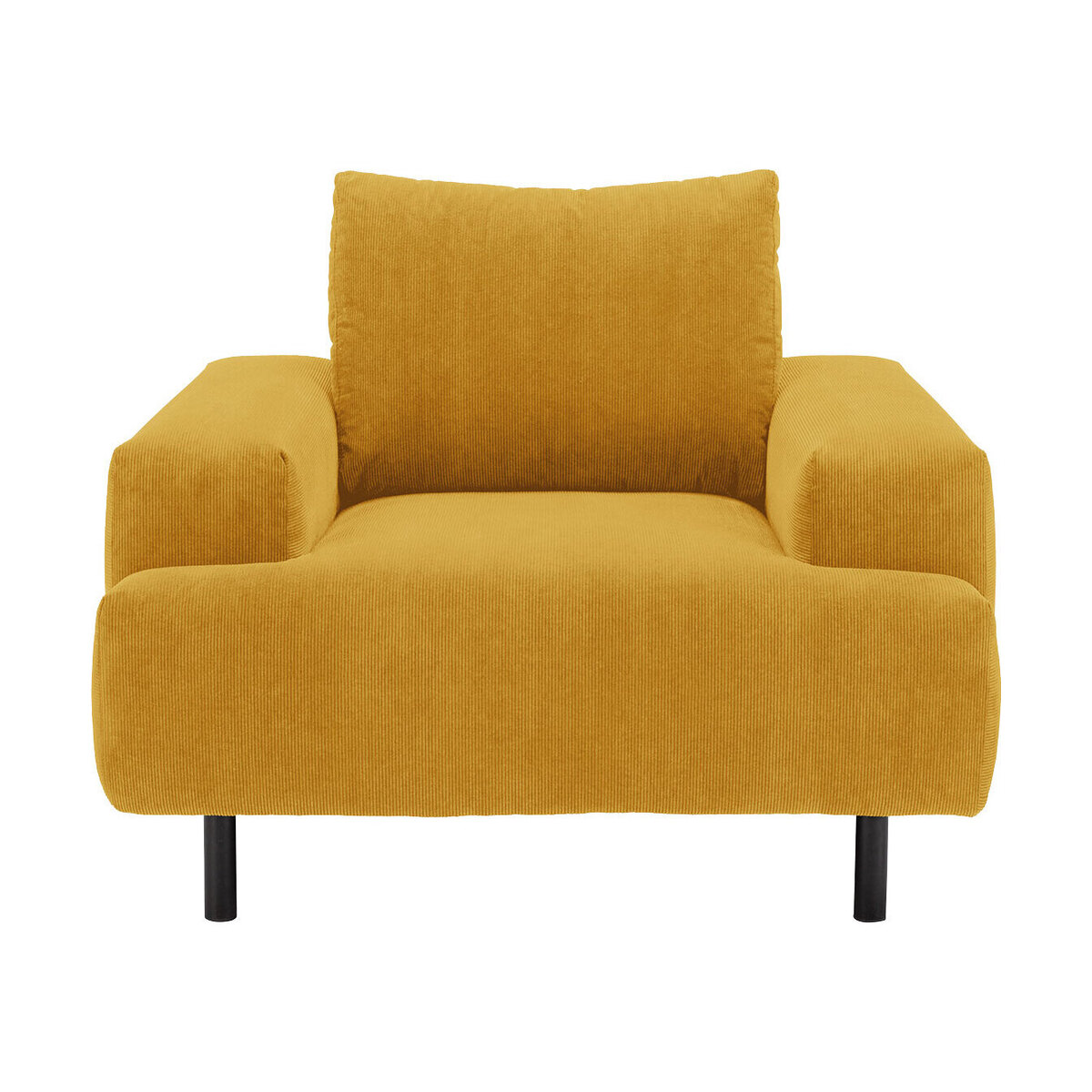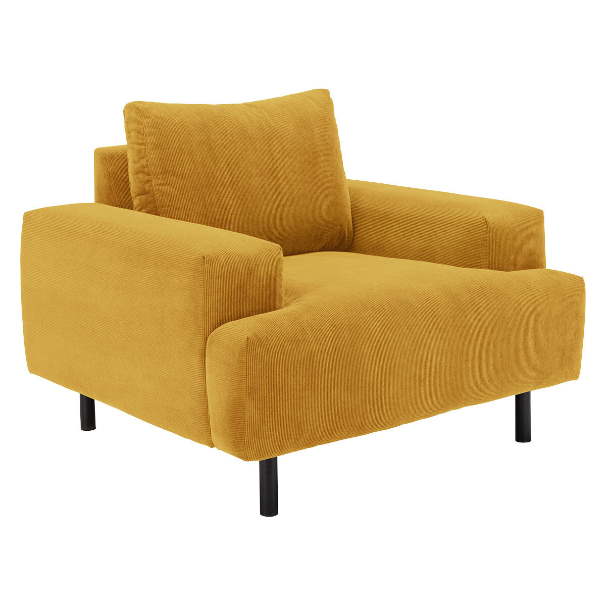 Exclusive to Habitat, the Julien yellow cord fabric armchair combines generous proportions with wide arms for a comfortable sit. Its boxed shape is finished with foam filled t-shaped cushions for a firm sit and pillow-like, feather-wrapped foam back cushions for support. It’s finished with oversized black metal legs. Julien is available in other sizes colours and fabrics. Before making your decision be sure to read our Sofa Measuring Guide to ensure this sofa will fit into your home.