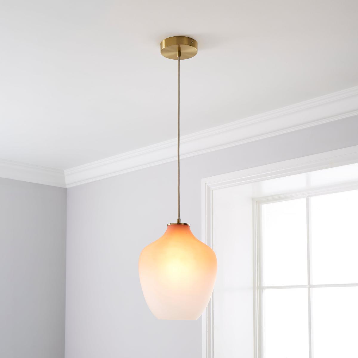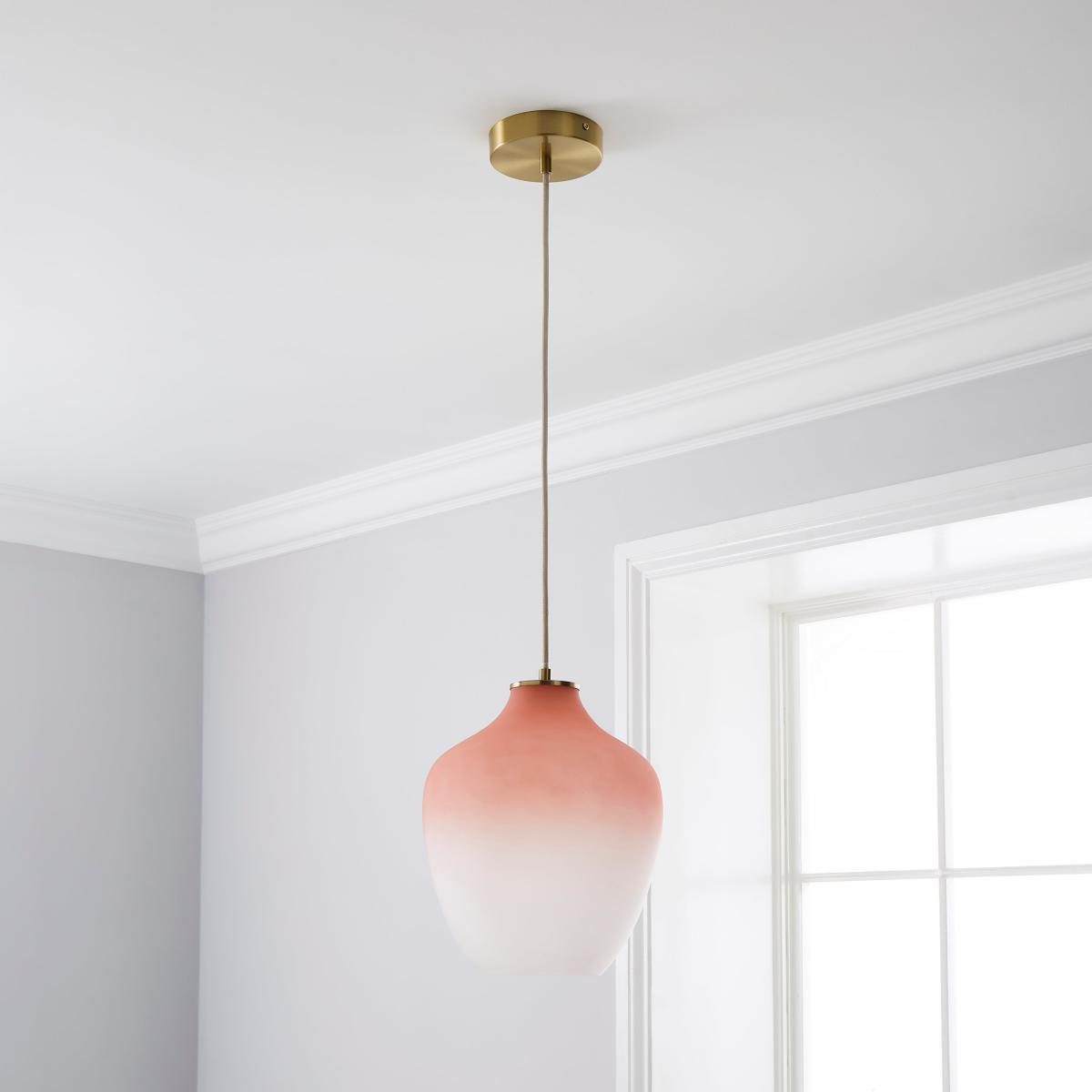 Featuring a gorgeous pink ombre shade, the Juliet 1 Light Pendant Ceiling Fitting would make a stunning addition to any home. Designed with a beautiful satin brass finish base and a grey fabric cable suspension. Coordinate your home with matching family items.