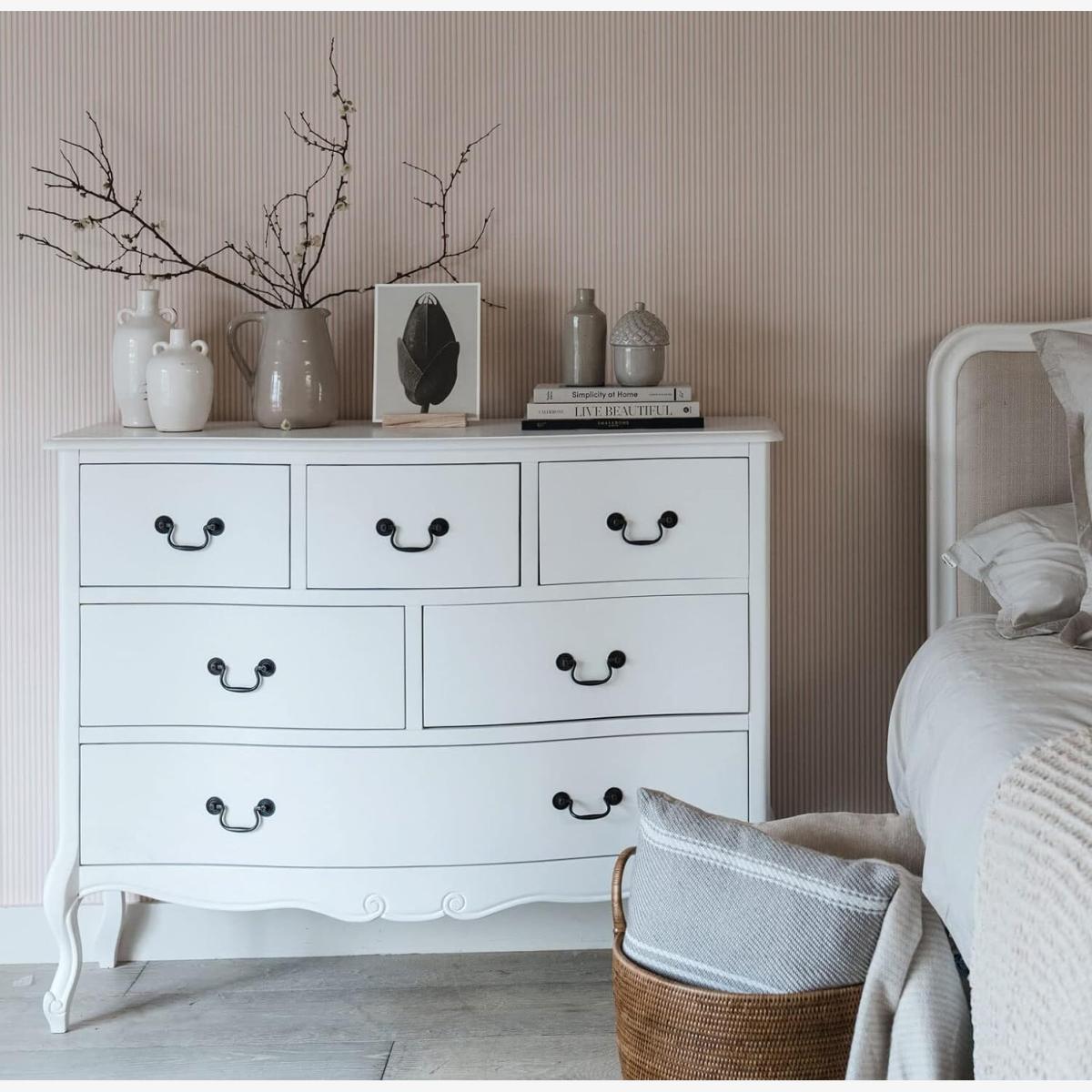 This elegant Juliette French chest of drawers makes a stunning addition to any bedroom or living space. Crafted from wood with a warm white or champagne finish, it features six spacious drawers for neatly storing clothing, linens or other belongings. The drawers glide open smoothly on wooden runners for easy access. This chest is a beautiful accent piece that brings timeless style to both traditional and modern interiors. It is available with your choice of either delicate metal swan handles or glittering diamond-shaped crystal handles. Measuring W120cm x D40cm x H96cm, it provides ample storage while complementing your decor. Expertly hand finished, this fully assembled chest is sure to become a cherished heirloom for years to come. More item from Juliette Bedroom furniture collection is available.