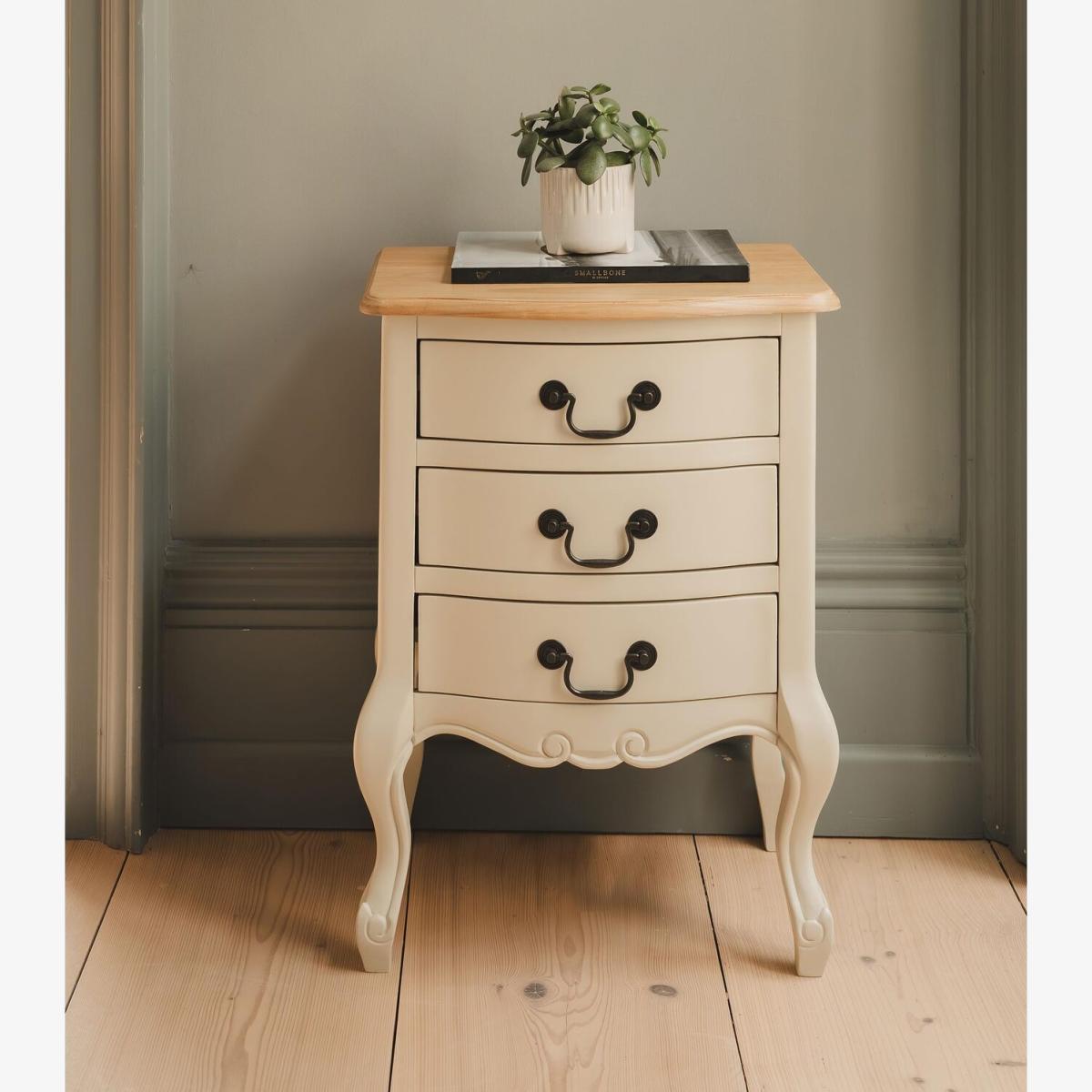 This elegant Juliette Bedside Table is a beautiful addition to any bedroom. With its French country style design featuring carved legs and choice of metal swan or crystal diamond handles, it brings a touch of classic sophistication. Available in a crisp white or subtle champagne colour, this bedside cabinet will complement a variety of decor styles. Featuring three spacious drawers, it provides ample storage for bedside essentials like books, phones, glasses and more while maintaining an understated profile. Crafted from durable materials, it is fully assembled for easy placement beside the bed. Measuring 48cm wide x 35cm deep x 66cm tall, the Juliette Bedside Table is sized perfectly for most bed frames. This elegant Juliette Bedside Table is a beautiful addition to any bedroom. With its French country style design featuring carved legs and choice of metal swan or crystal diamond handles, it brings a touch of classic sophistication. Available in a crisp white or subtle champagne color, this bedside cabinet will complement a variety of decor styles. Featuring three spacious drawers, it provides ample storage for bedside essentials like books, phones, glasses and more while maintaining an understated profile. Crafted from durable materials, it is fully assembled for easy placement beside the bed. Measuring 48cm wide x 35cm deep x 66cm tall, the Juliette Bedside Table is sized perfectly for most bed frames.